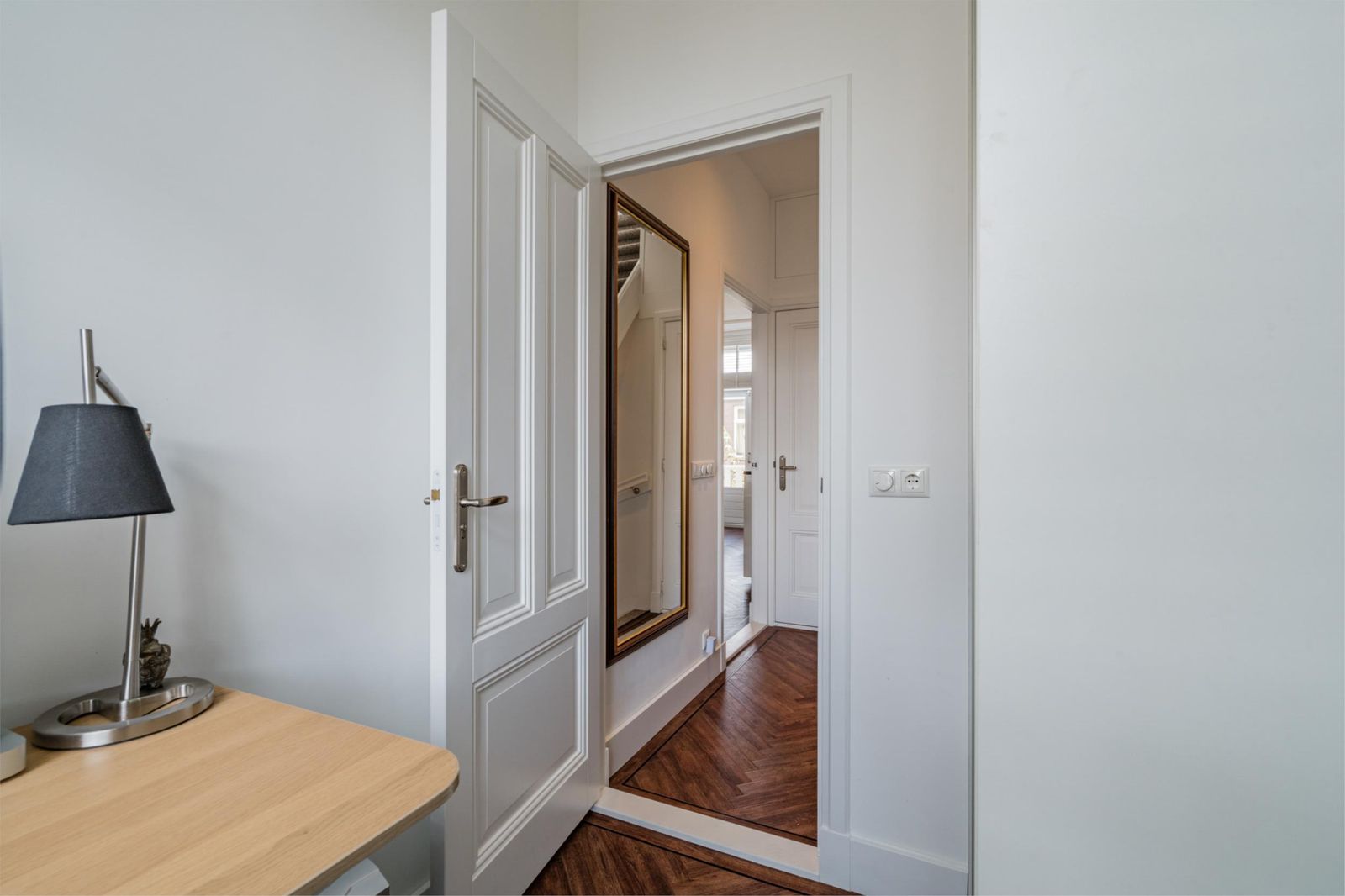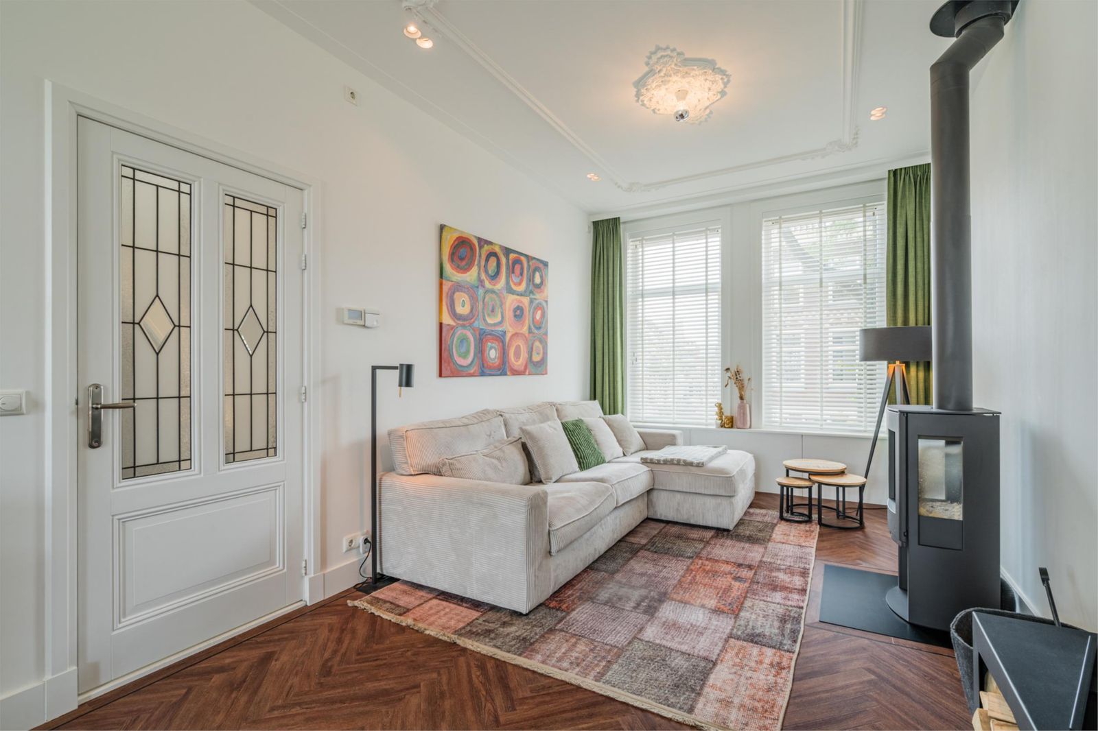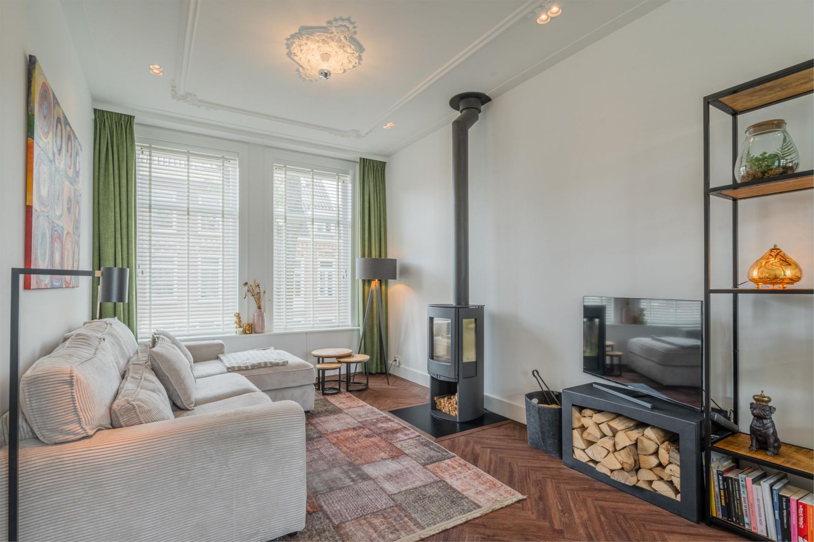 Landing with staircase, toilet, study with beautiful unobstructed views and access to the living room and open kitchen with cooking island. The kitchen is equipped with Siemens refrigerators, freezer, dishwasher, coffee machine, warming drawer, two ovens, one of which is a combi-steam oven, Quooker boiling water tap, AEG induction hob and Novi ceiling extractor. The living room has classic ceiling ornaments and an A-label Dik Geurts wood-burning stove at the front. At the rear, there are French doors to the spacious balcony with outdoor lighting and power socket. The floor is finished with classic brown herringbone parquet flooring made of high-quality Moduleo PVC.