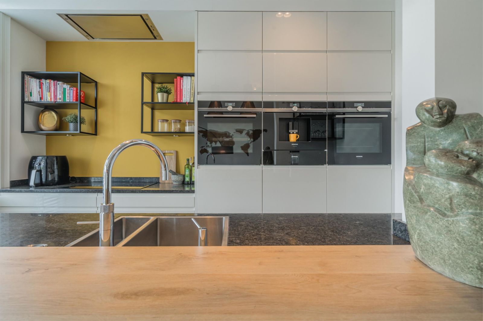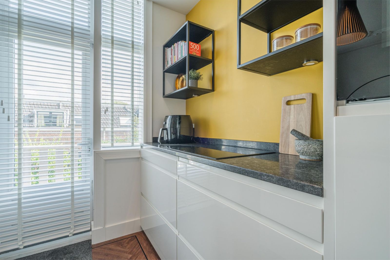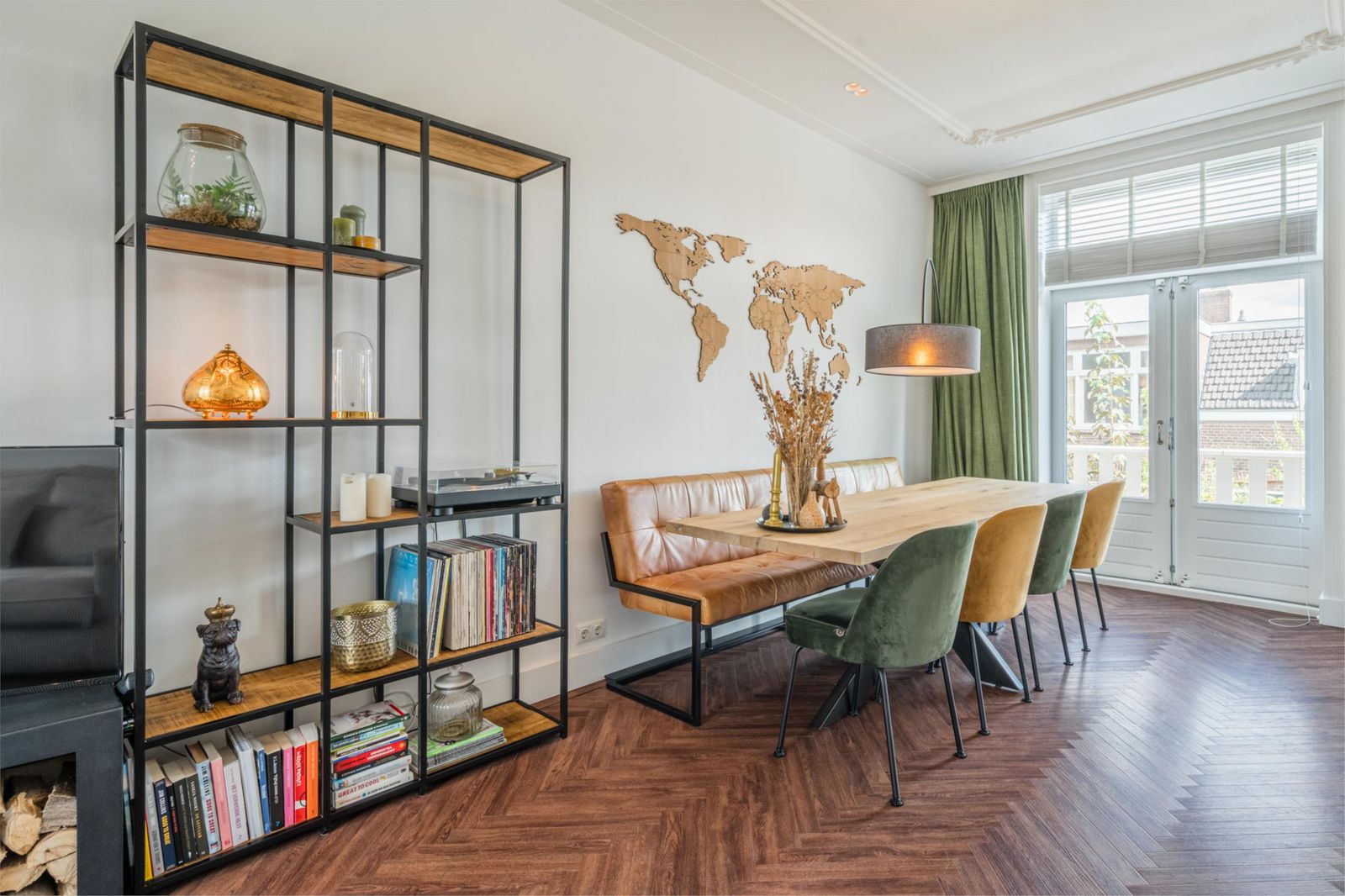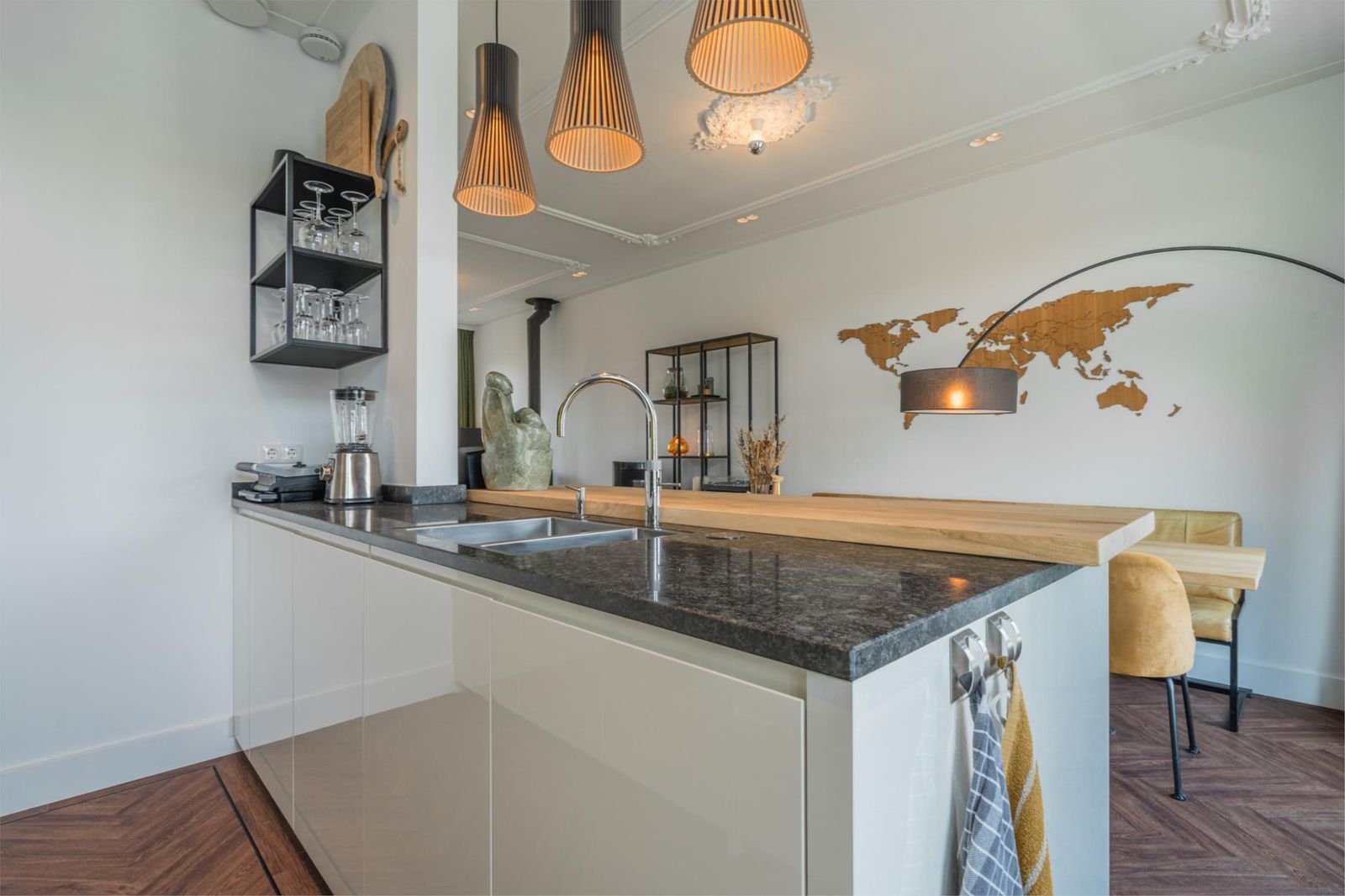 Landing with staircase, toilet, study with beautiful unobstructed views and access to the living room and open kitchen with cooking island. The kitchen is equipped with Siemens refrigerators, freezer, dishwasher, coffee machine, warming drawer, two ovens, one of which is a combi-steam oven, Quooker boiling water tap, AEG induction hob and Novi ceiling extractor. The living room has classic ceiling ornaments and an A-label Dik Geurts wood-burning stove at the front. At the rear, there are French doors to the spacious balcony with outdoor lighting and power socket. The floor is finished with classic brown herringbone parquet flooring made of high-quality Moduleo PVC.