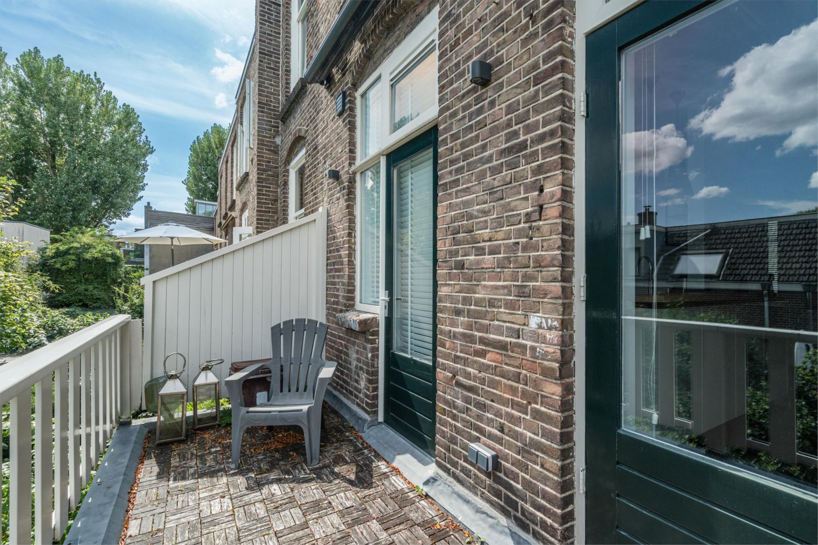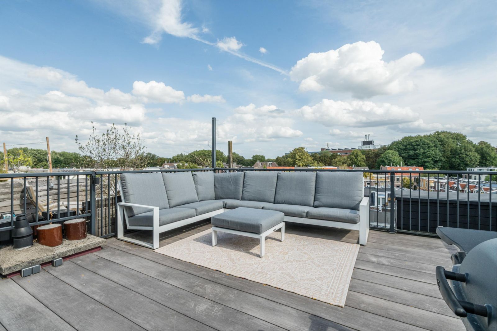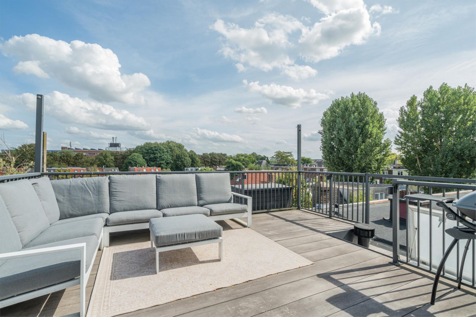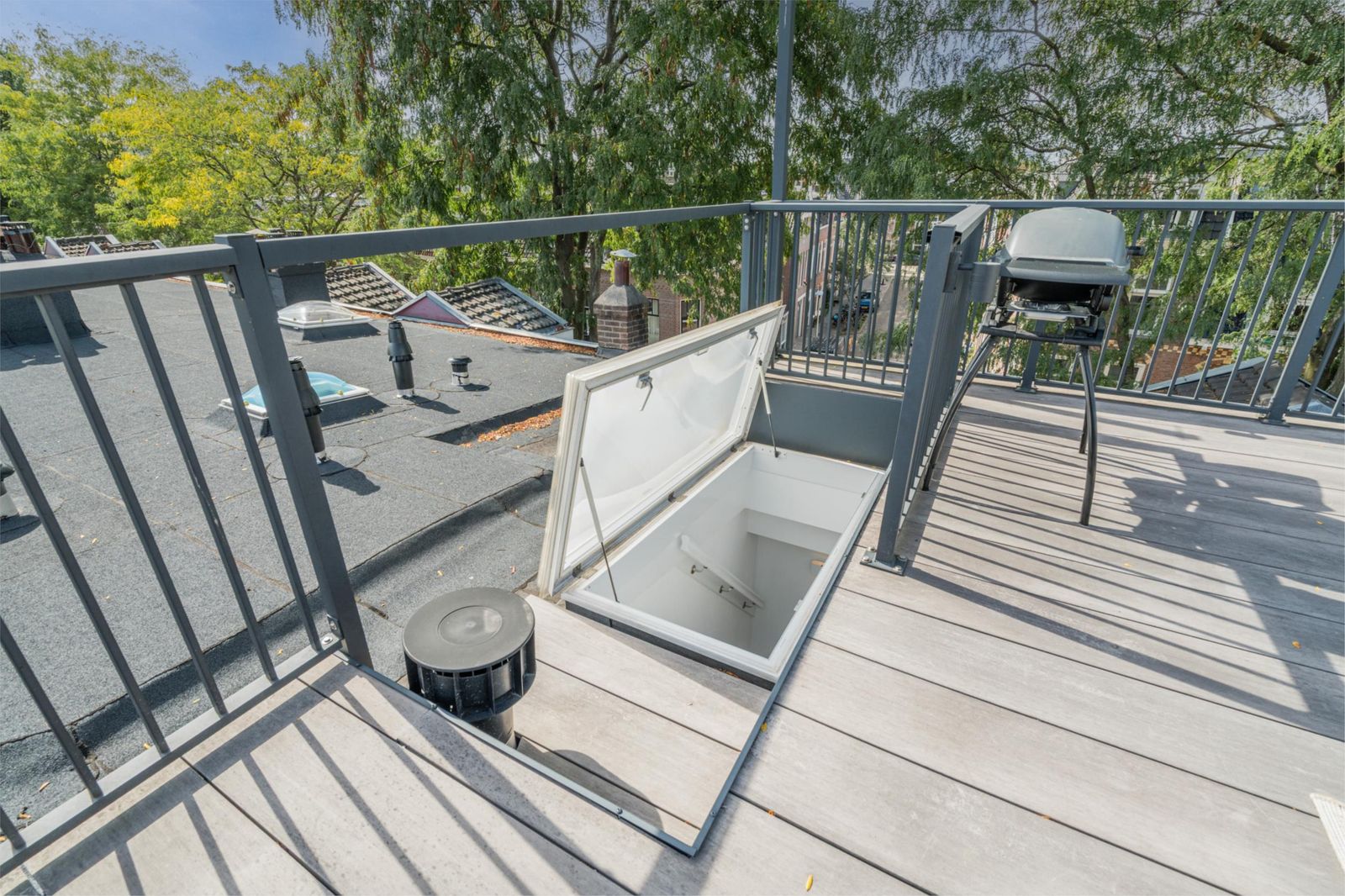 The roof terrace is an oasis of calm in the city and has a magnificent view. In summer, it is wonderfully green thanks to the surrounding trees. The roof terrace has mood lighting and a double socket. There is also a comfortable aluminium lounge sofa for 5 people and two large Keter boxes for storing the cushions during the season. There is also a sunshade that can be easily stretched between the four corner posts using straps. The roof terrace is made of durable and maintenance-free composite "wood" and aluminium fencing.
