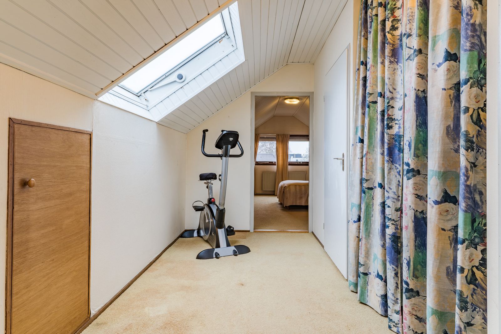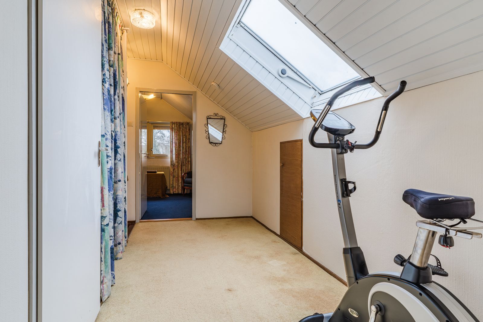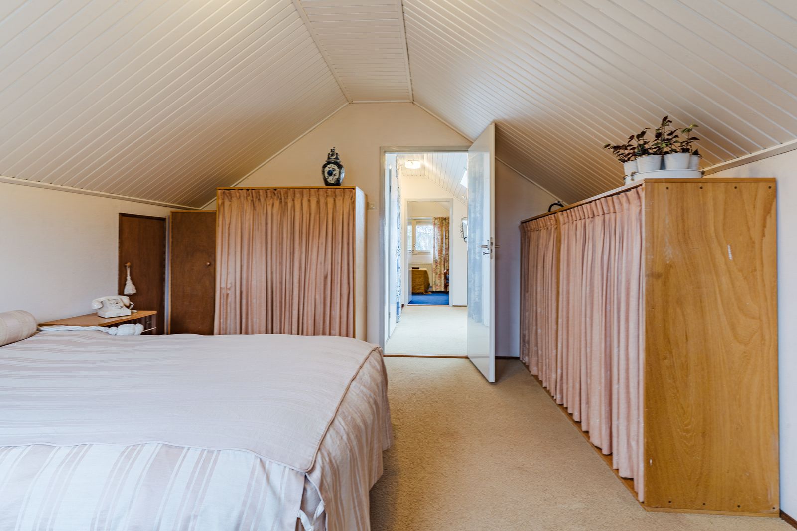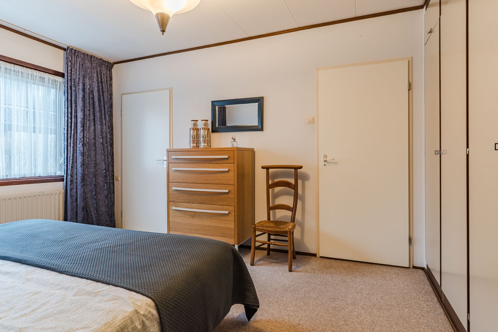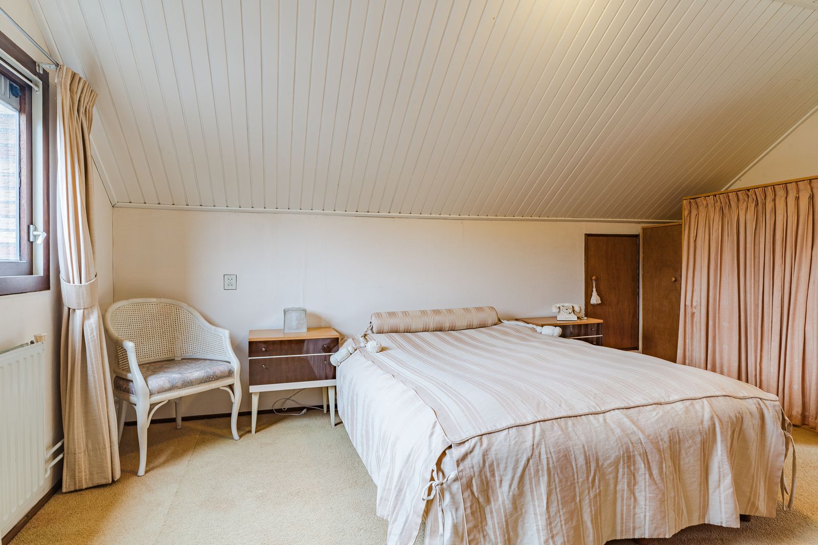 De slaapkamer op de begane grond is royaal en voorzien van een lange wand met vaste kasten. Deze kamer biedt veel privacy en comfort en is ideaal voor wie gelijkvloers wil wonen. De aangrenzende badkamer beschikt over een ligbad, douche, wastafel, toilet en bidet. Hoewel de afwerking gedateerd is, is de ruimte goed van formaat en biedt deze volop mogelijkheden voor modernisering.