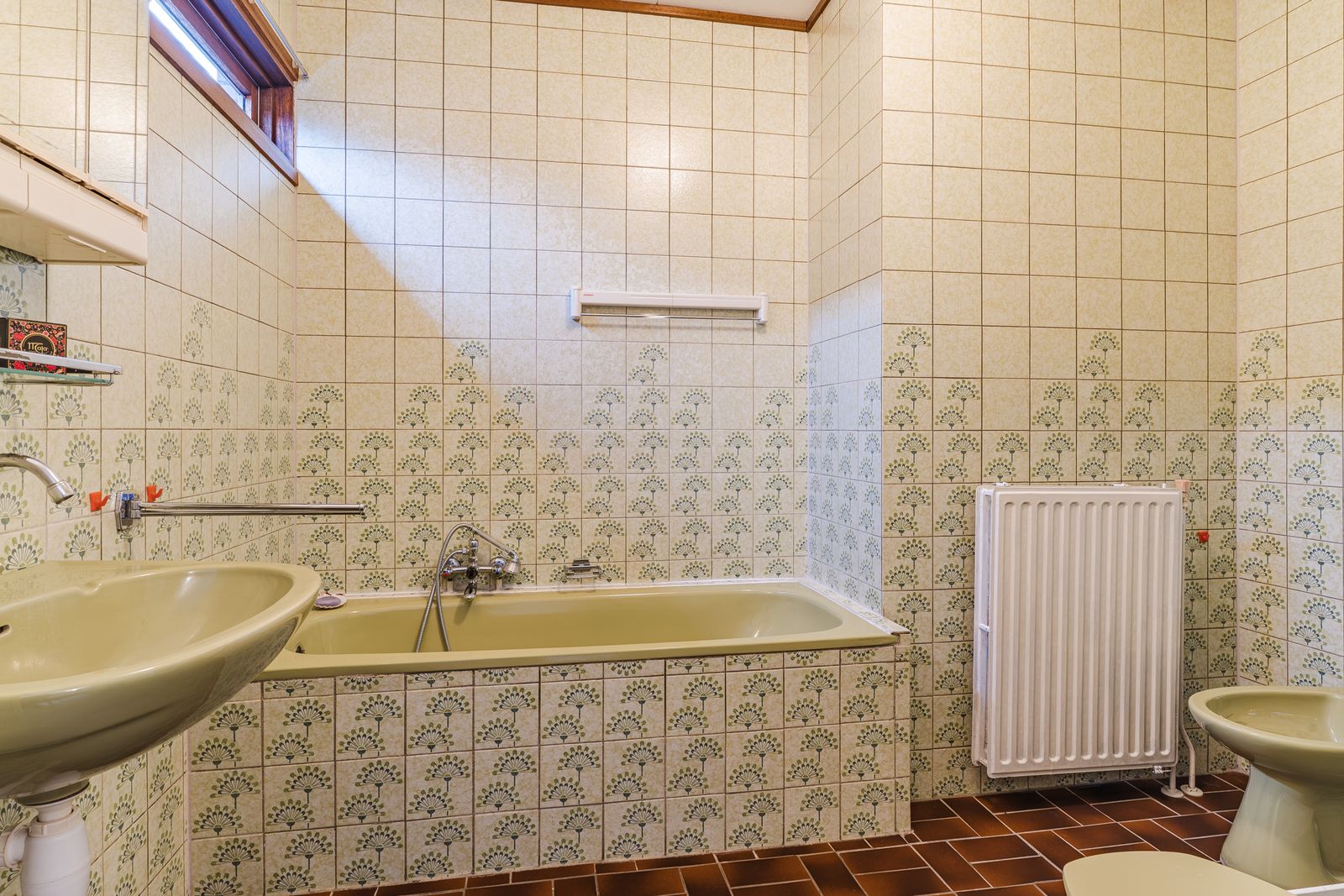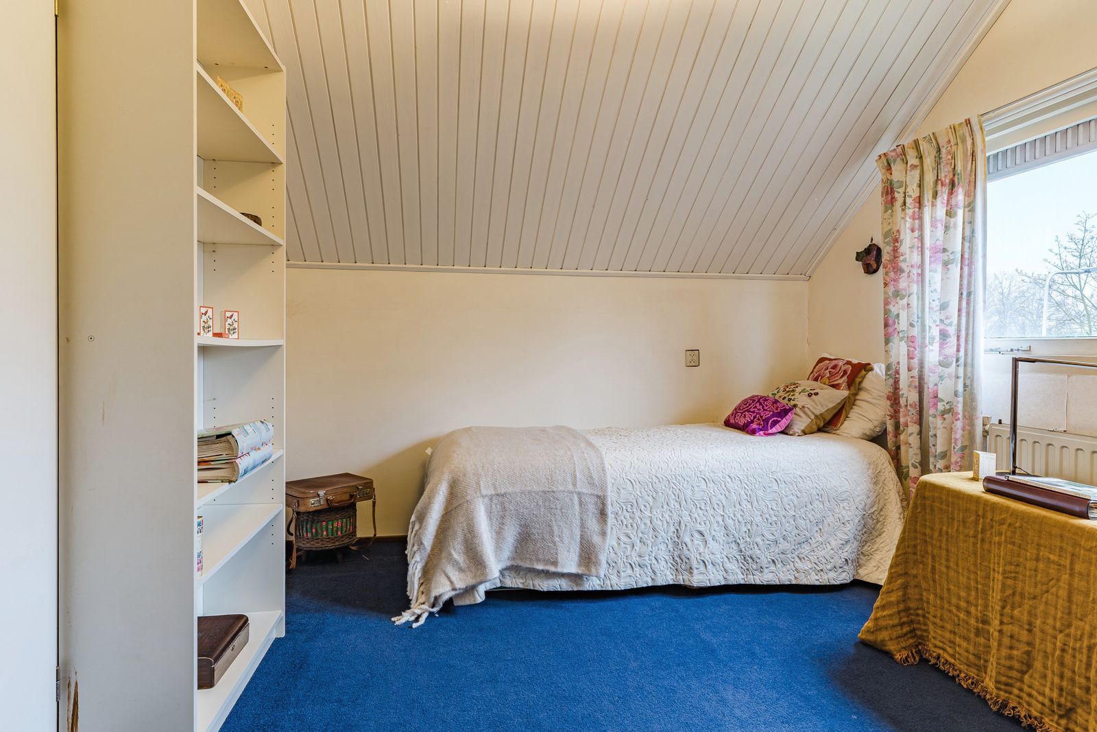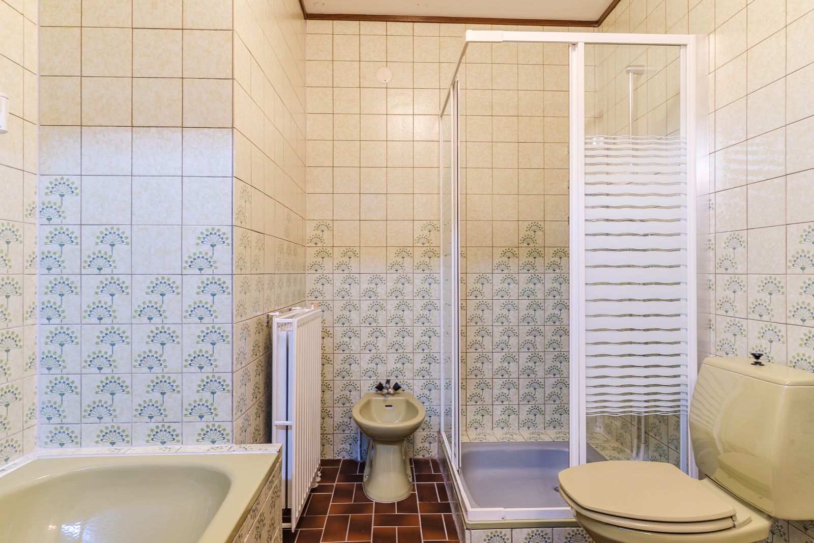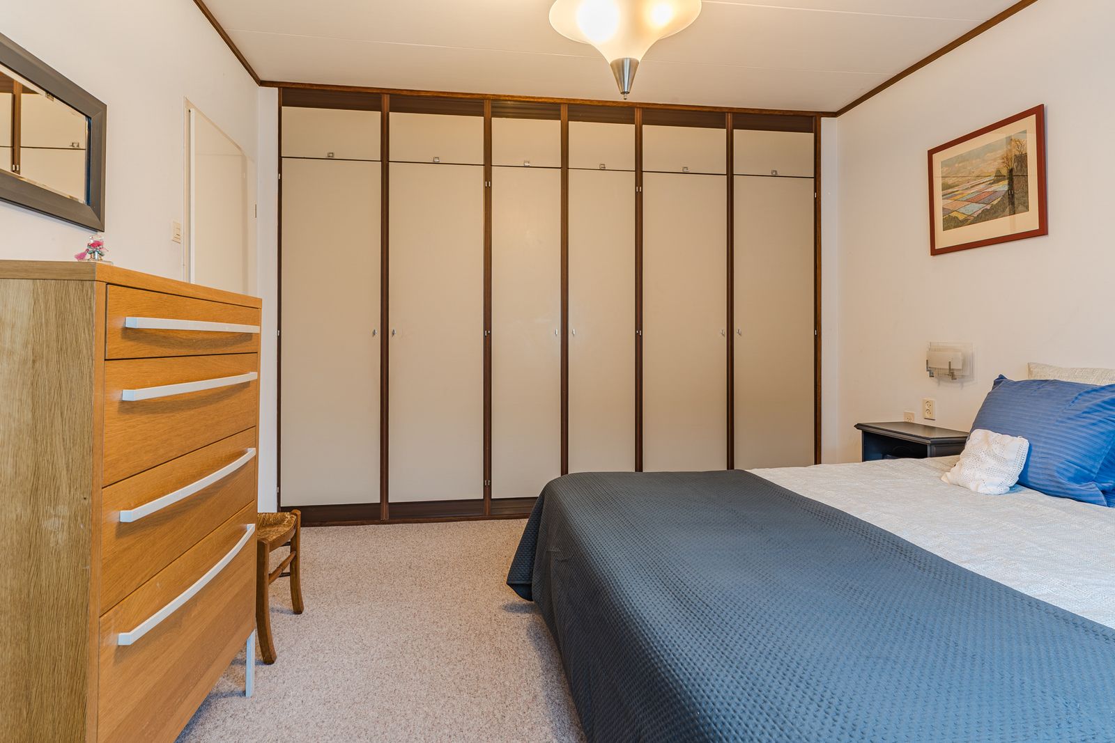 De slaapkamer op de begane grond is royaal en voorzien van een lange wand met vaste kasten. Deze kamer biedt veel privacy en comfort en is ideaal voor wie gelijkvloers wil wonen. De aangrenzende badkamer beschikt over een ligbad, douche, wastafel, toilet en bidet. Hoewel de afwerking gedateerd is, is de ruimte goed van formaat en biedt deze volop mogelijkheden voor modernisering.