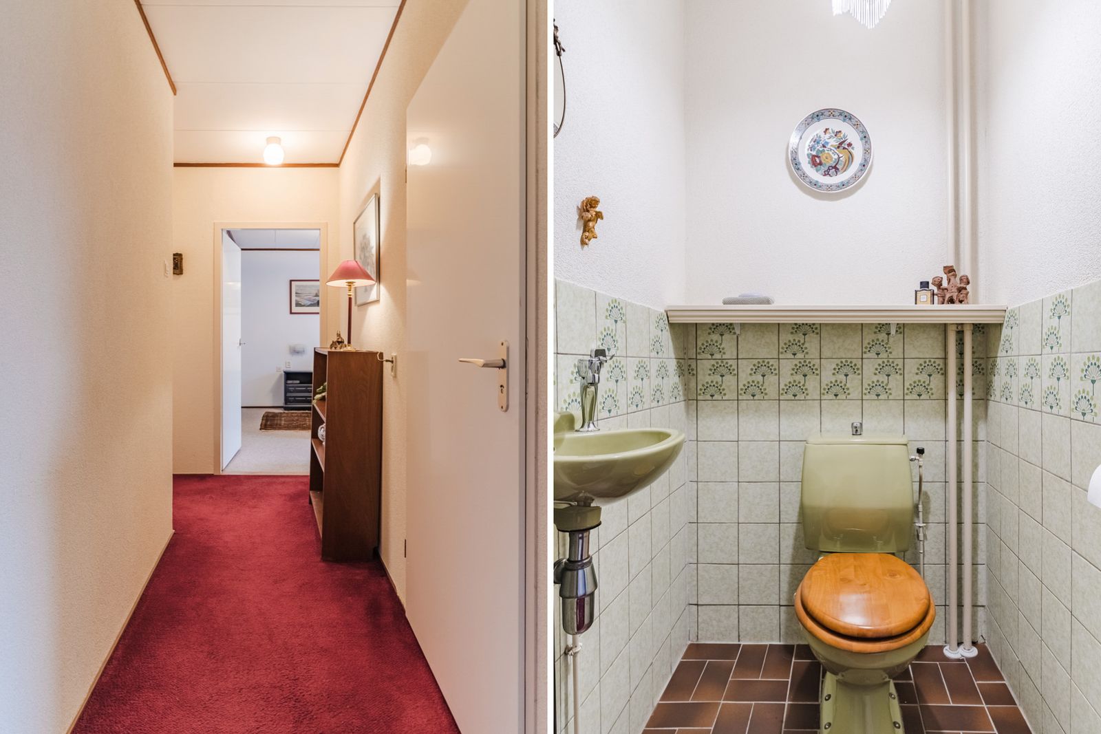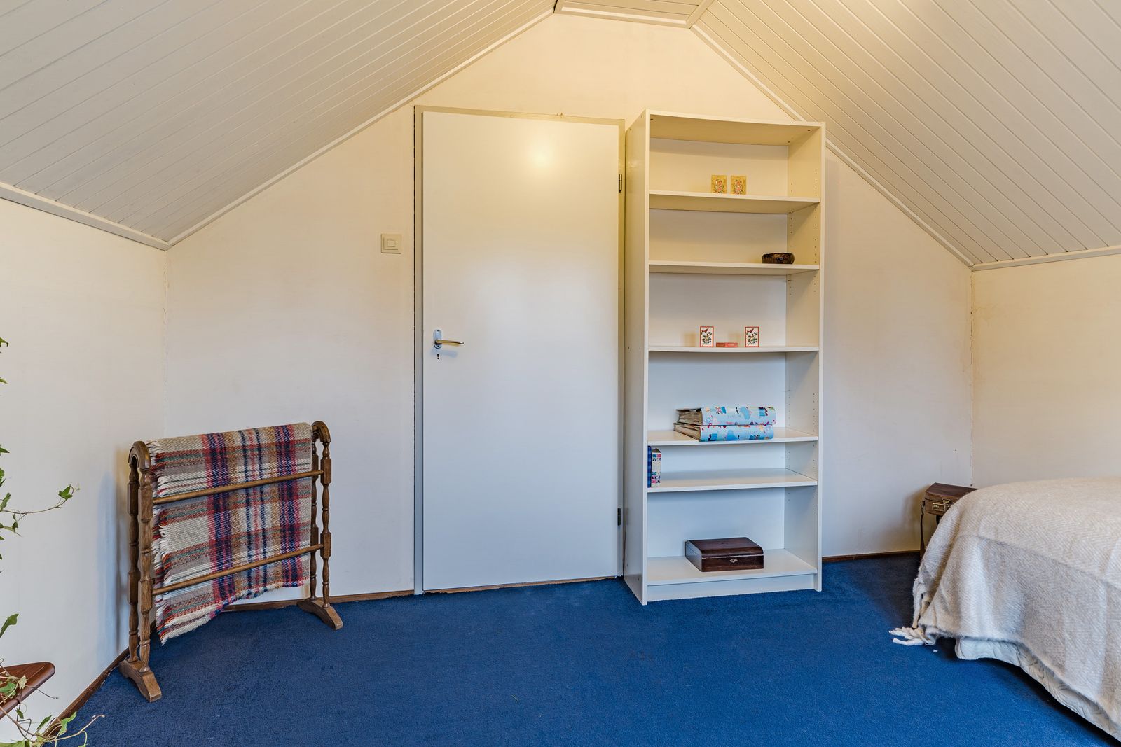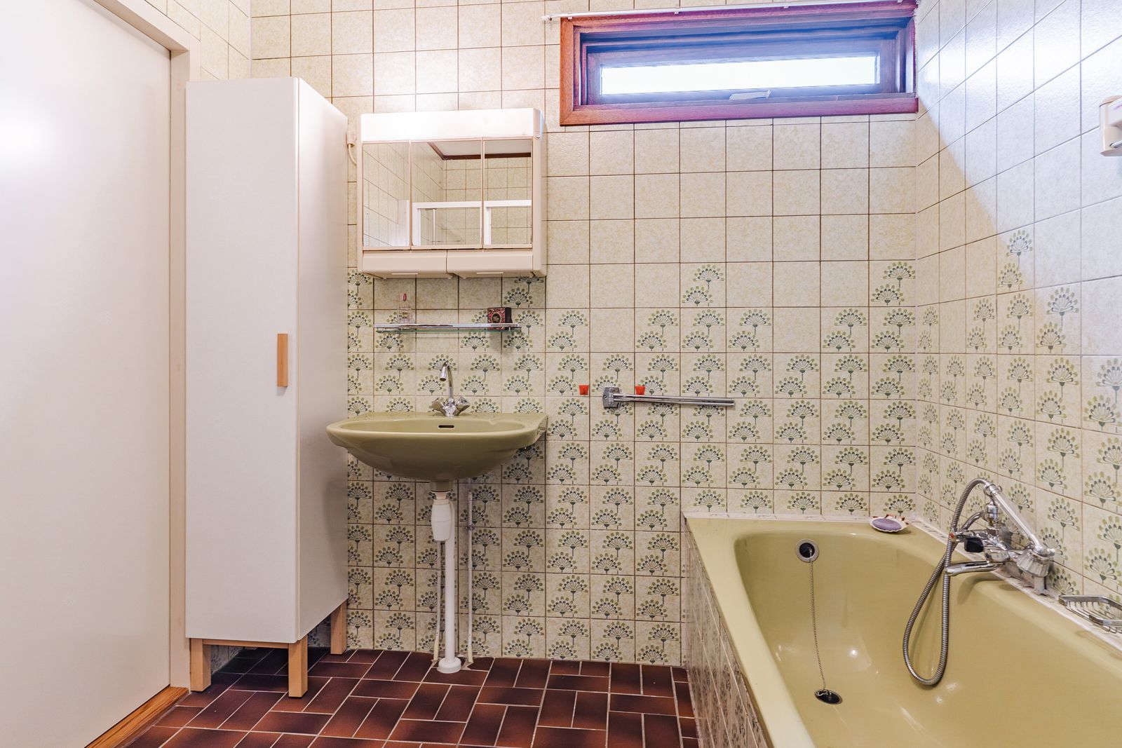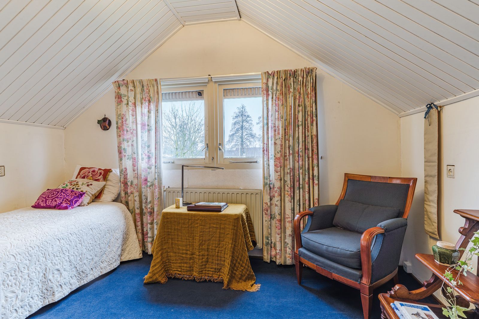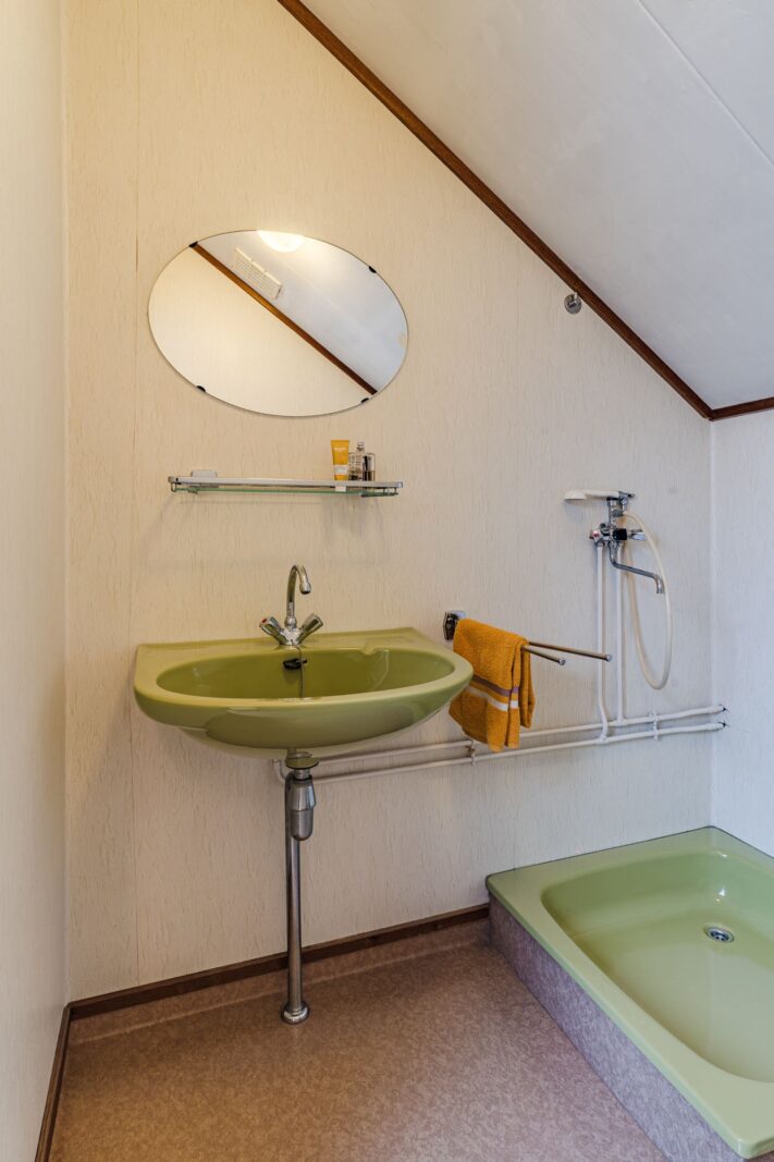 De slaapkamer op de begane grond is royaal en voorzien van een lange wand met vaste kasten. Deze kamer biedt veel privacy en comfort en is ideaal voor wie gelijkvloers wil wonen. De aangrenzende badkamer beschikt over een ligbad, douche, wastafel, toilet en bidet. Hoewel de afwerking gedateerd is, is de ruimte goed van formaat en biedt deze volop mogelijkheden voor modernisering.