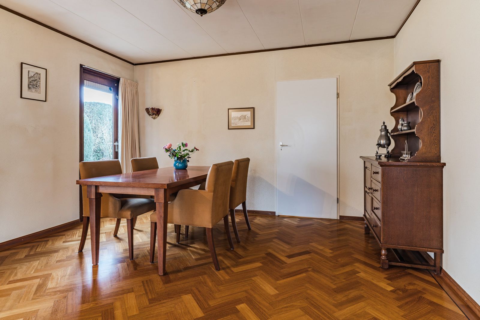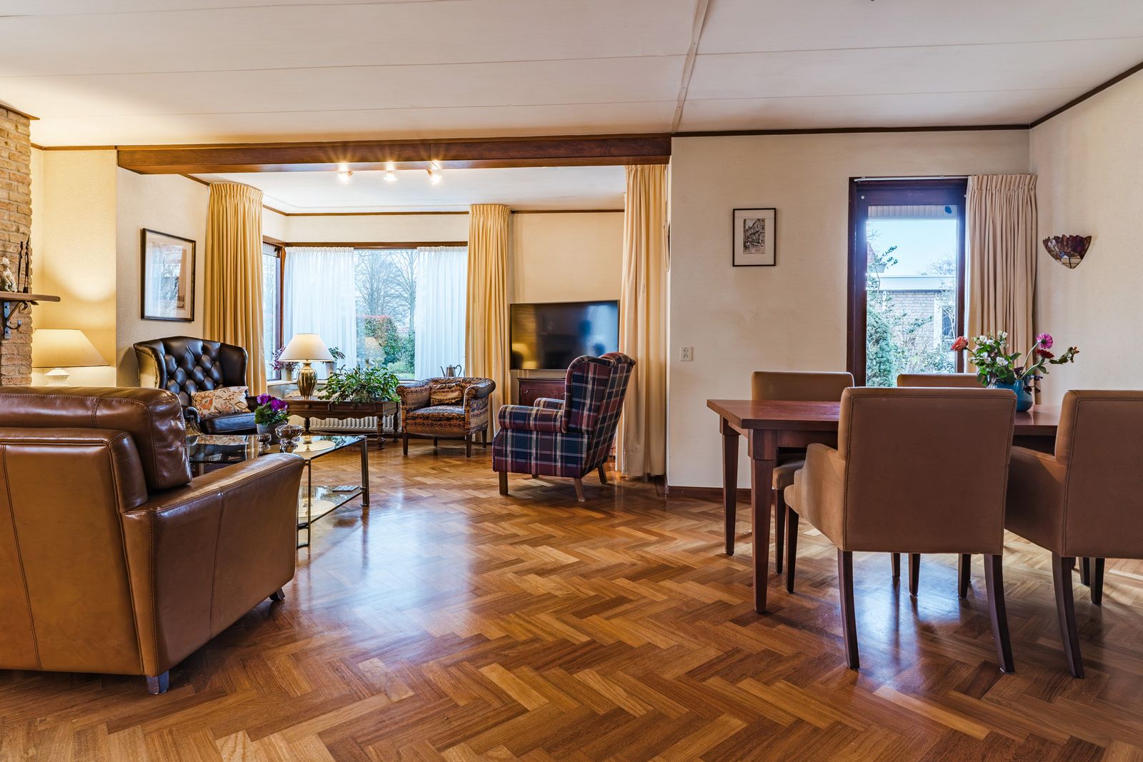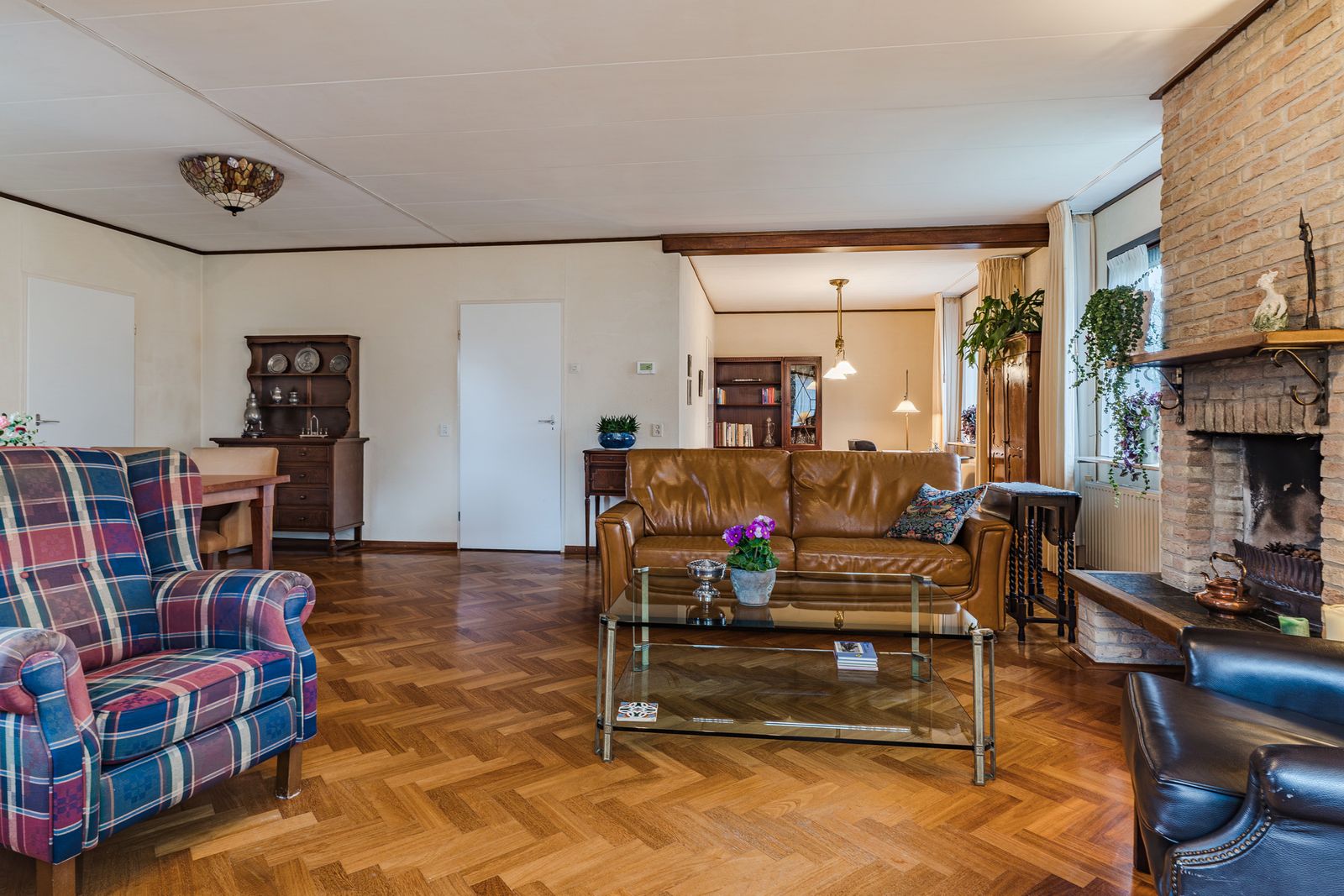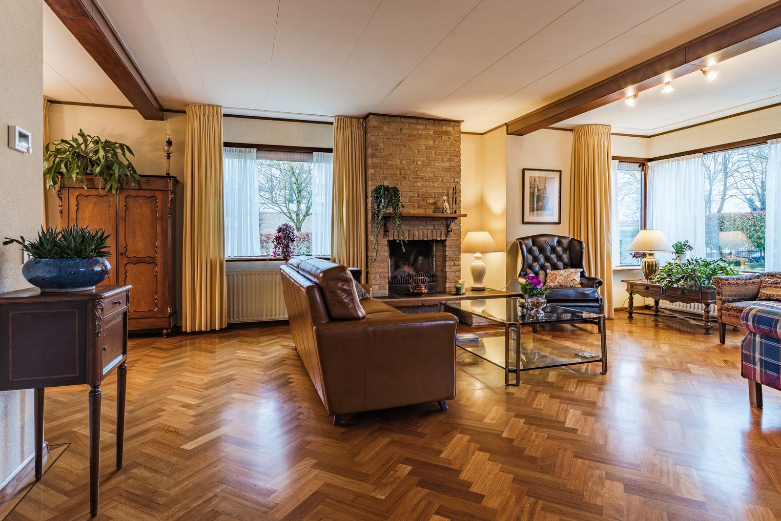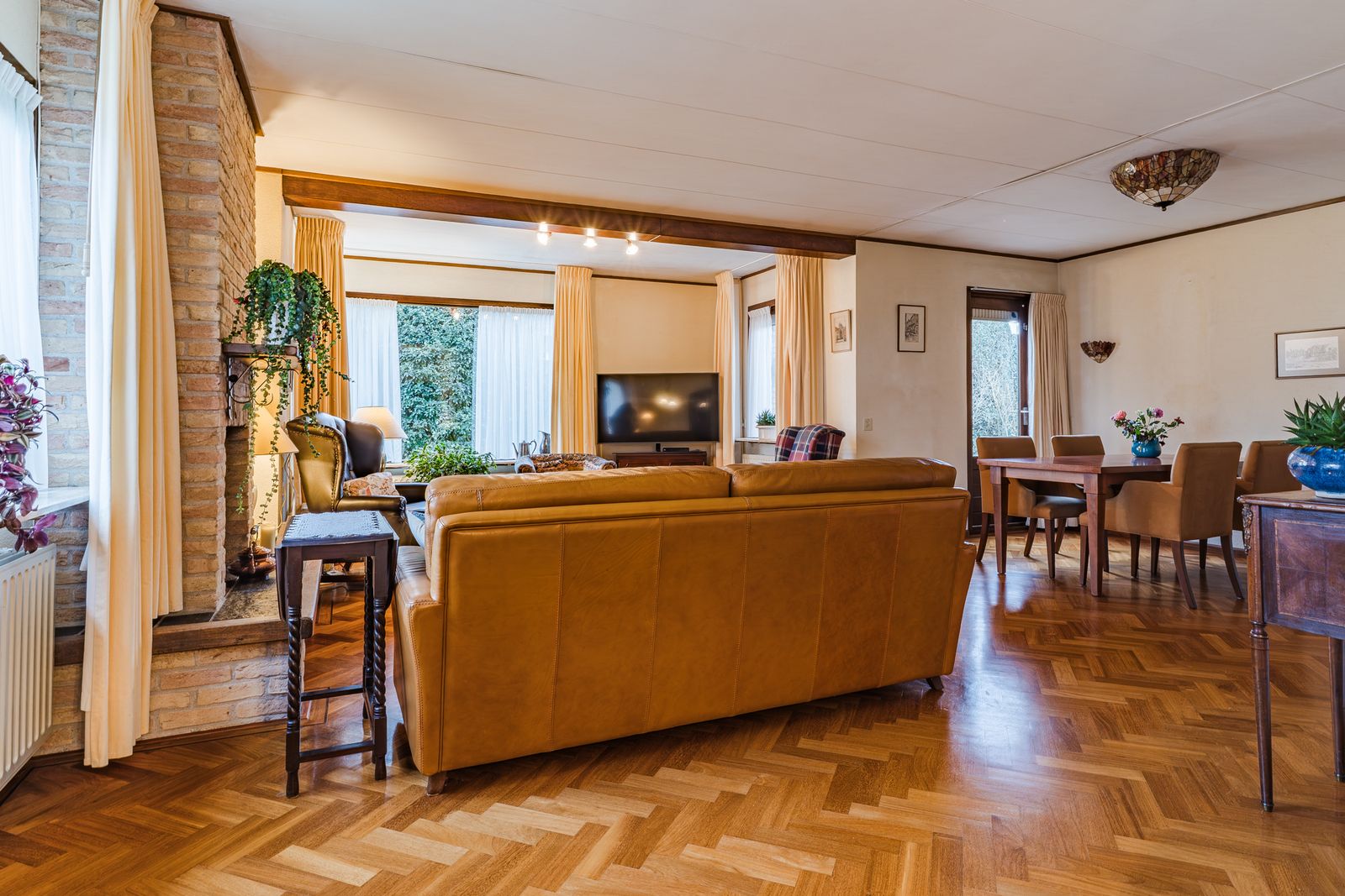 De royale L vormige woonkamer is een heerlijke plek om thuis te komen. Grote ramen zorgen voor veel licht en een vrij uitzicht op de tuin. Het prachtige visgraatparket en de open haard geven de ruimte direct een luxe en warme sfeer. Verschillende zithoeken zijn eenvoudig te realiseren dankzij de royale afmetingen. Dit is de ideale leefruimte voor lange avonden, gezellige diners en fijne familiemomenten.