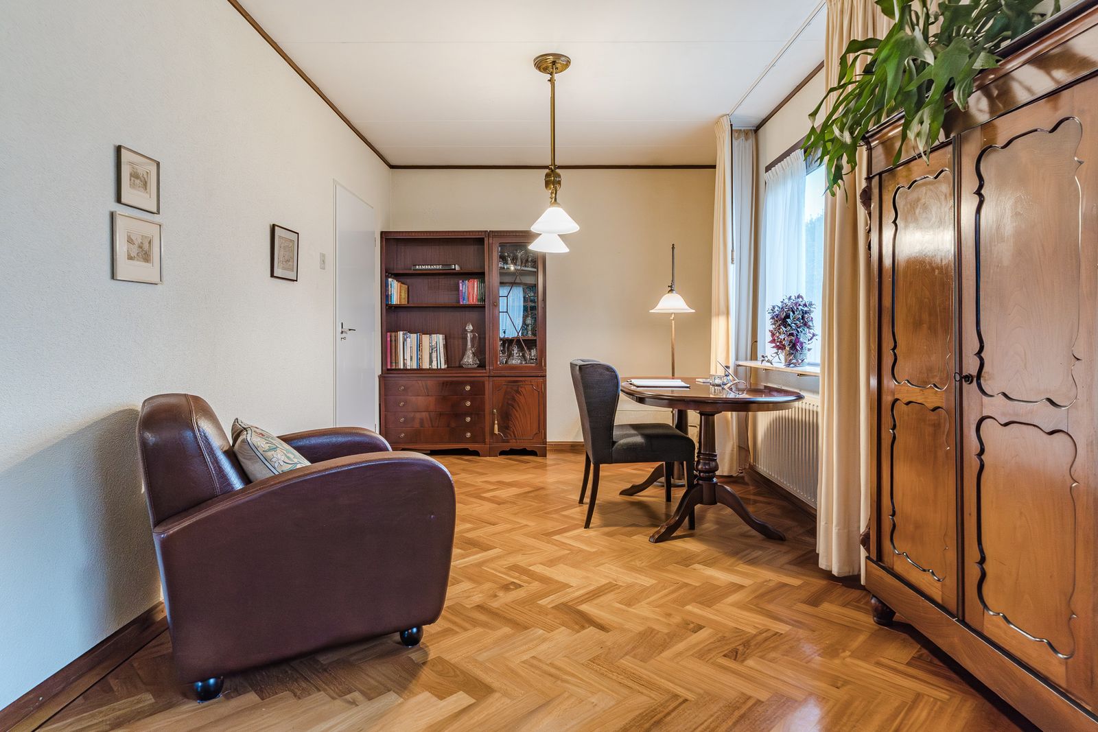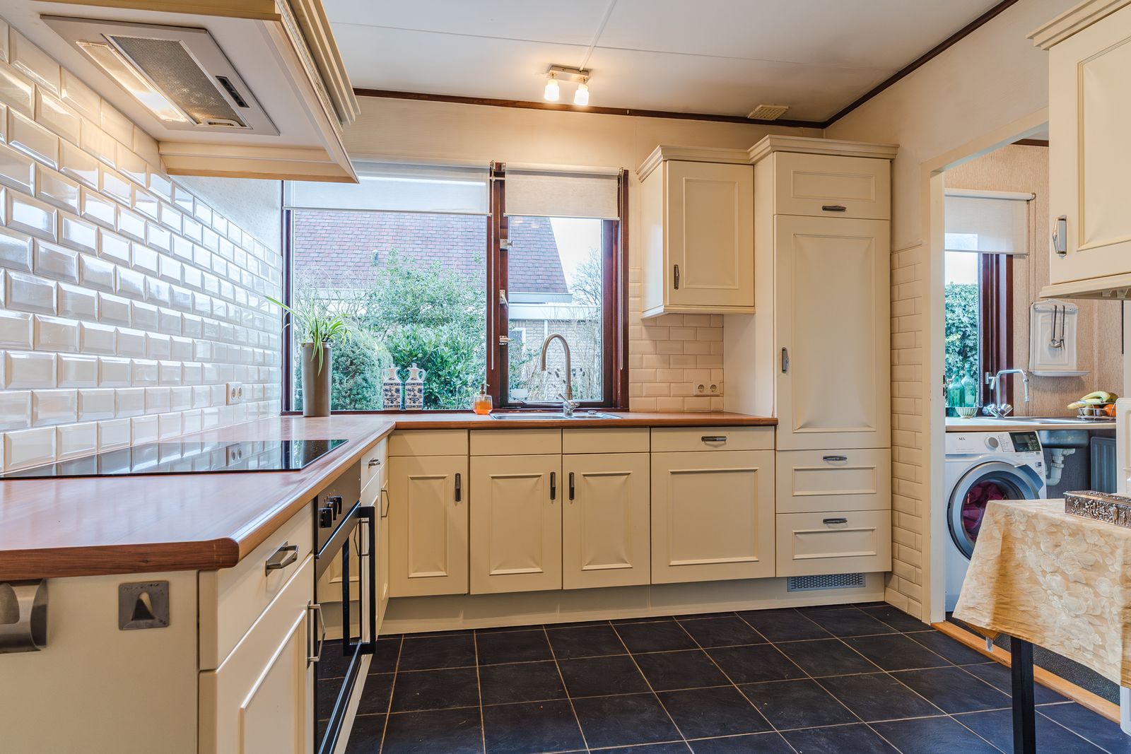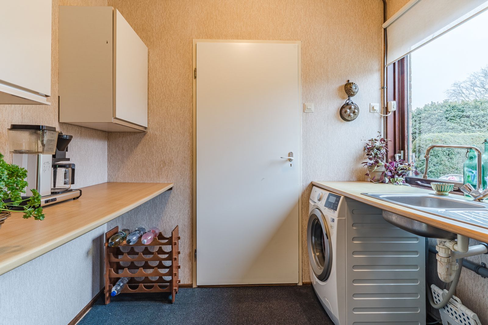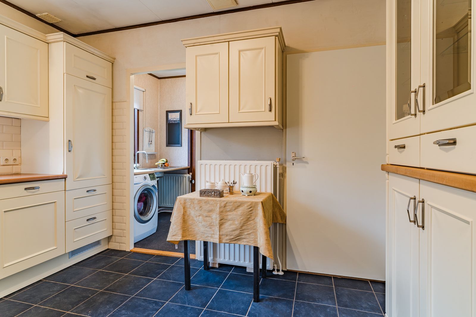 Aangrenzend bevindt zich een praktische bijkeuken met aanrecht, extra bergruimte en aansluiting voor de wasmachine. Een praktische werk-/bergkamer grenst hier weer aan, ideaal voor hobby, werkkamer of opslag.