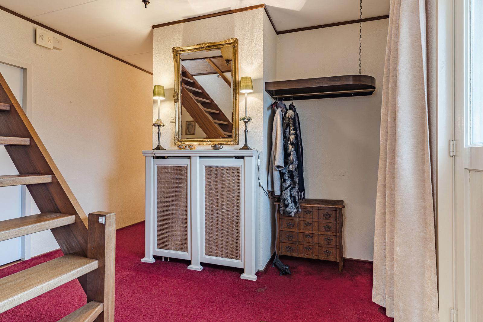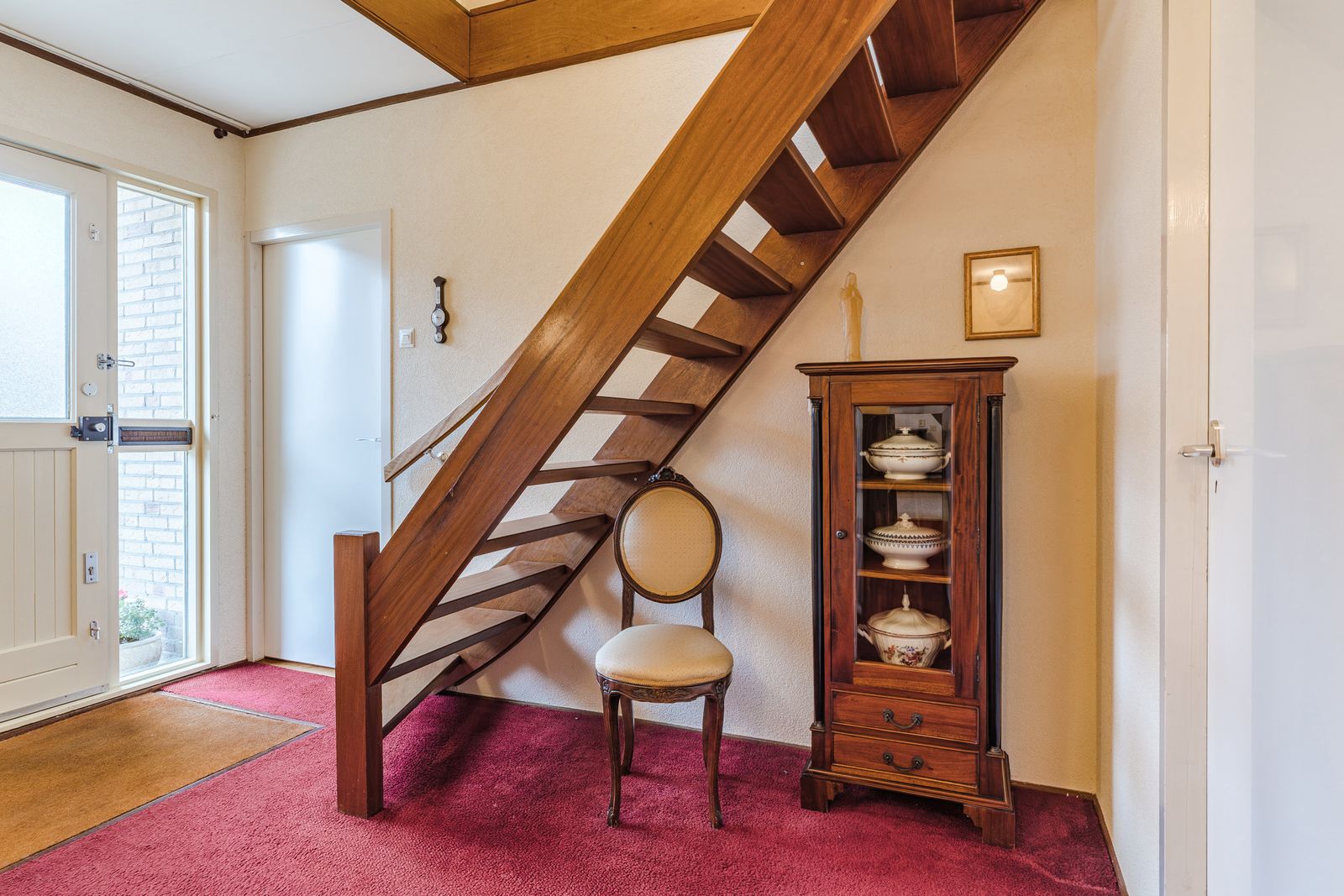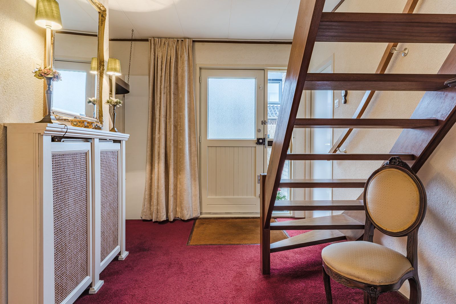 Bij binnenkomst betreed je de lichte en brede hal met trapopgang naar de eerste verdieping. De hal geeft toegang tot het toilet, de slaapkamer op de begane grond en de woonkamer.