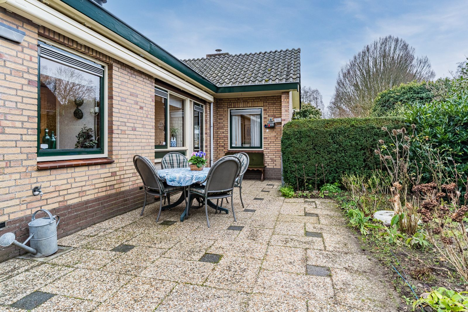 Zowel bij de keuken als aan de achterzijde bevindt zich een fijn terras waar je de hele dag van de zon kunt genieten. De ligging biedt volop privacy. De woning is voorzien van zonwering, aan de keukenzijde zit je heerlijk onder het grote elektrische uitvalscherm.