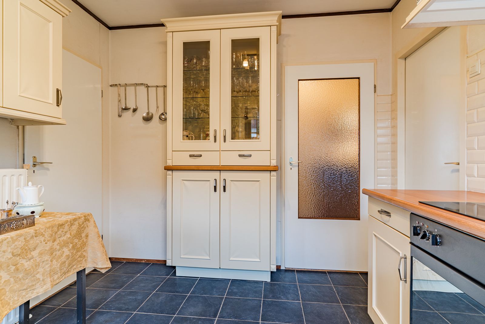 De dichte keuken is ruim opgezet en voorzien van veel kastruimte. De lichte fronten en het werkblad geven de ruimte een klassieke uitstraling. De keuken biedt plaats voor een ontbijthoek en beschikt over diverse inbouwapparatuur. Vanuit hier is er direct toegang tot de half verdiepte kelder en bijkeuken.