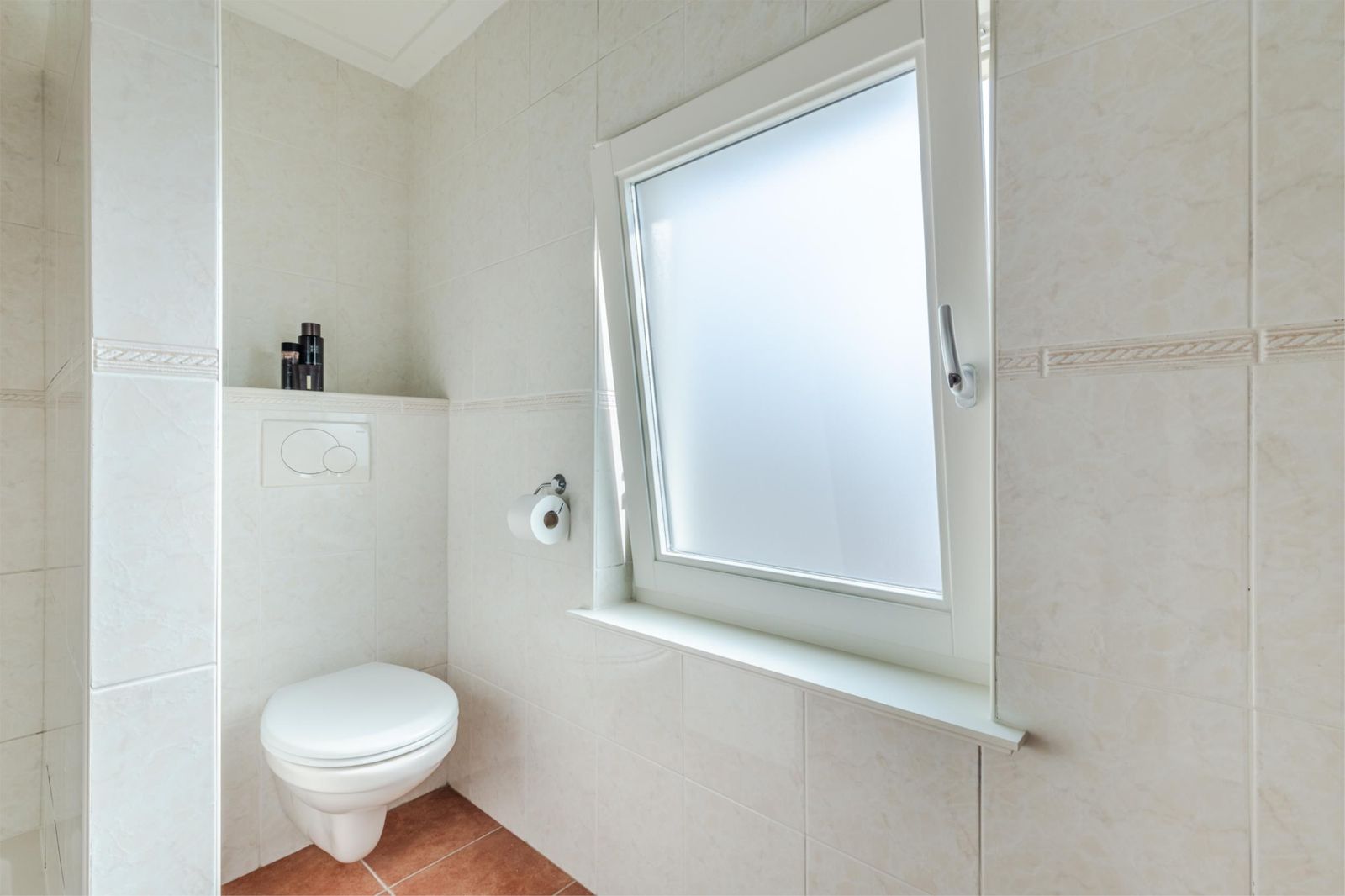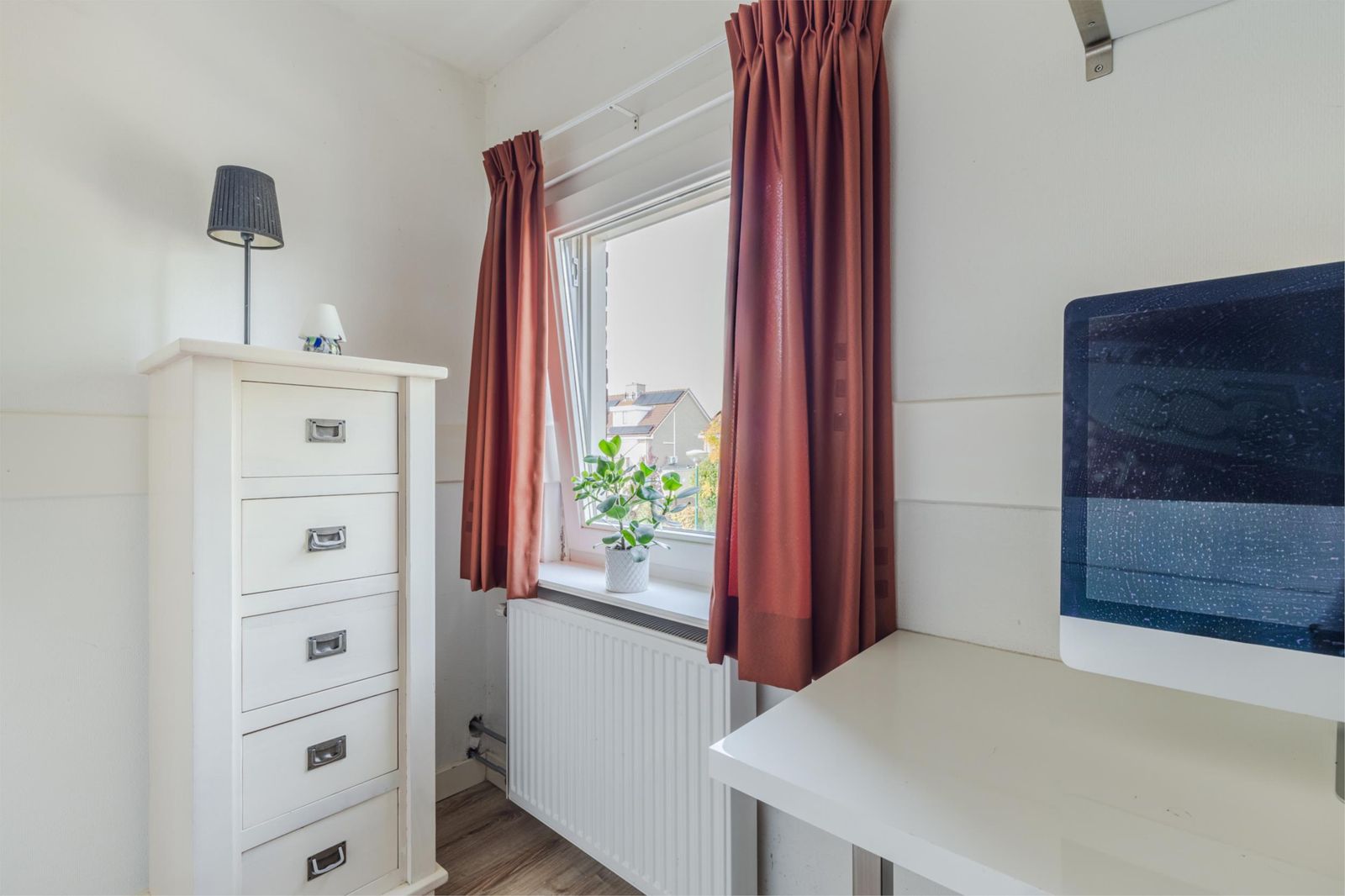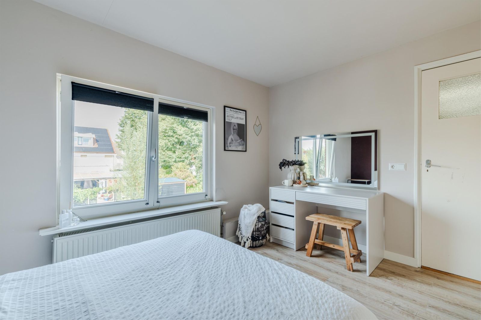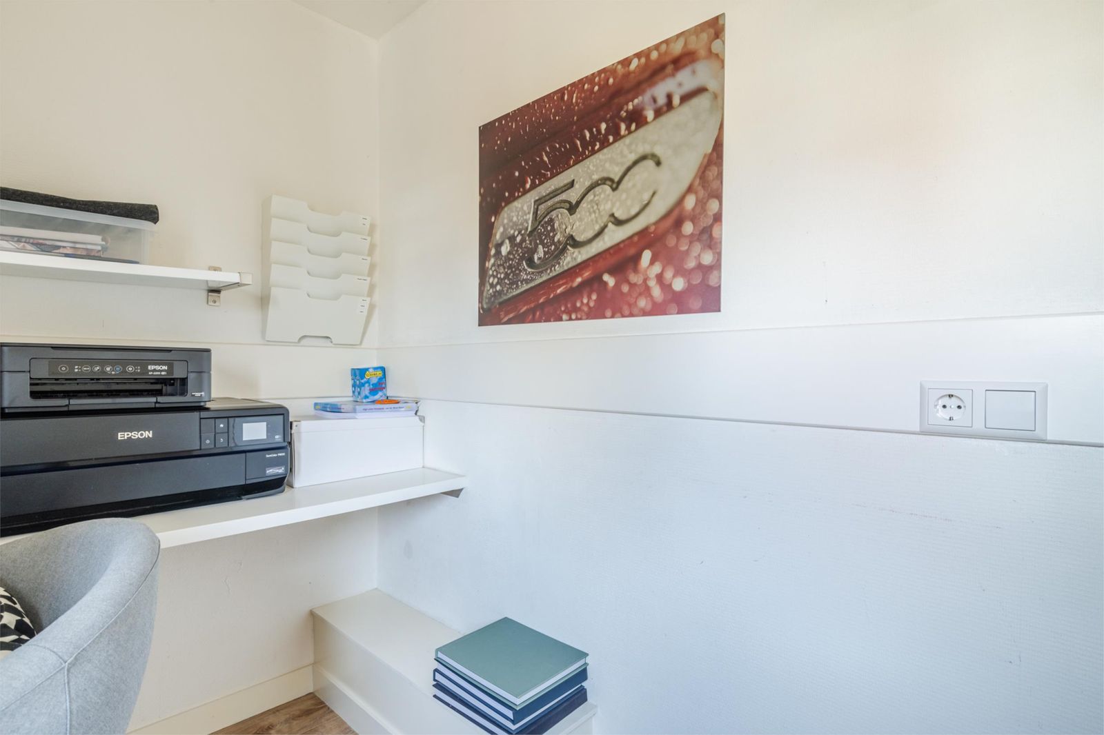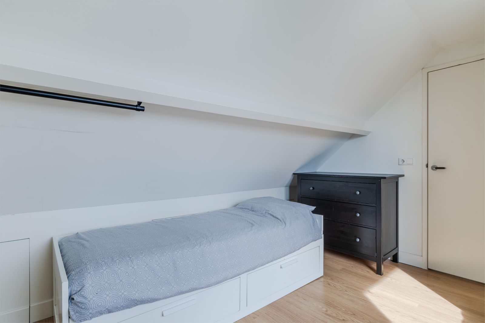 Via de vaste, gestoffeerde trap kom je op de overloop, die toegang biedt tot twee slaapkamers, een studeerkamer en de badkamer. De slaapkamer aan de achterzijde heeft een vaste kastenwand en uitzicht op de tuin. De slaapkamer aan de voorzijde is ruim en heeft een kleine inbouwkast. Aan de voorzijde bevindt zich de studeerkamer. De badkamer ligt ook aan de achterzijde en is volledig betegeld. Je vindt hier een douchegedeelte, tweede toilet, wastafelmeubel, infraroodverwarmingspaneel en een designradiator.