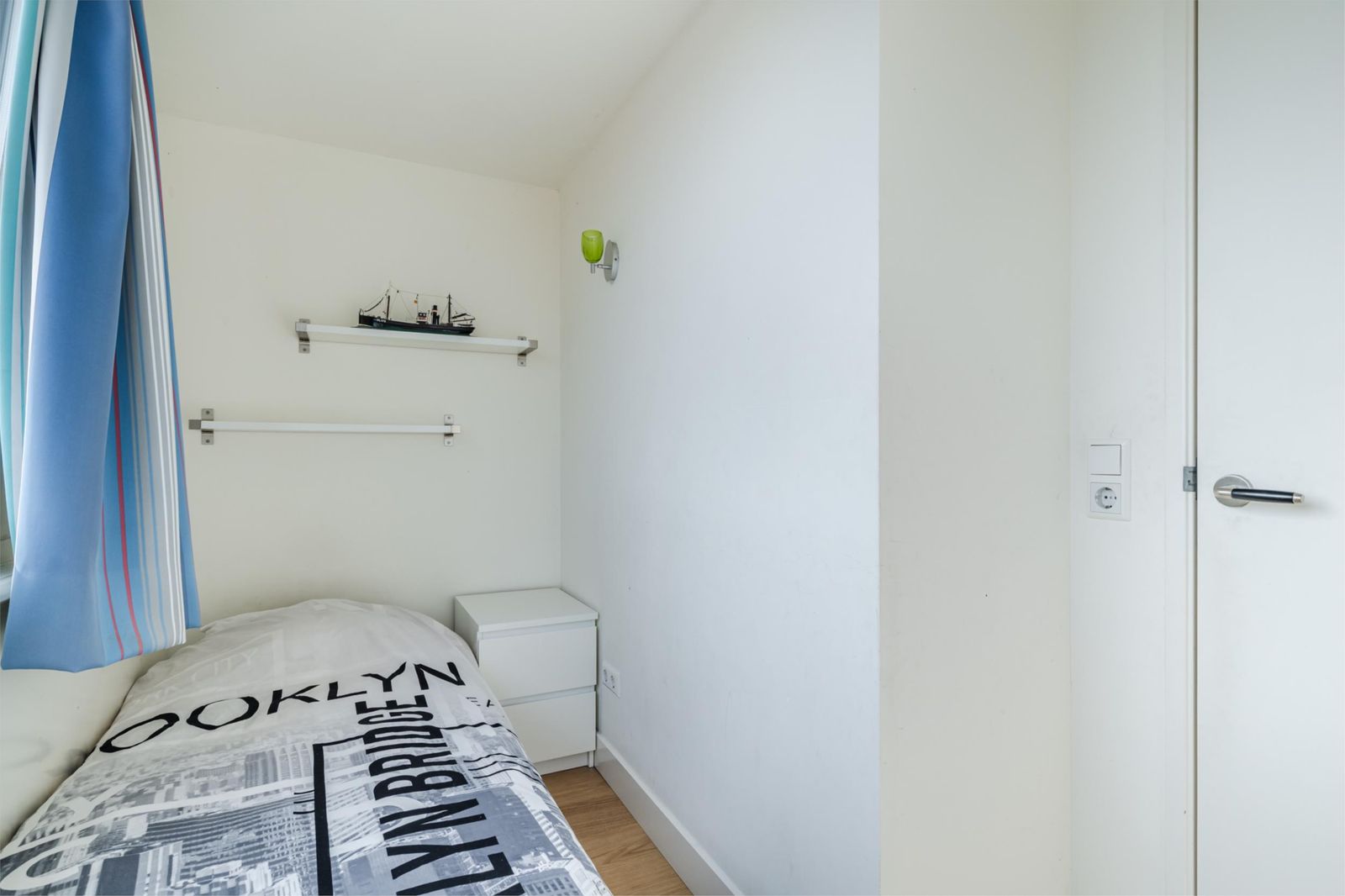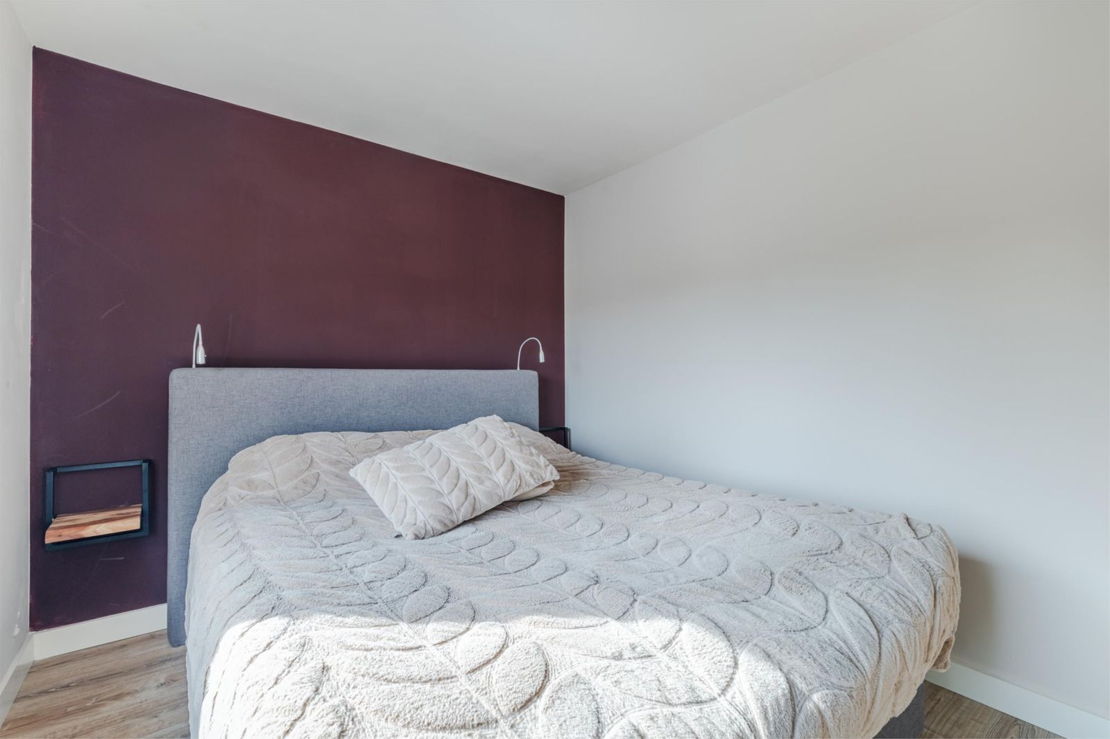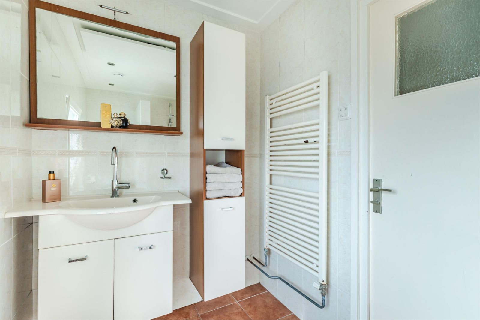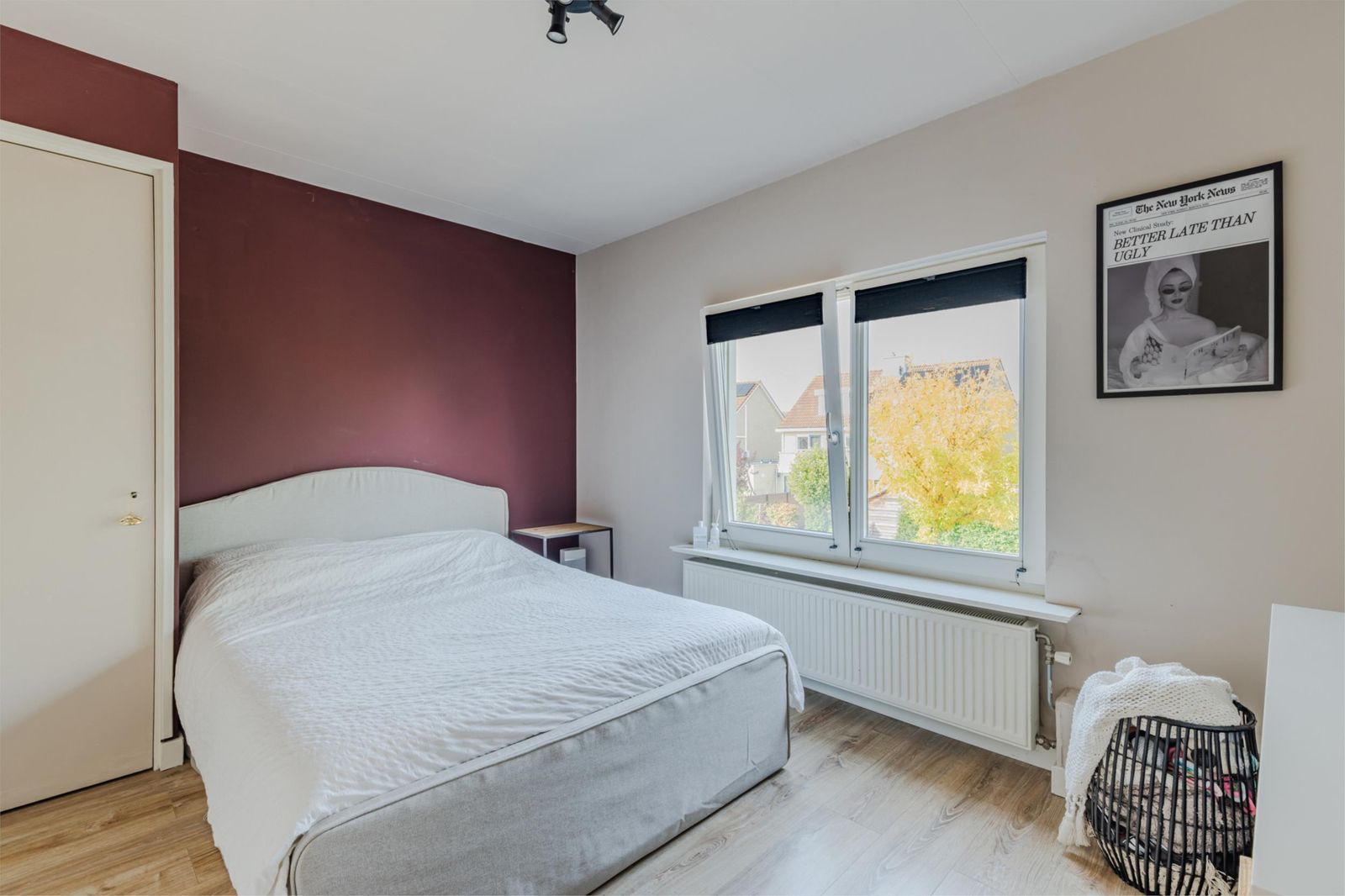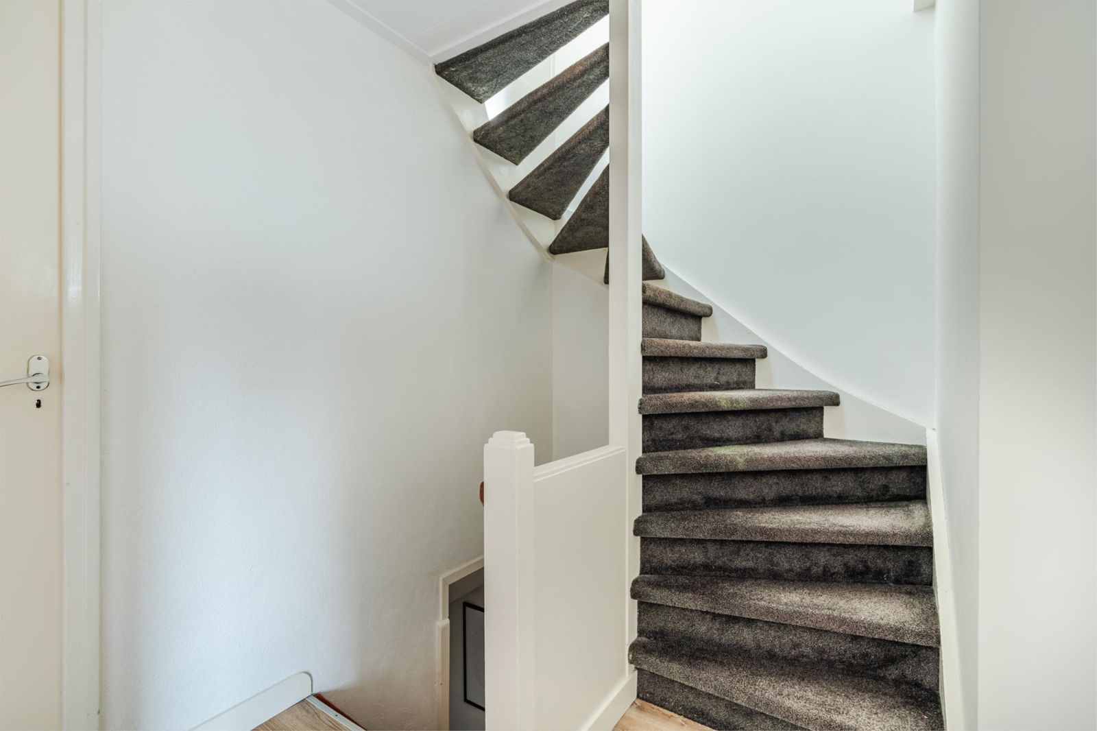 Via de vaste, gestoffeerde trap kom je op de overloop, die toegang biedt tot twee slaapkamers, een studeerkamer en de badkamer. De slaapkamer aan de achterzijde heeft een vaste kastenwand en uitzicht op de tuin. De slaapkamer aan de voorzijde is ruim en heeft een kleine inbouwkast. Aan de voorzijde bevindt zich de studeerkamer. De badkamer ligt ook aan de achterzijde en is volledig betegeld. Je vindt hier een douchegedeelte, tweede toilet, wastafelmeubel, infraroodverwarmingspaneel en een designradiator.