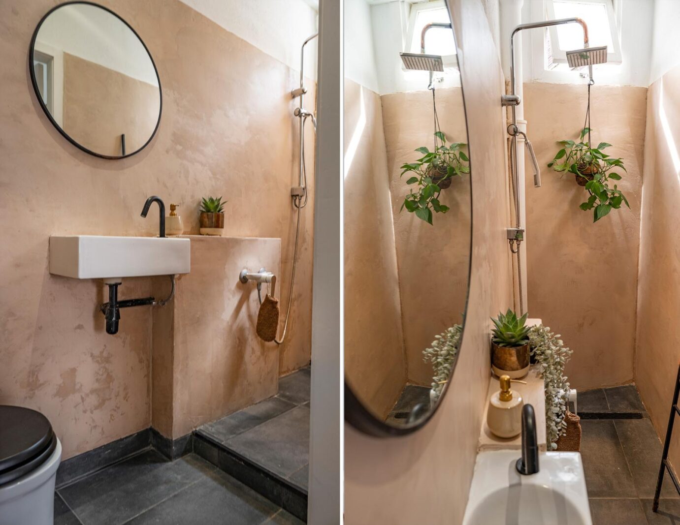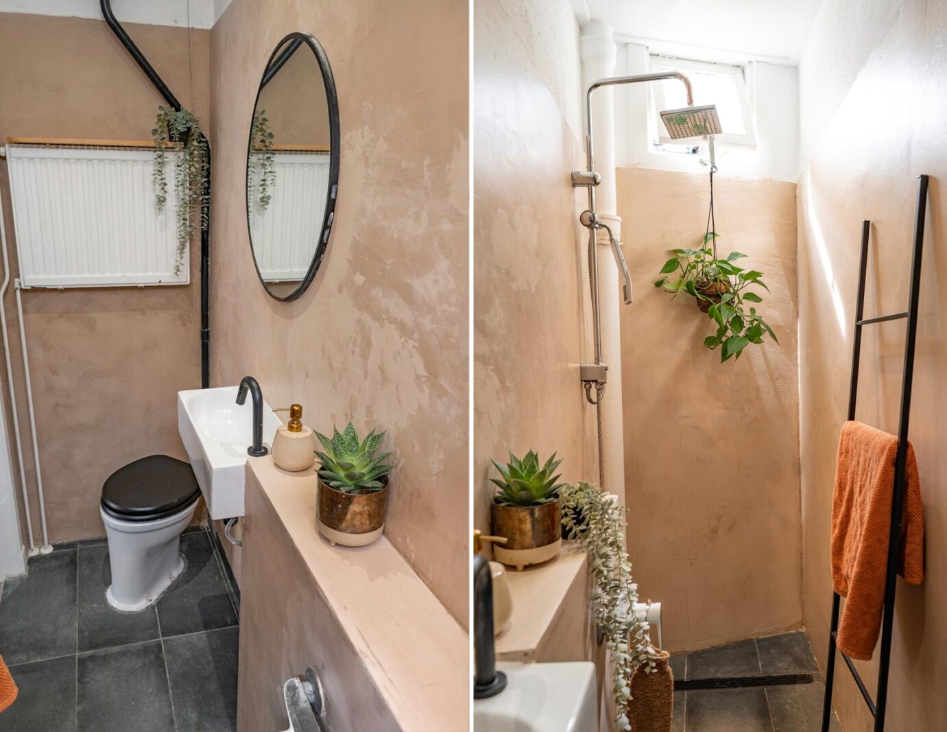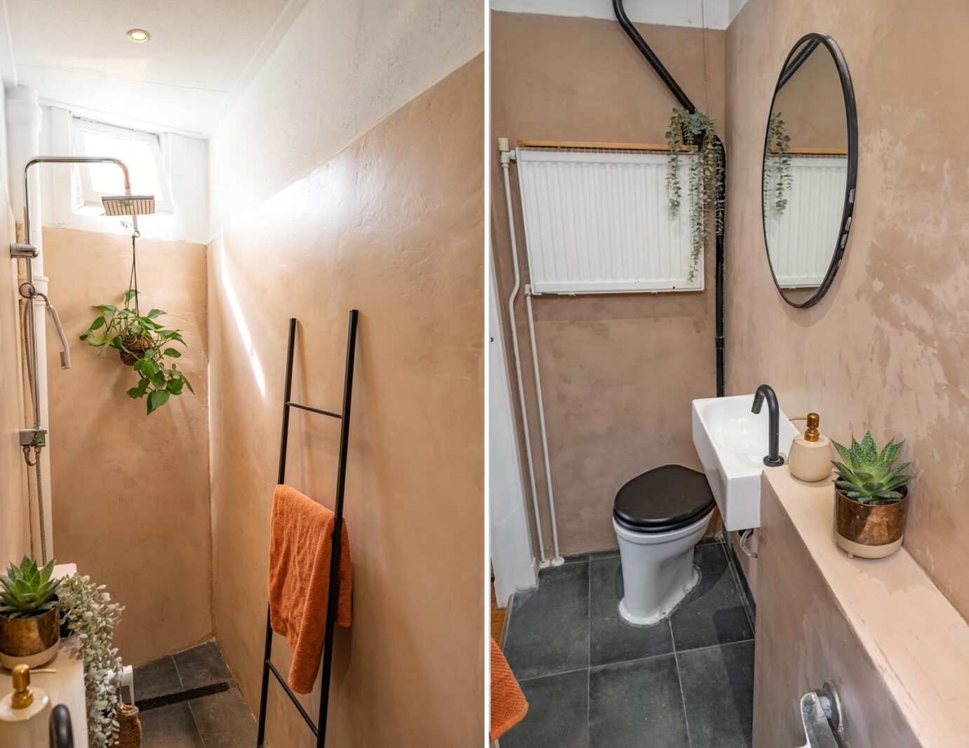 De badkamer is modern en stijlvol afgewerkt met beton ciré en voorzien van een inloopdouche, wastafel en toilet. In de gang bevindt zich een praktische bergkast met wasmachineaansluiting.