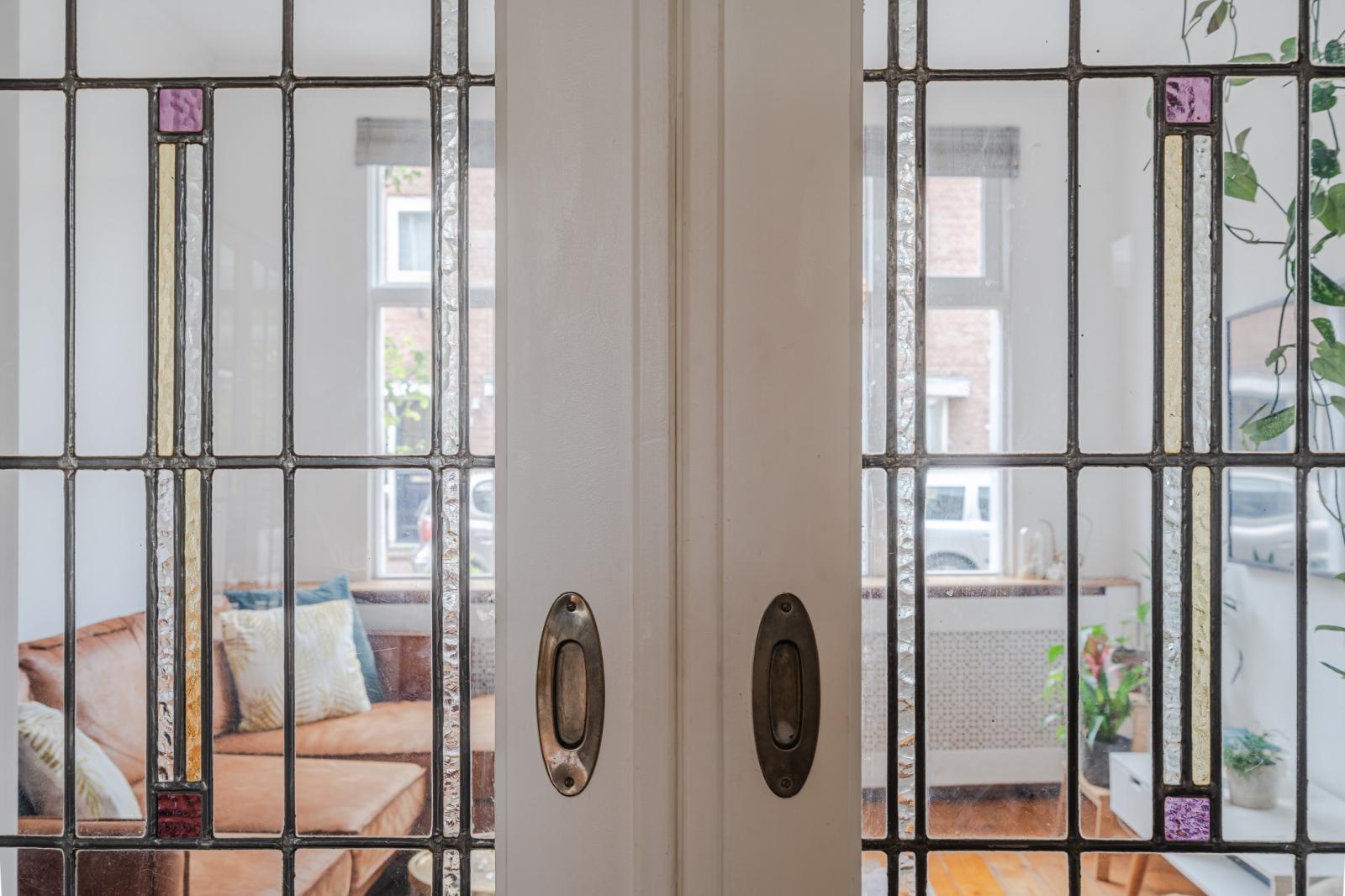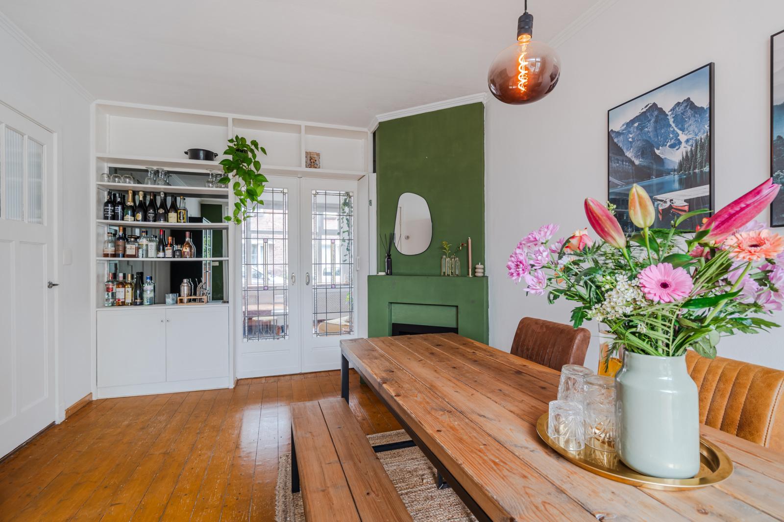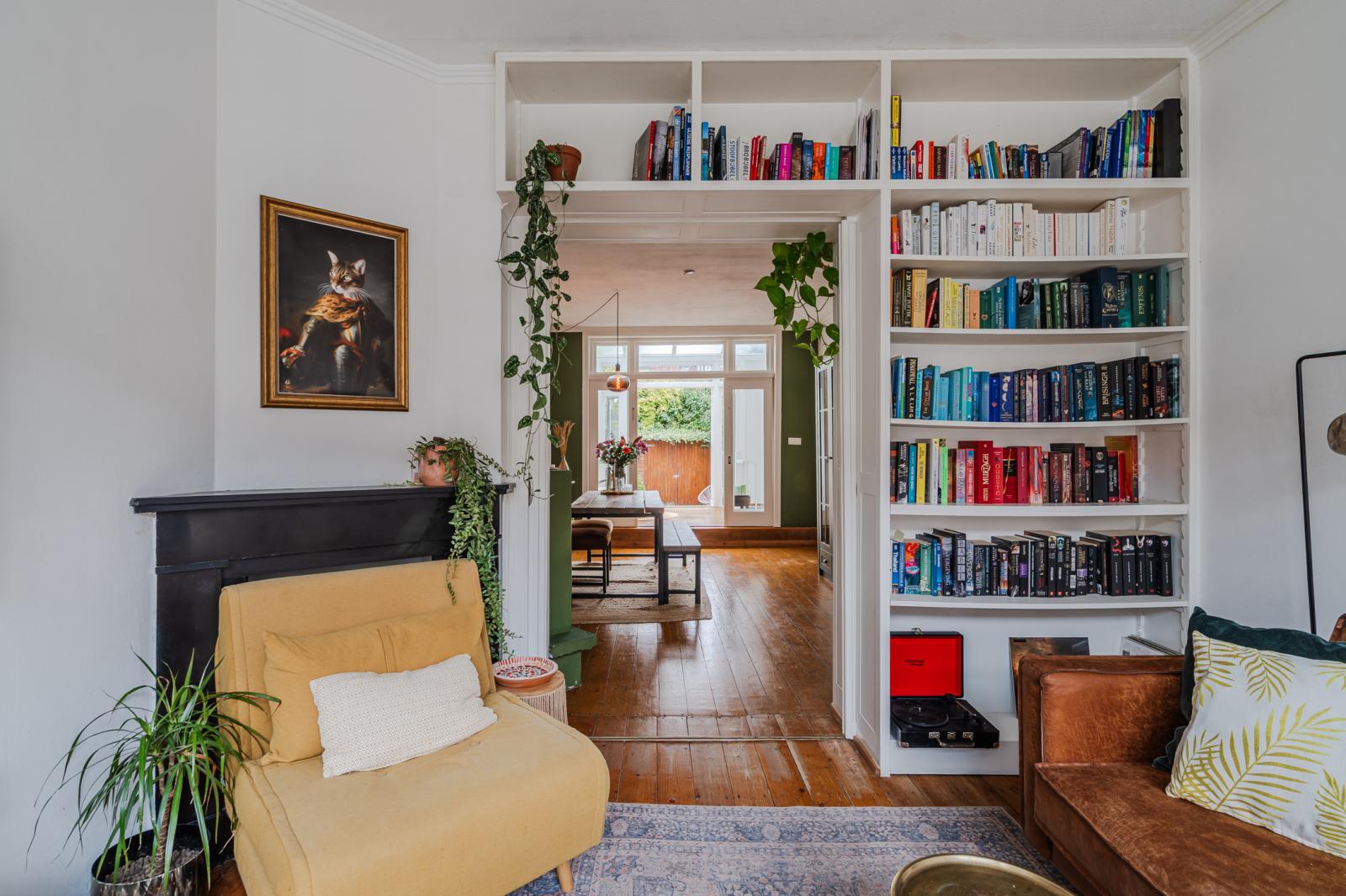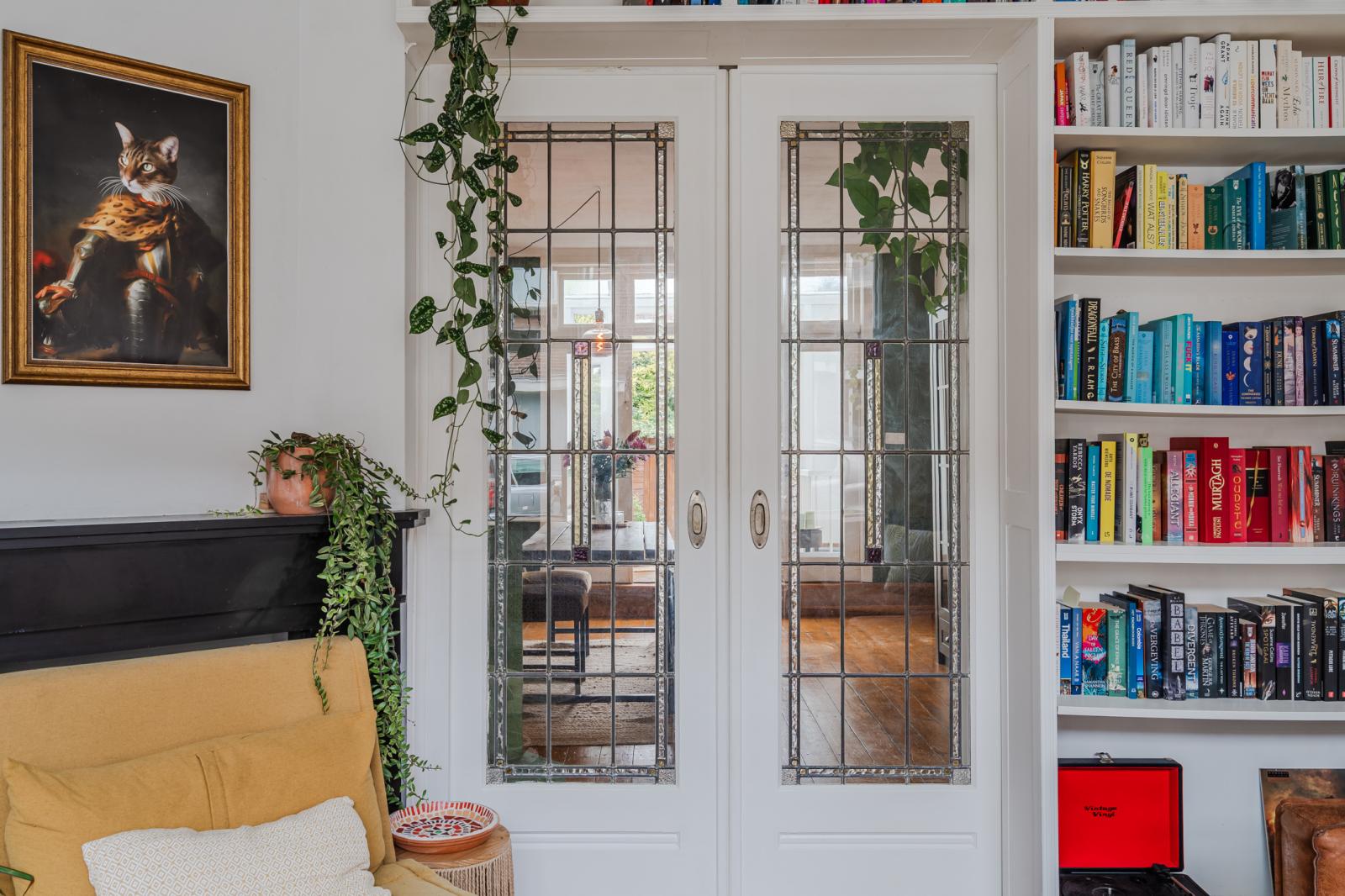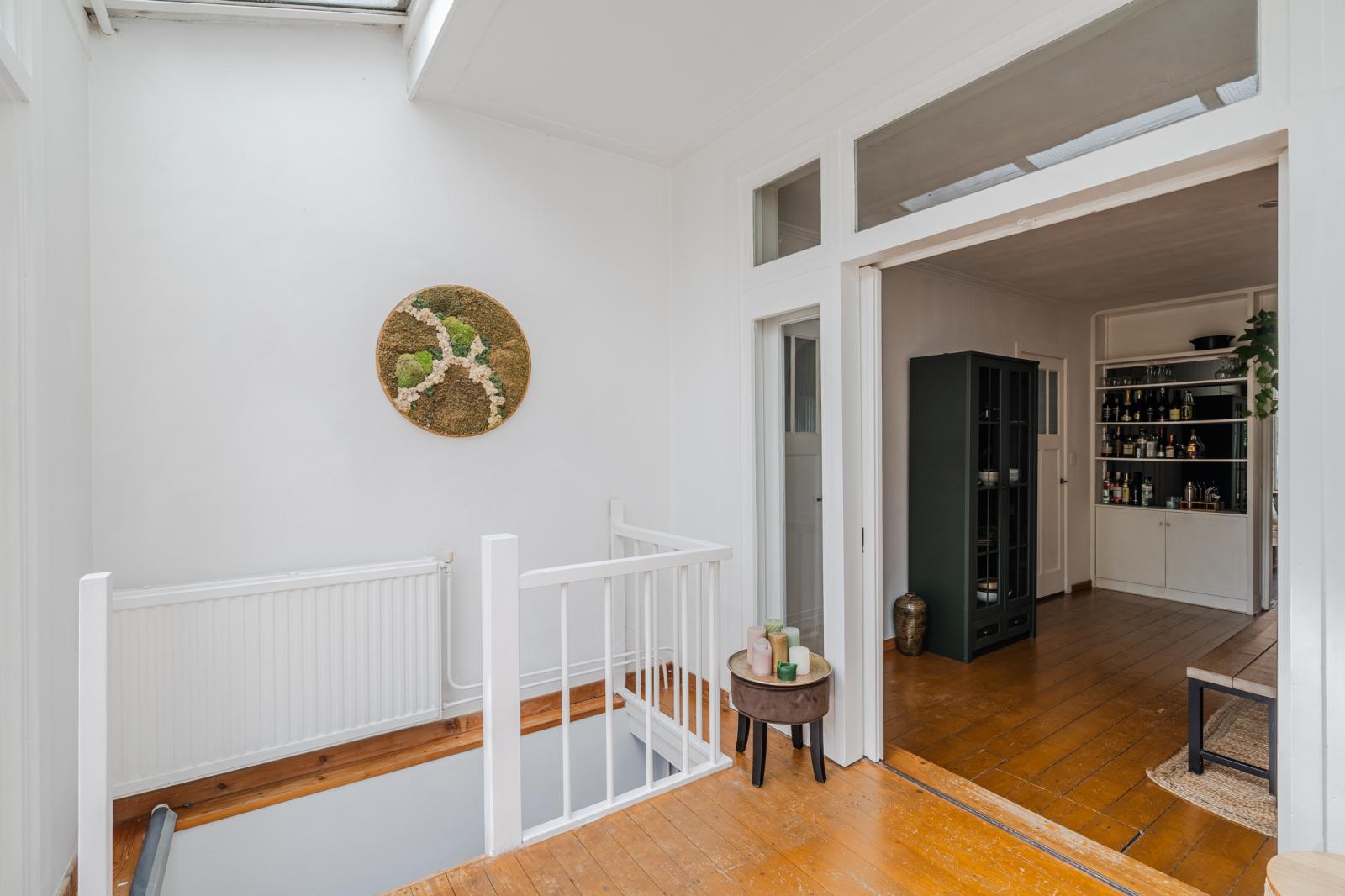 De woning ontvouwt zich vervolgens in een speels ingedeelde leefruimte, verdeeld over drie met elkaar verbonden delen die samen een verrassend ruimtelijk geheel vormen. De karakteristieke en-suite deuren geven niet alleen charme, maar bieden ook flexibiliteit: open en licht waar gewenst, intiem en beschut wanneer dat past.