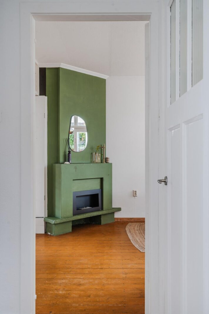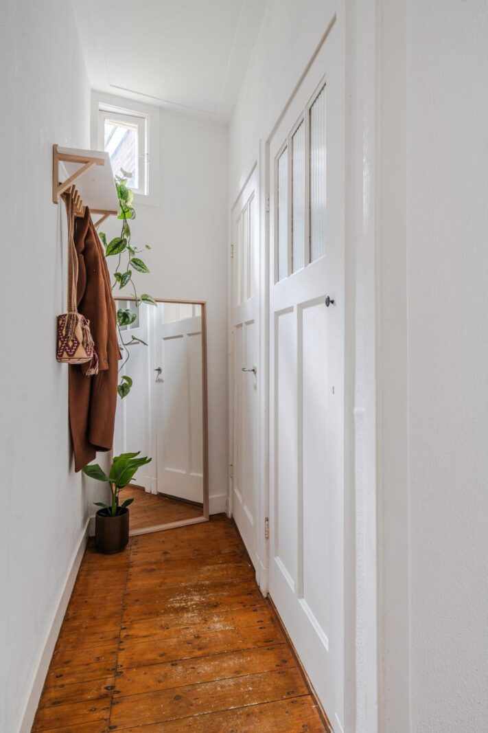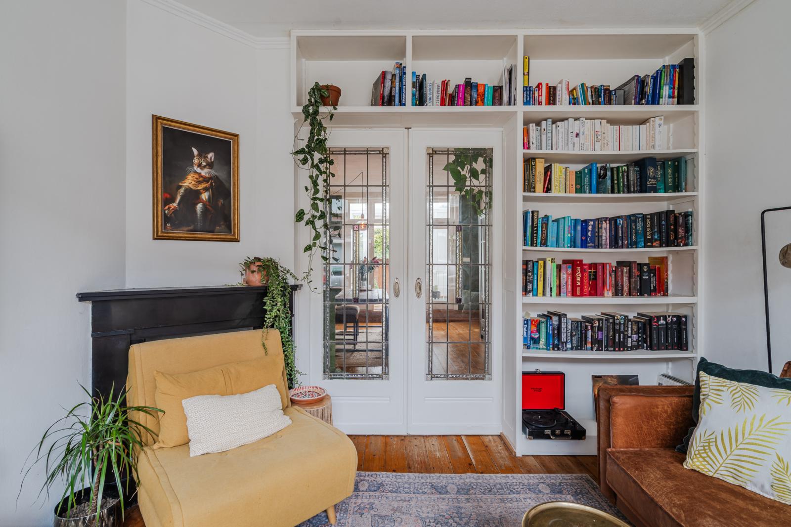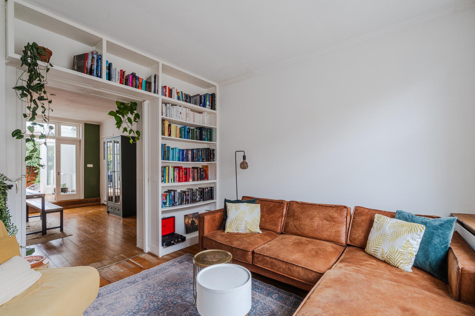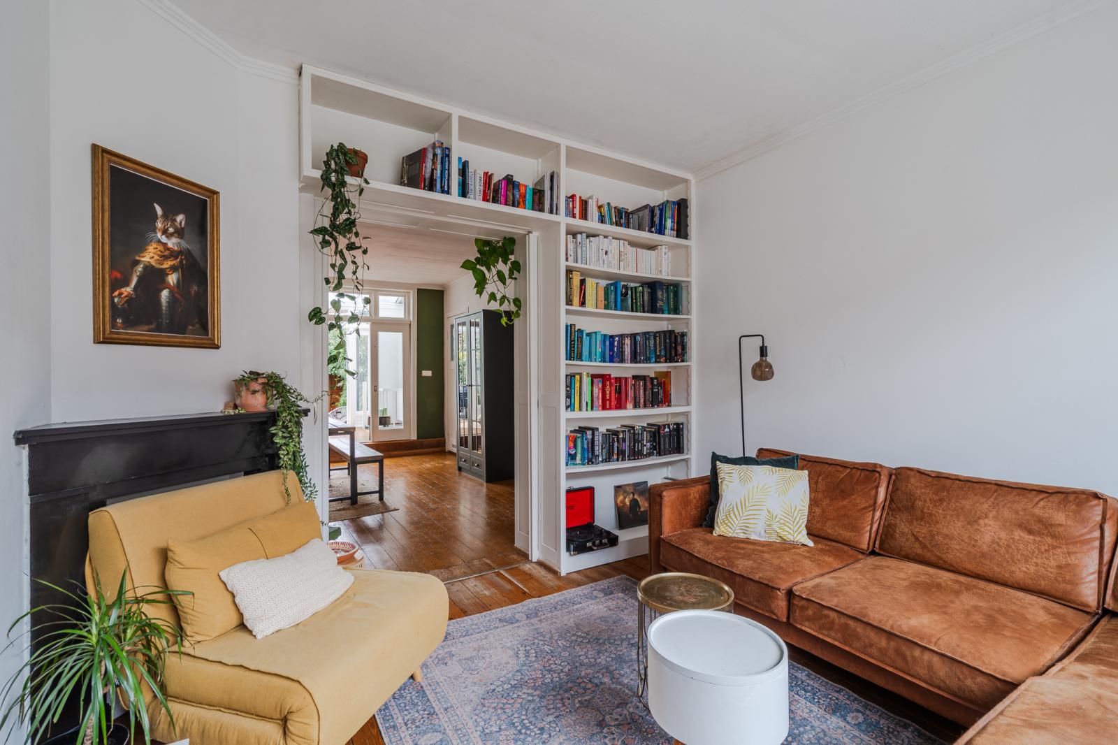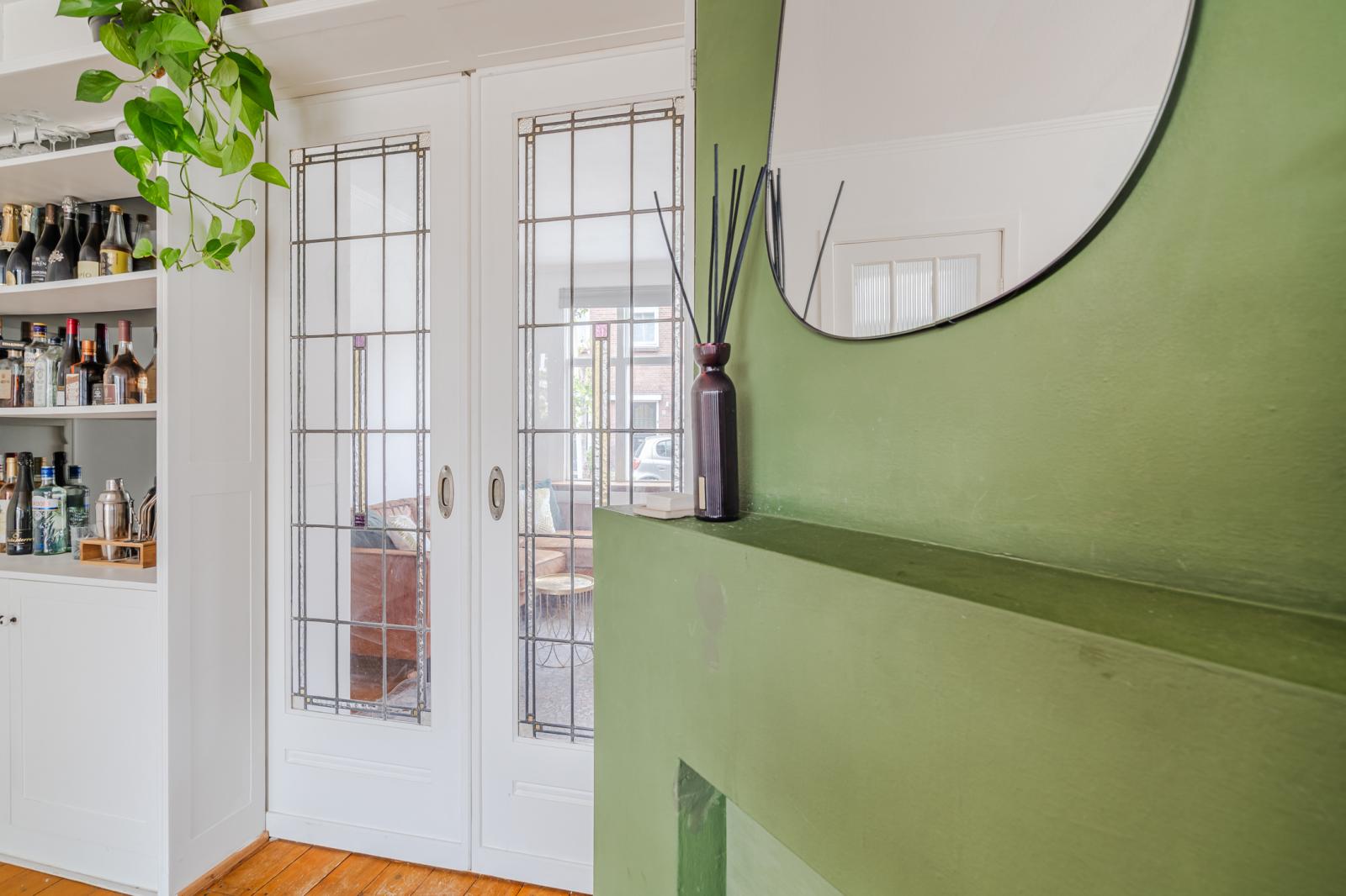 De woning ontvouwt zich vervolgens in een speels ingedeelde leefruimte, verdeeld over drie met elkaar verbonden delen die samen een verrassend ruimtelijk geheel vormen. De karakteristieke en-suite deuren geven niet alleen charme, maar bieden ook flexibiliteit: open en licht waar gewenst, intiem en beschut wanneer dat past.
