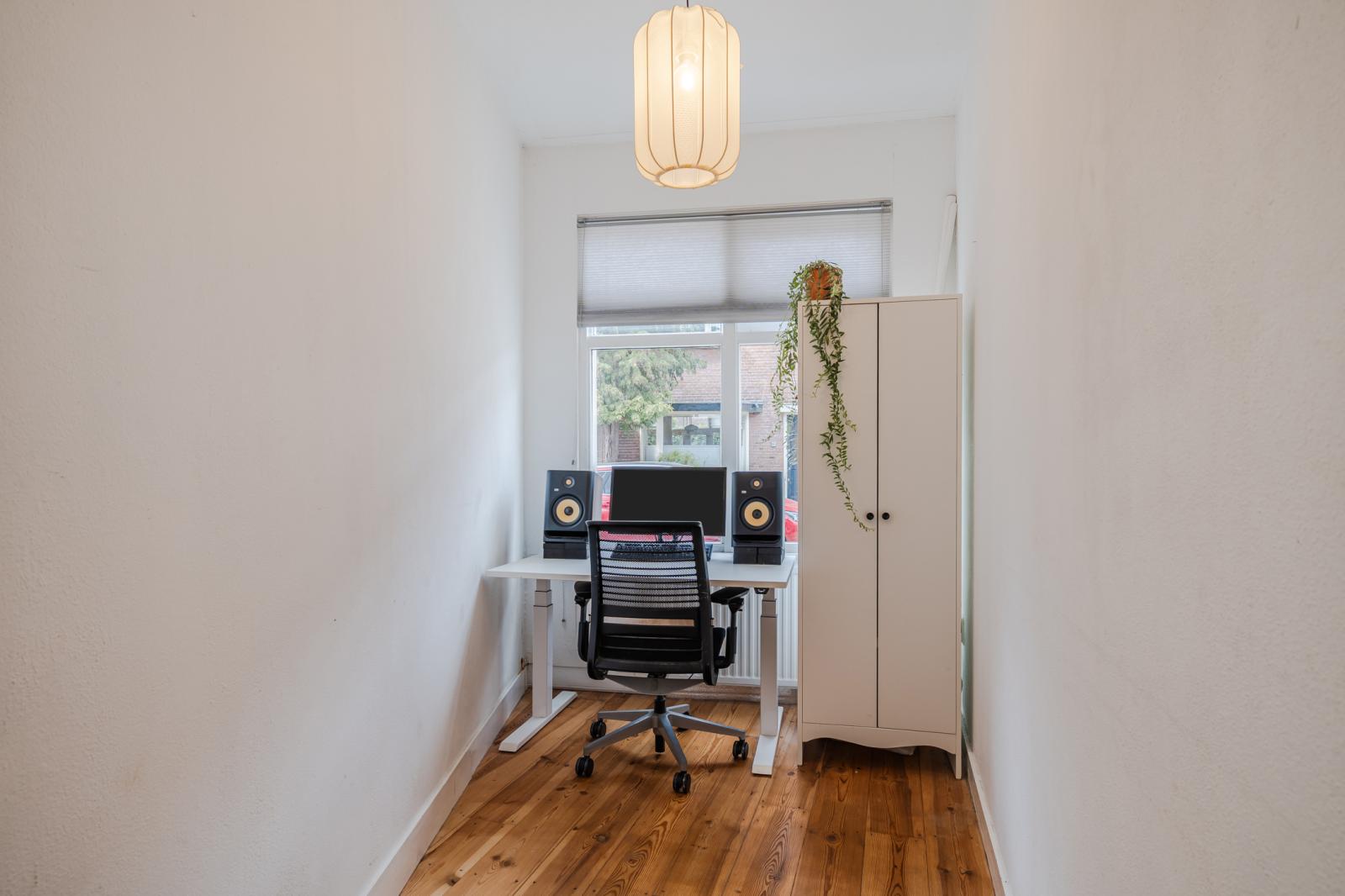 Bij binnenkomst word je verwelkomd in de hal, die toegang geeft tot verschillende ruimtes. Aan de voorzijde bevindt zich een kamer die perfect is als werkplek, logeerkamer of hobbyruimte - ideaal voor wie thuis werkt.