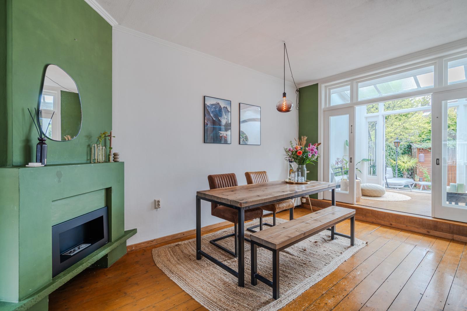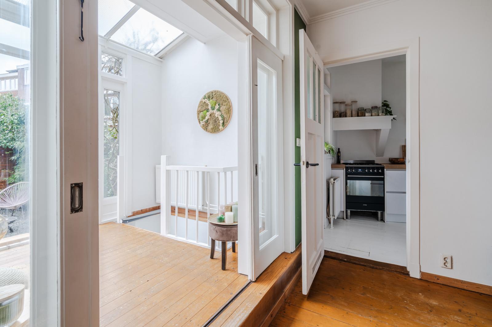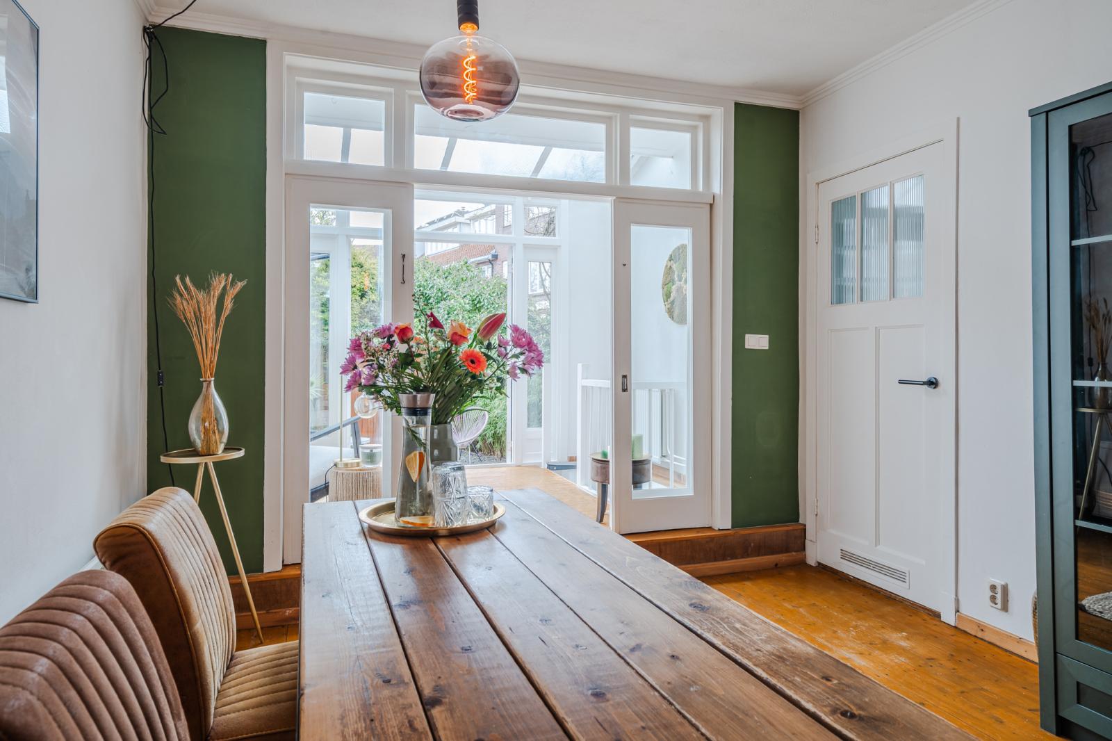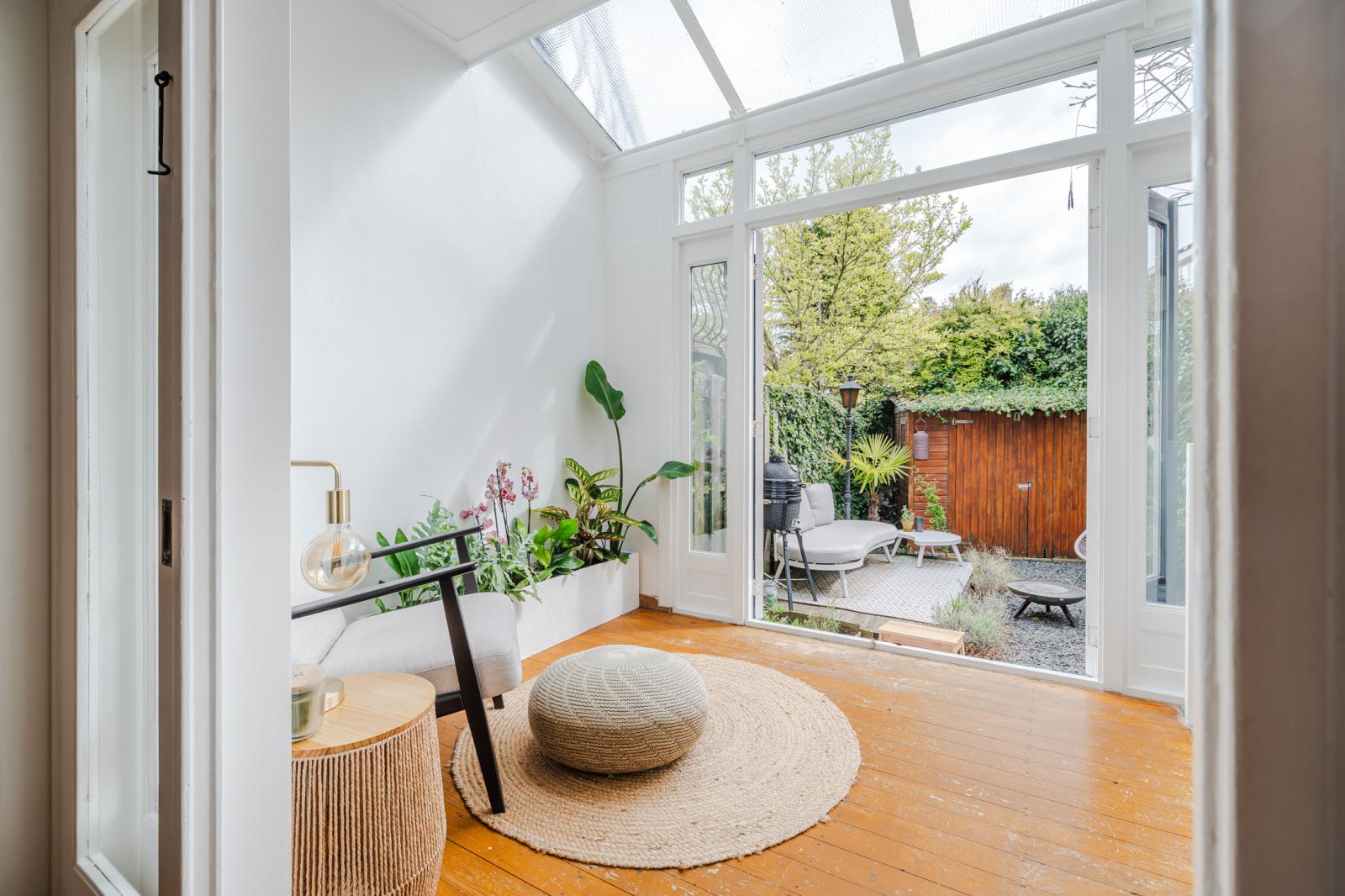 Aan de achterzijde bevindt zich naast de eetkamer, de serre: een fijne plek om je even terug te trekken, met uitzicht op het groen. De serre heeft openslaande deuren naar de tuin, waardoor op zonnige dagen de grens tussen binnen en buiten vervaagt. Dankzij het zorgvuldig aangelegde en volwassen groen ervaar je hier veel privacy - een beschutte plek waar je nauwelijks iets merkt van de omgeving. Ook in de winter blijft het uitzicht groen en sfeervol.