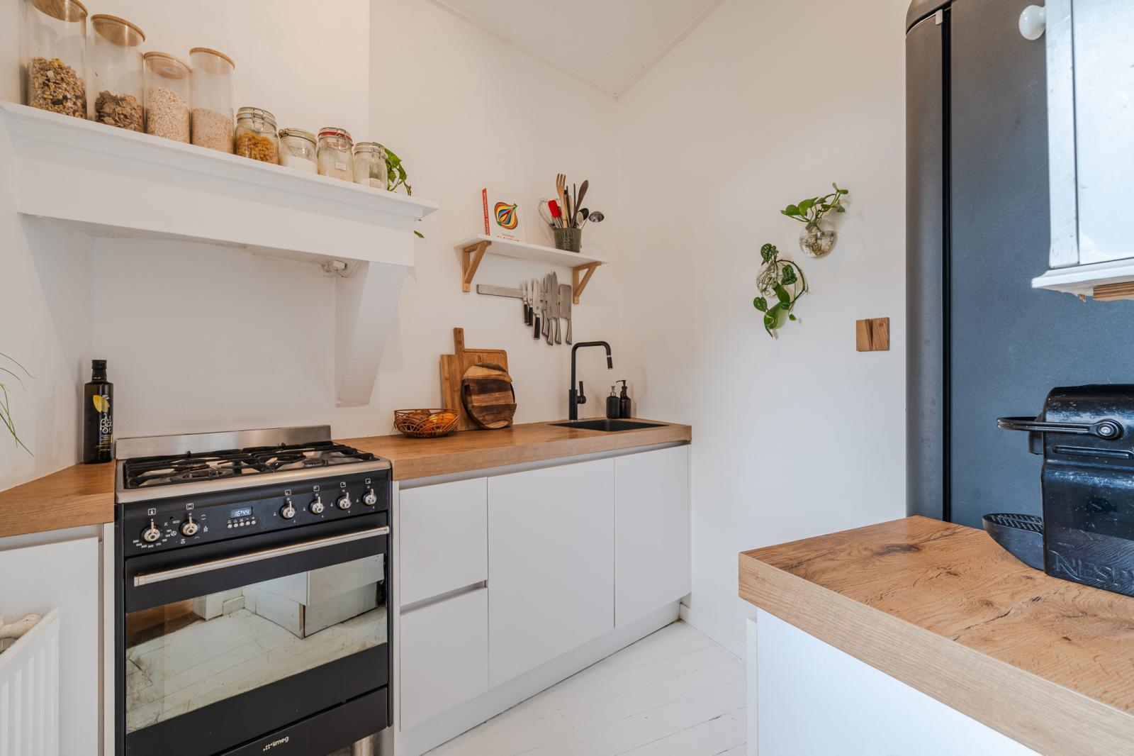 De keuken is strak vormgegeven en voorzien van hoogwaardige Smeg-apparatuur. Met directe toegang tot de tuin vormt dit de perfecte setting voor lange zomeravonden en ontspannen diners buiten.