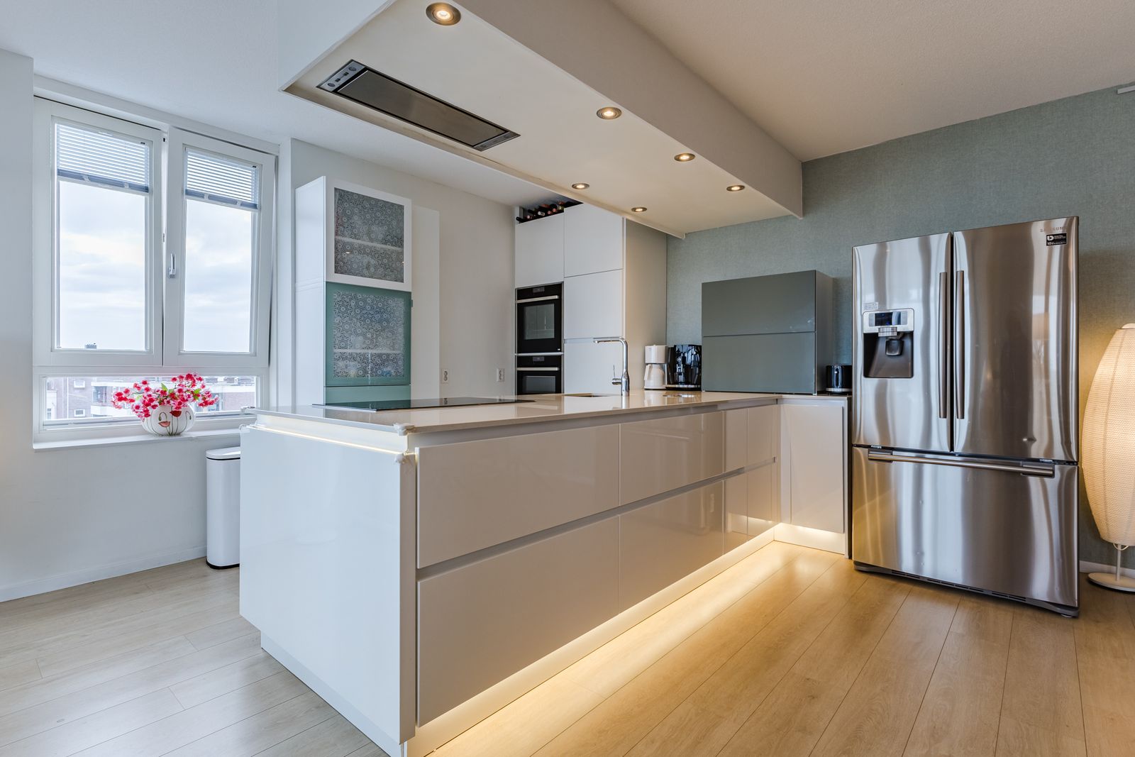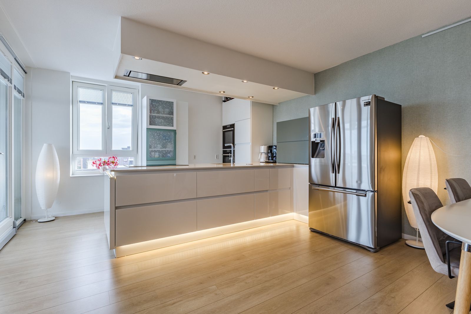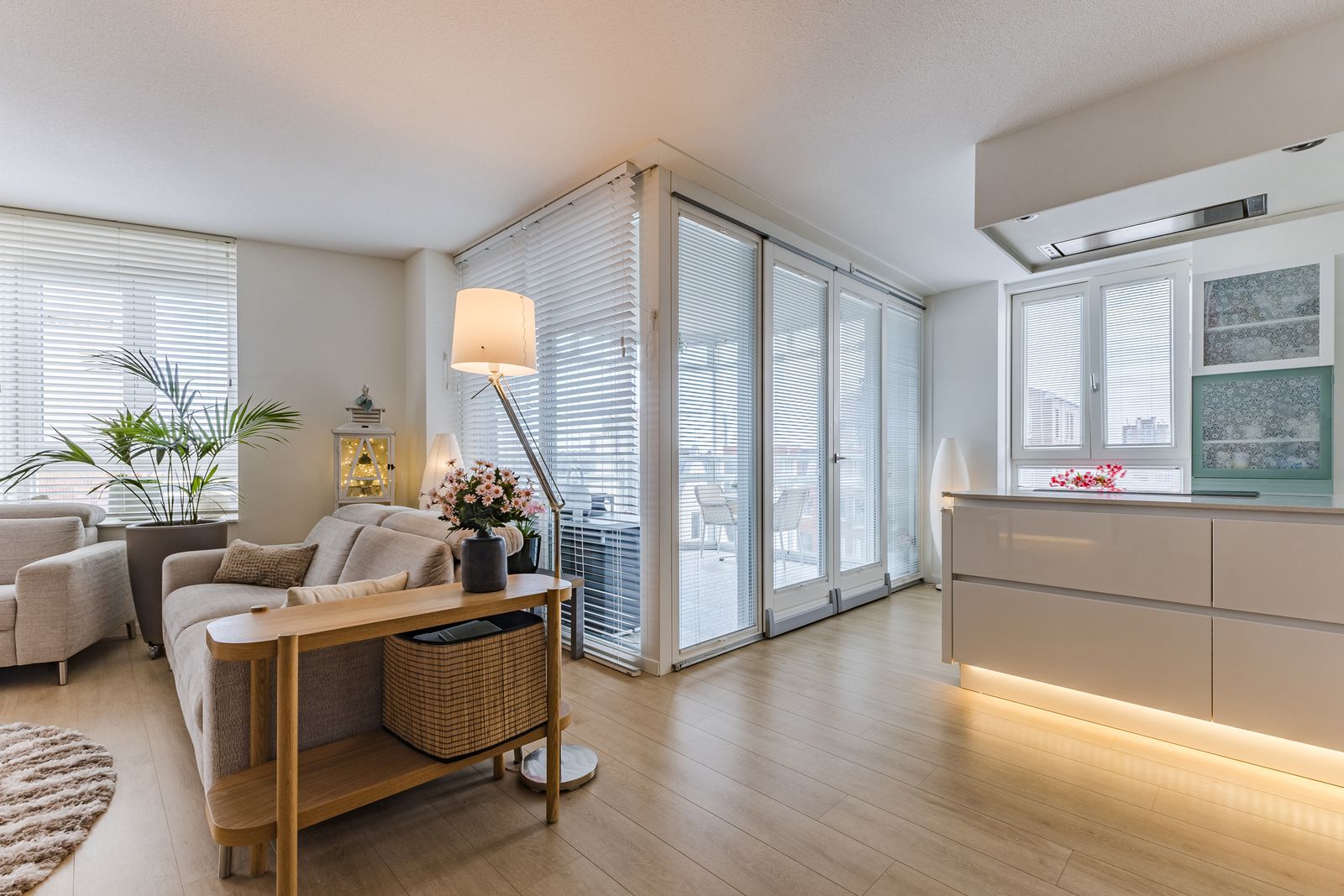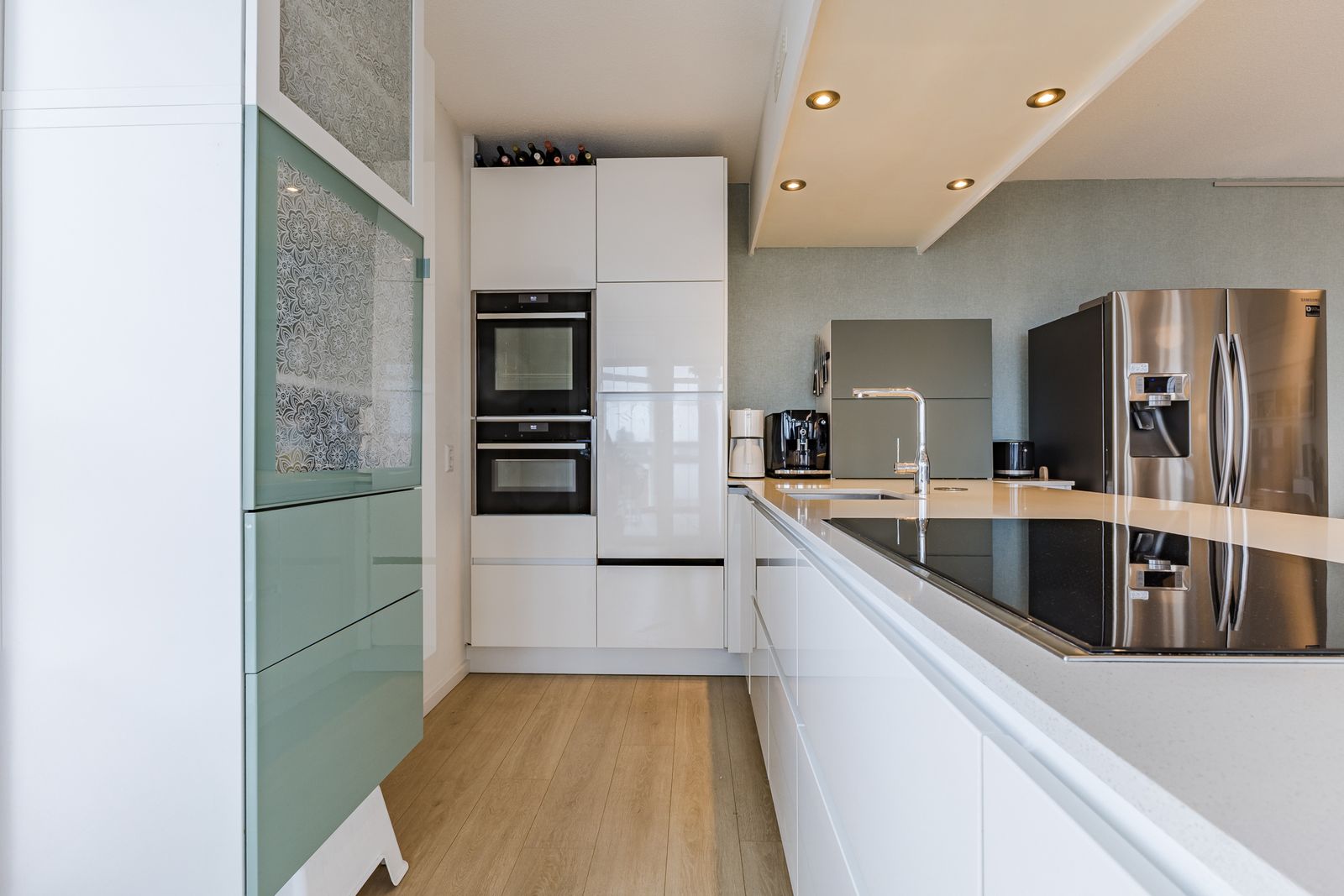 De ruime en lichte woonkamer met open keuken vormt het hart van de woning. Dankzij de grote raampartijen rondom is er de gehele dag een prachtige lichtinval en een panoramisch uitzicht.