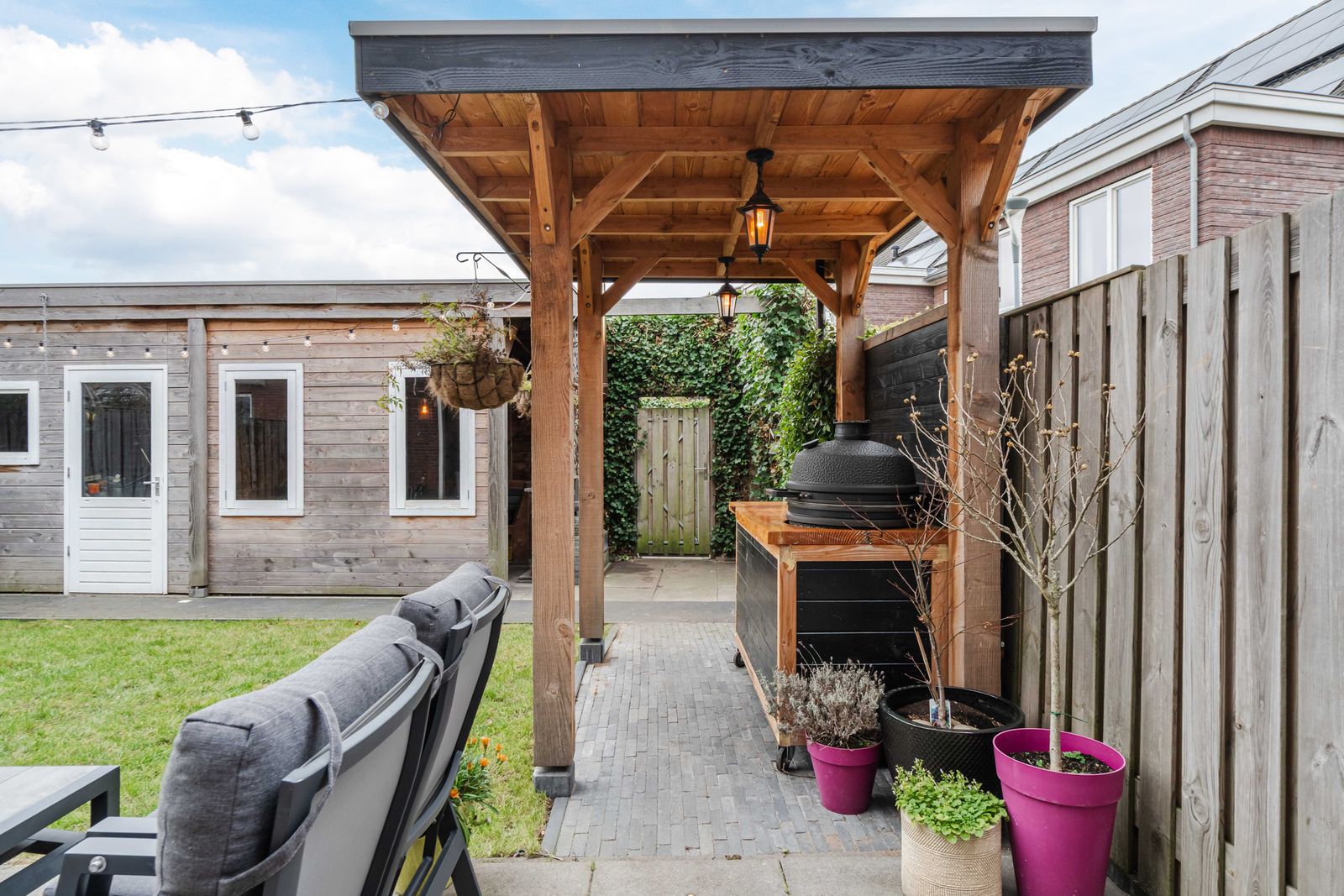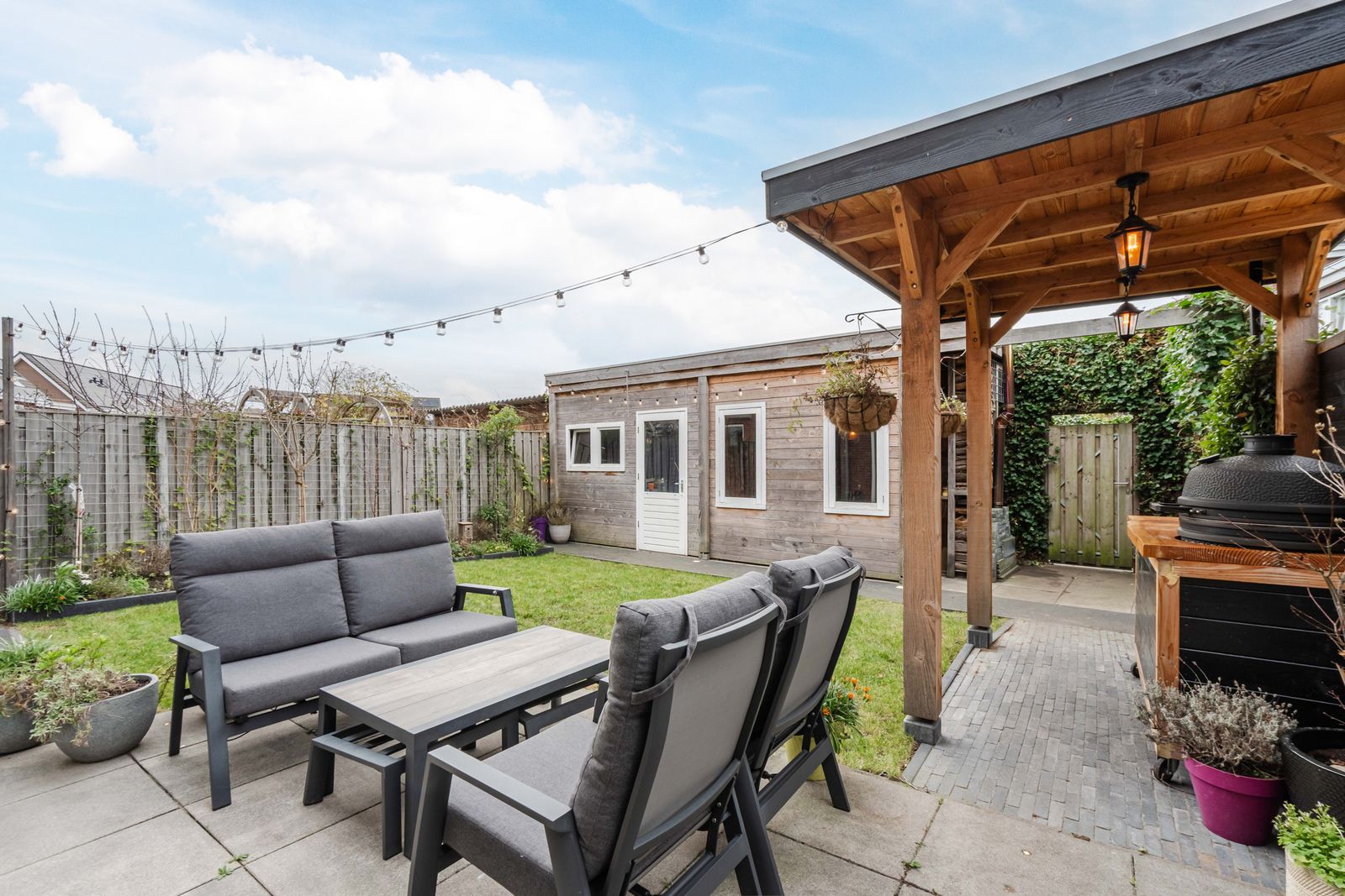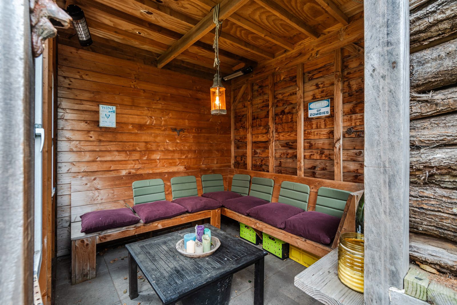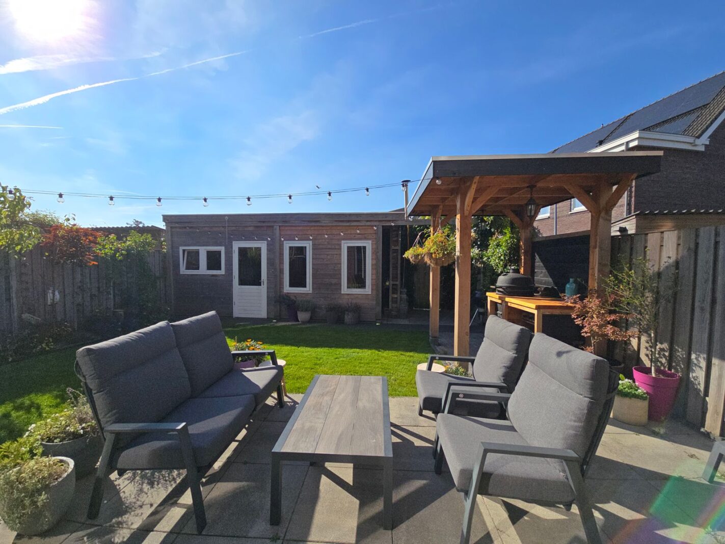 De woning heeft een diepe en brede tuin met volop zon, perfect voor spelende kinderen, loungesets, tuinfeesten of een moestuin. Het gemak van een achterom maakt het snel in en uitladen van uw boodschappen makkelijk. De twee privé parkeerplaatsen op het achtergelegen parkeerterrein (Eigen terrein van de bewoners met actieve VVE, jaarbijdrage onderhoud, € 210) zijn zo eenvoudig toegankelijk. De tuin heeft verder nog een overdekte ‘lounge area’ met houtkachel en zithoek en een overdekte buitenkeuken. Daarnaast is er nog een ruime schuur voor het opslaan van (tuin) spullen of het uitvoeren van een hobby, diverse mogelijkheden gezien de praktische ruimte.