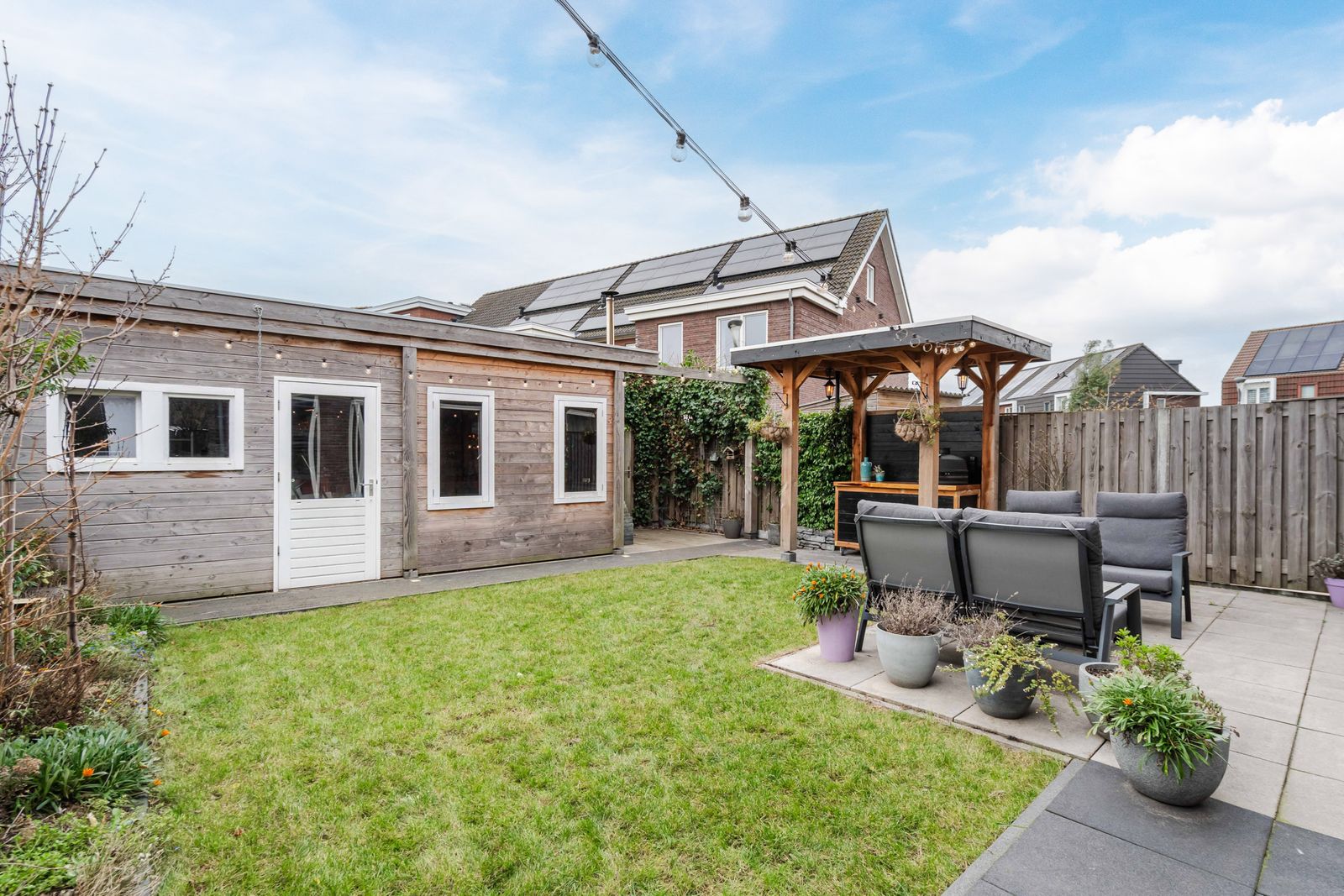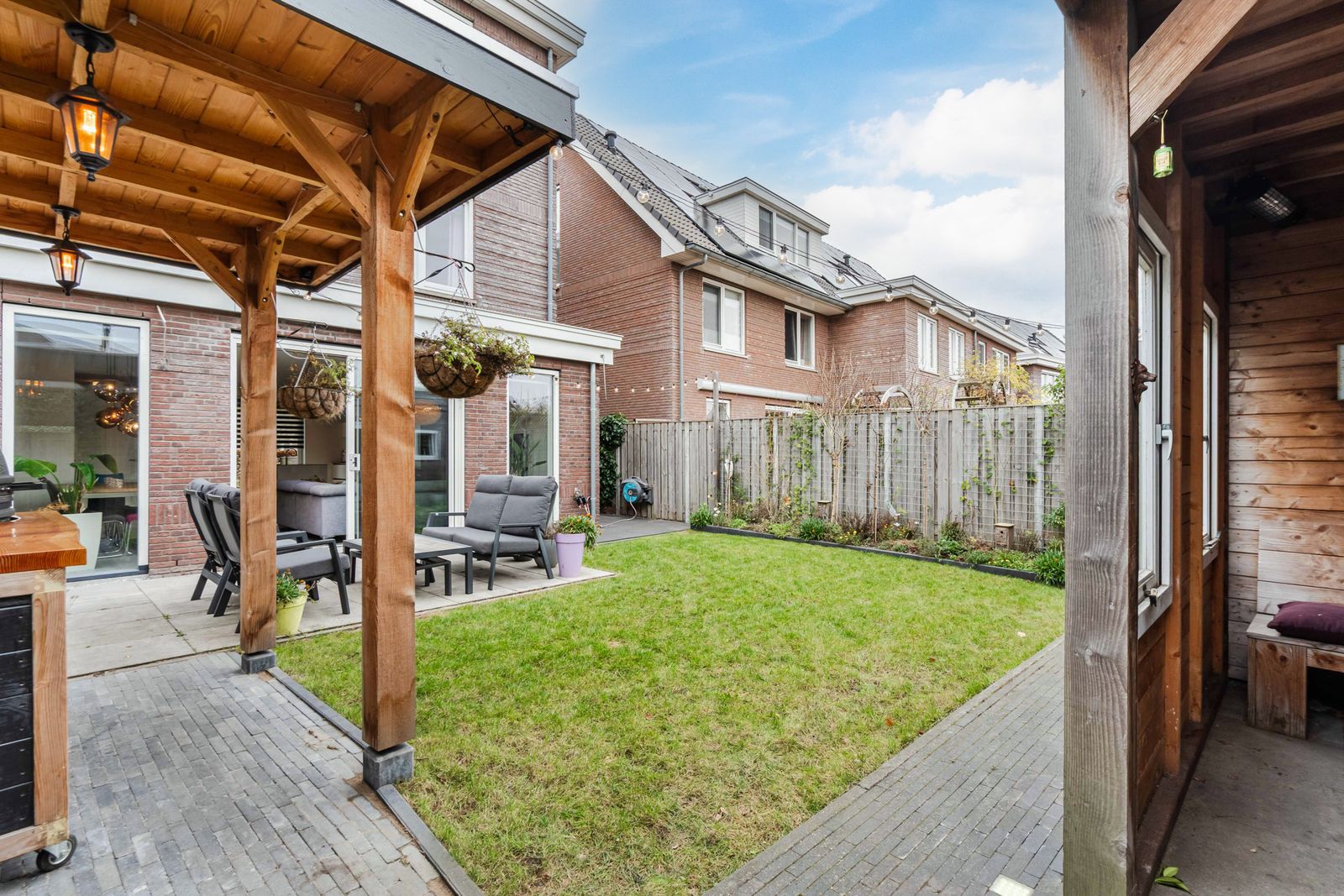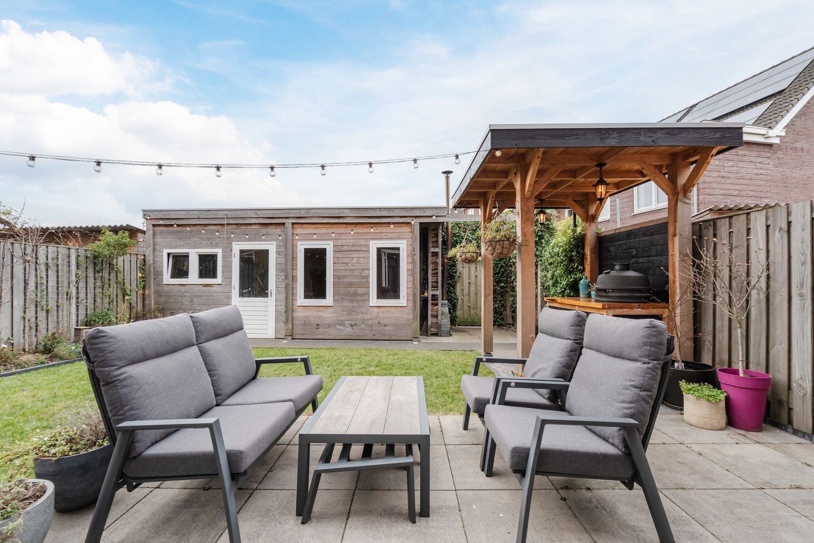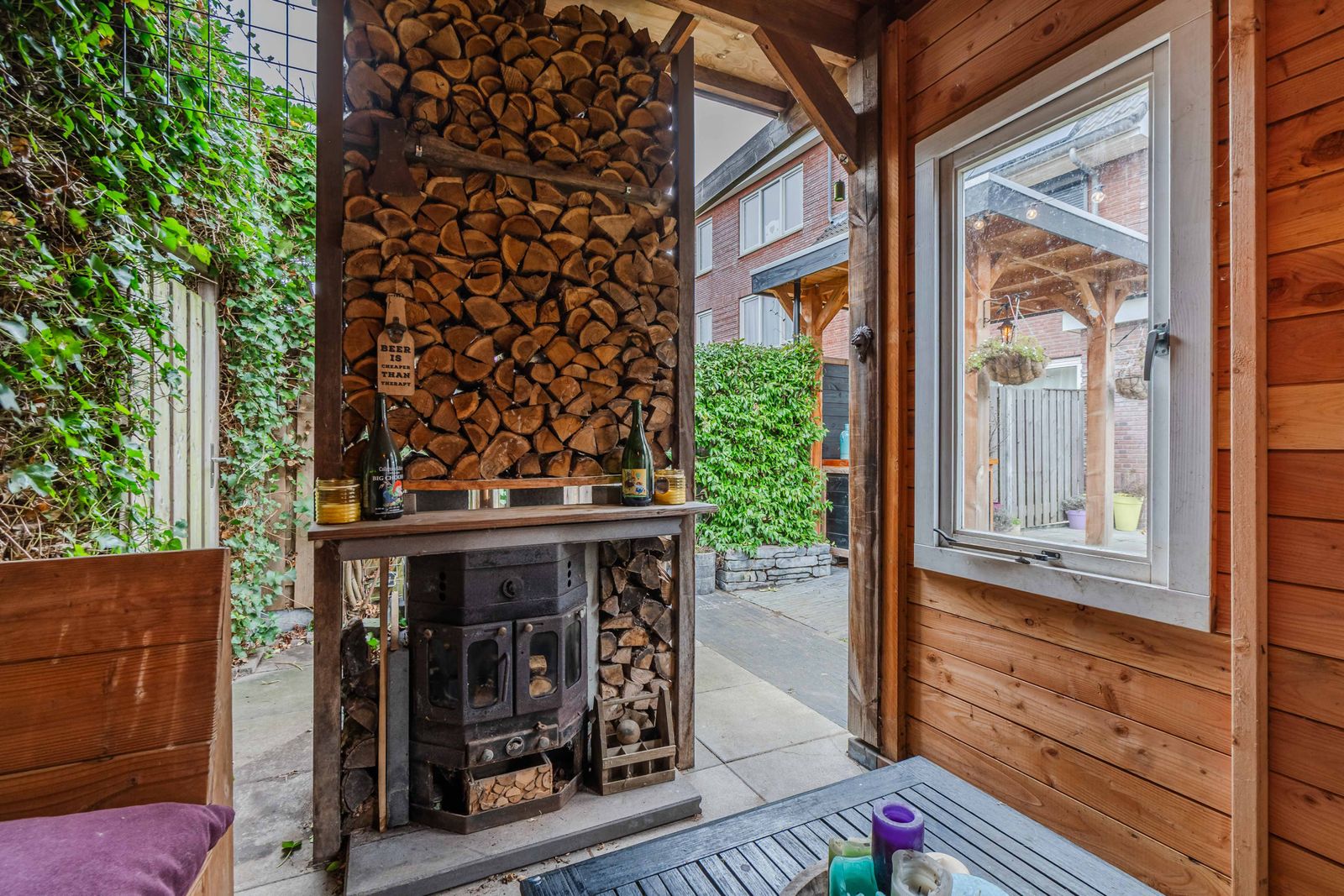 De woning heeft een diepe en brede tuin met volop zon, perfect voor spelende kinderen, loungesets, tuinfeesten of een moestuin. Het gemak van een achterom maakt het snel in en uitladen van uw boodschappen makkelijk. De twee privé parkeerplaatsen op het achtergelegen parkeerterrein (Eigen terrein van de bewoners met actieve VVE, jaarbijdrage onderhoud, € 210) zijn zo eenvoudig toegankelijk. De tuin heeft verder nog een overdekte ‘lounge area’ met houtkachel en zithoek en een overdekte buitenkeuken. Daarnaast is er nog een ruime schuur voor het opslaan van (tuin) spullen of het uitvoeren van een hobby, diverse mogelijkheden gezien de praktische ruimte.