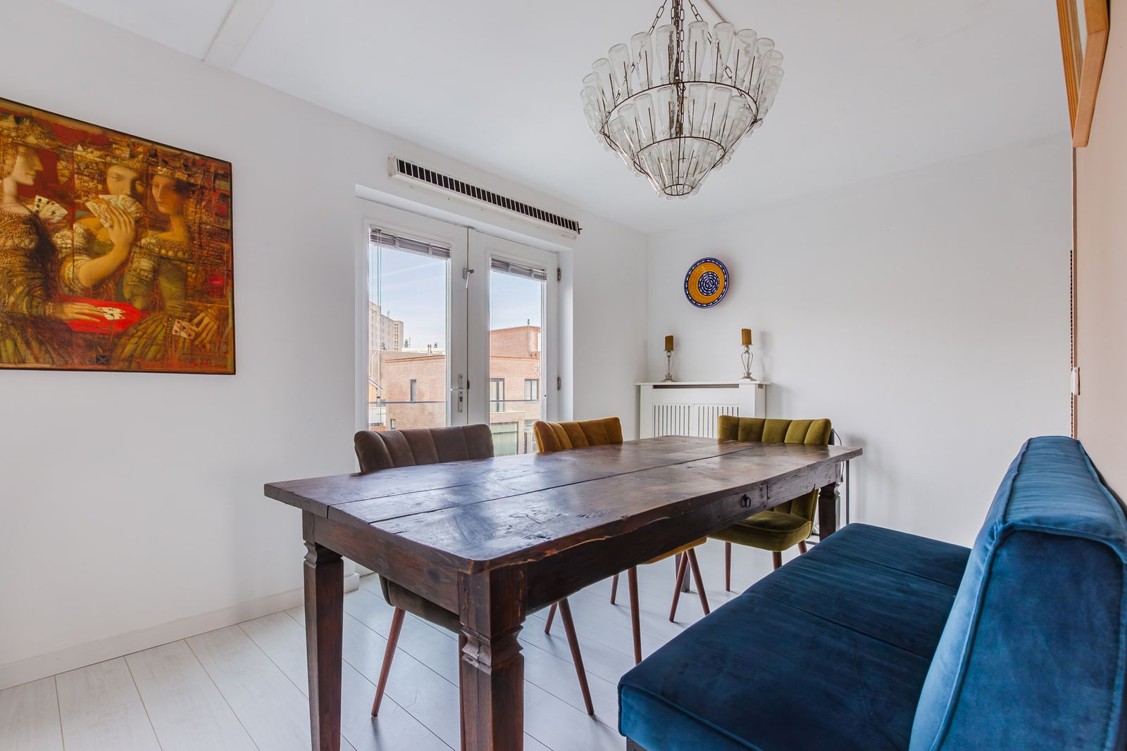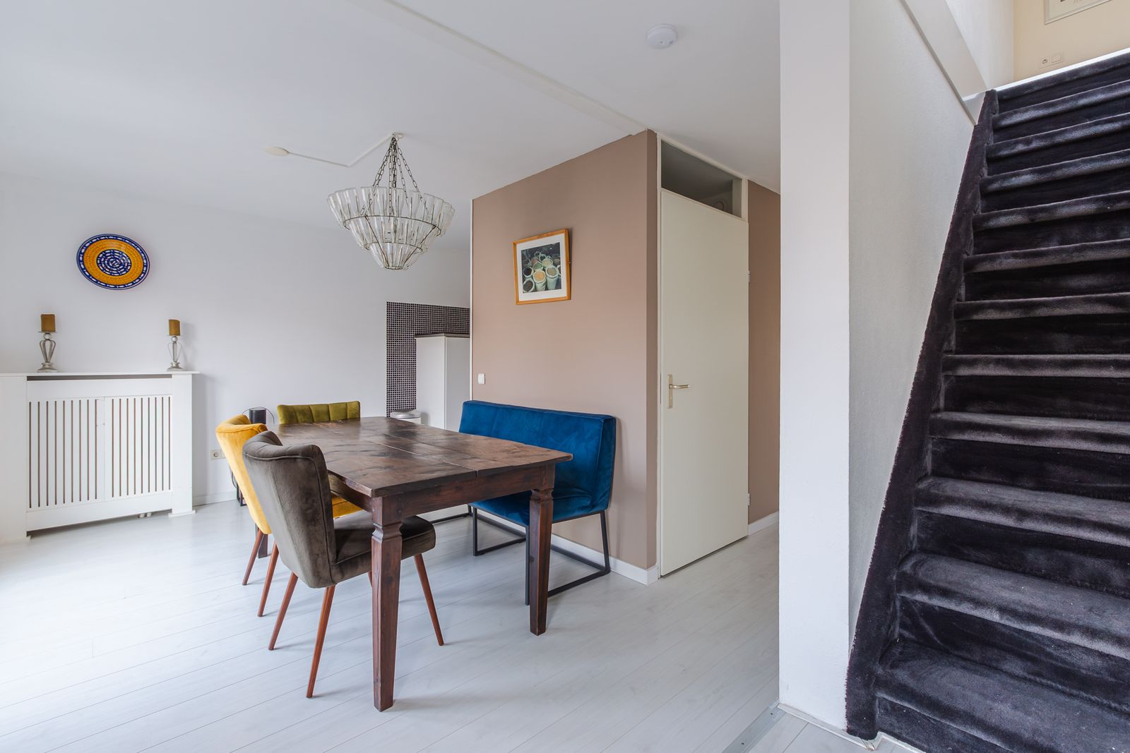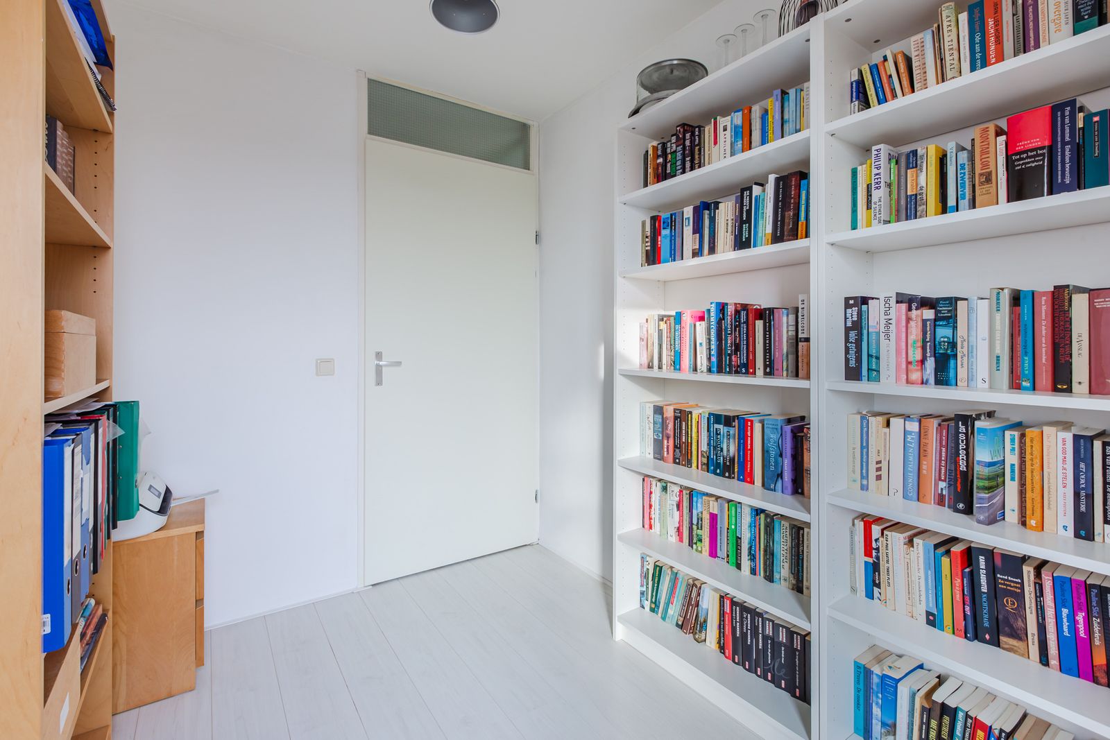 De eerste verdieping heeft aan de voorzijde een knusse eetkamer en aan de achterzijde een royale huiskamer met openslaande deuren aan een balkon met fraai uitzicht. Tevens een toilet en aparte ruimte voor de wasmachine en droger. Ook is er een zeer verrassende, aan het zicht onttrokken, garderobe- annex bergingsruimte. De strak gestuukte wanden zijn in juni 2025 opnieuw in de verf gezet.