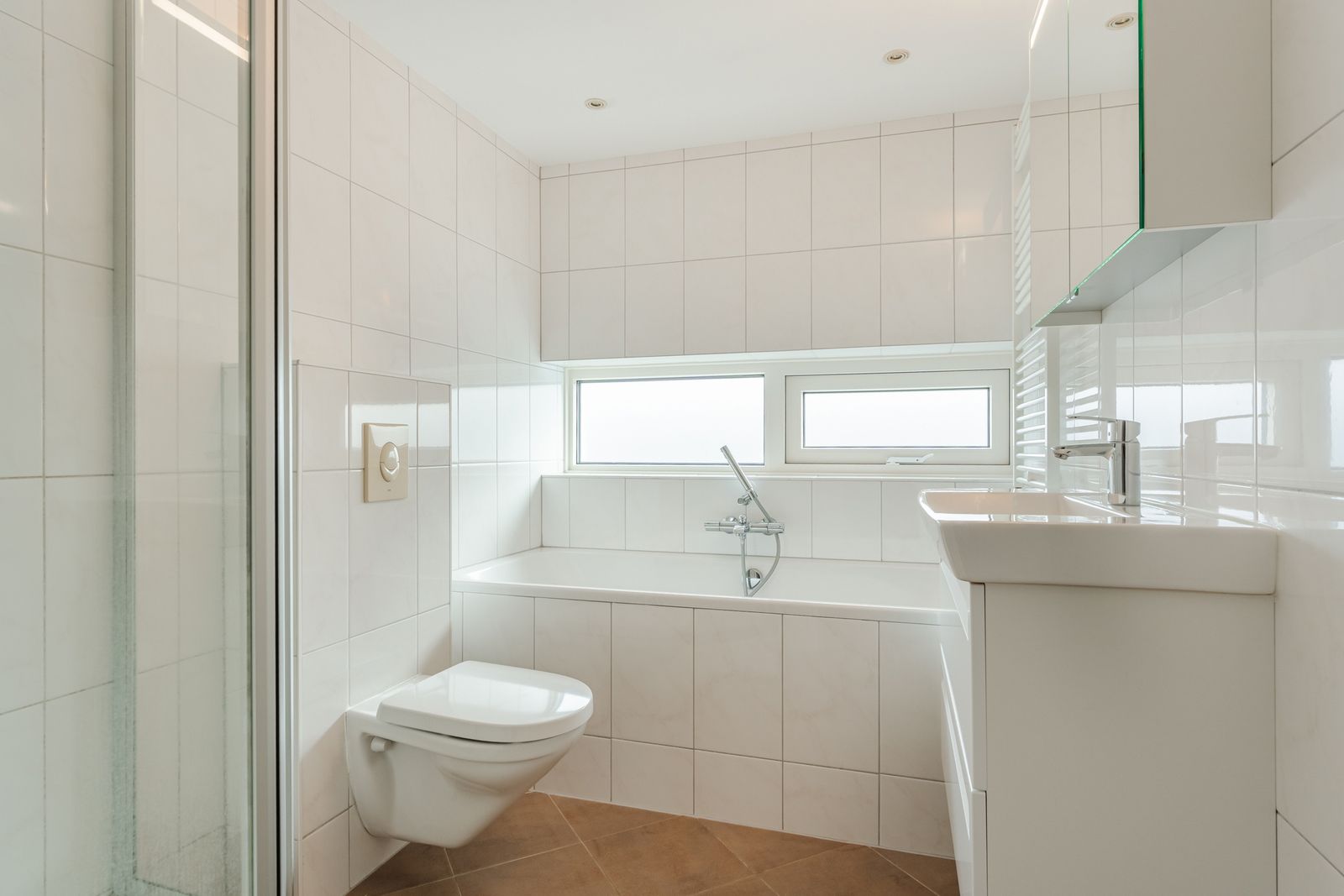 Overloop met toegang tot 3 slaapkamers, waarvan 2 zeer ruime kamers, en de nette badkamer. De badkamer is voorzien van een ligbad, douche, wastafel, tweede toilet en mechanische ventilatie. Gehele eerste etage is in 2024 voorzien van nieuwe kunststof kozijnen.