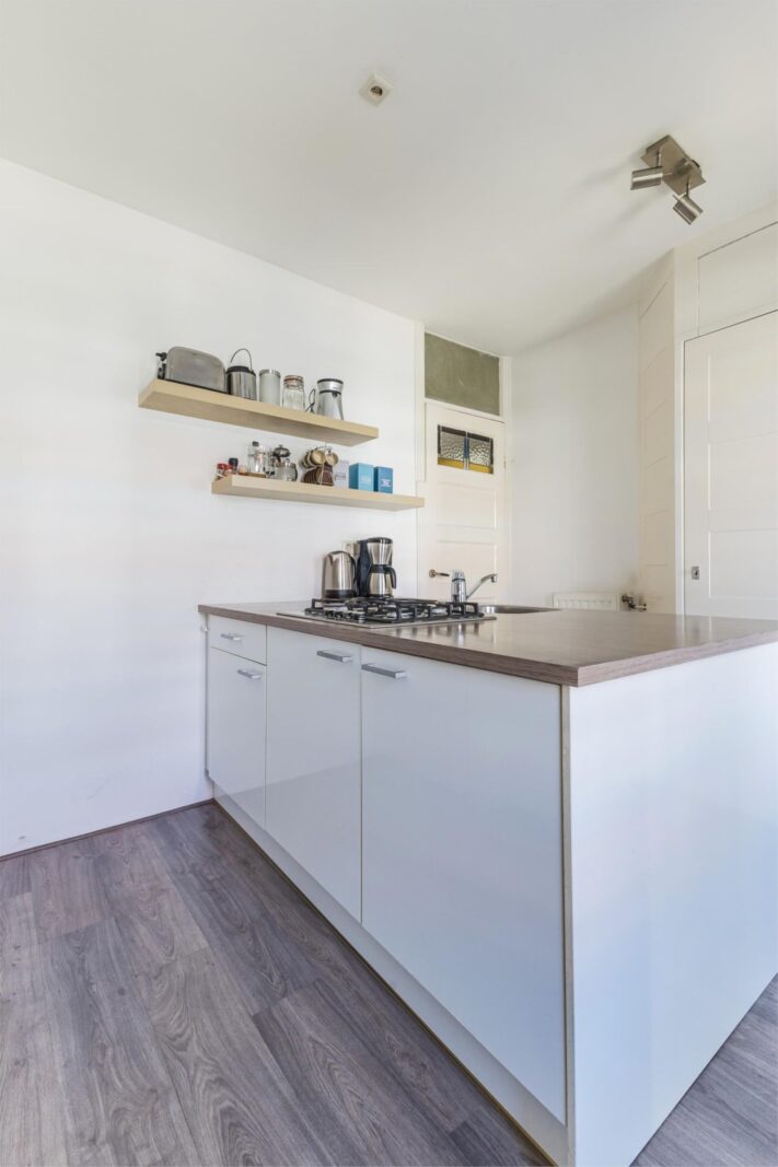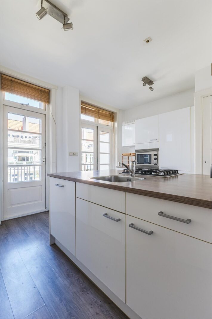 Entrance on the 2nd floor, from the hall access to the kitchen, front and back living room and separate toilet. From the front living room access to the bedroom and bathroom. The kitchen gives access to the typical Amsterdam balcony, and two fixed cupboards for the CV and water and gas meters. The CV was cleaned and inspected in 2025.