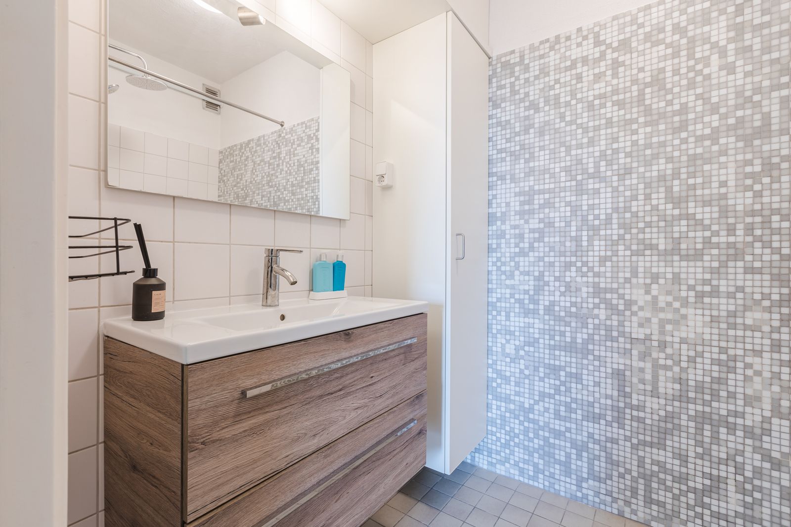 De badkamer is uitgerust met een douche en een in 2023 geplaatst wastafelmeubel.