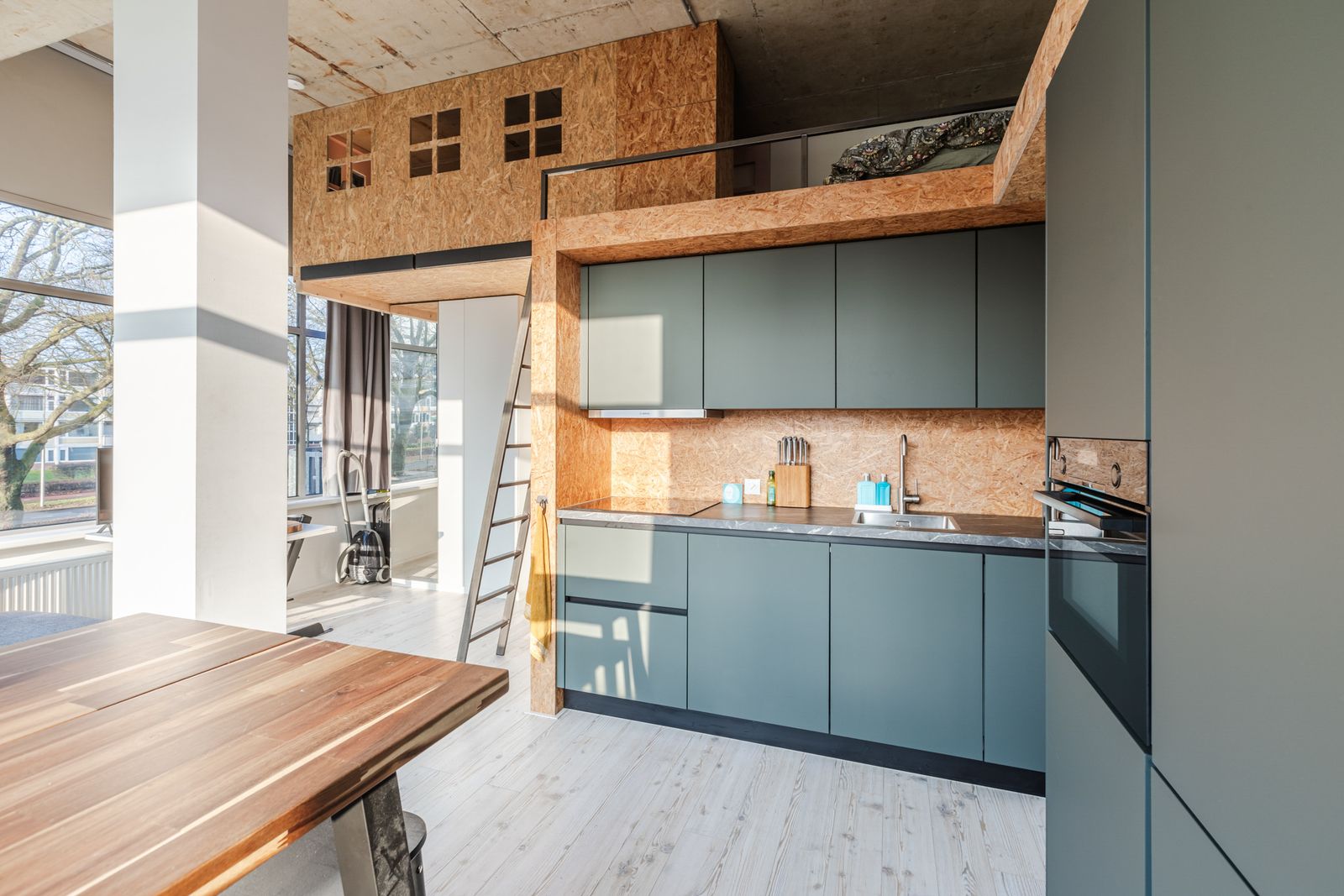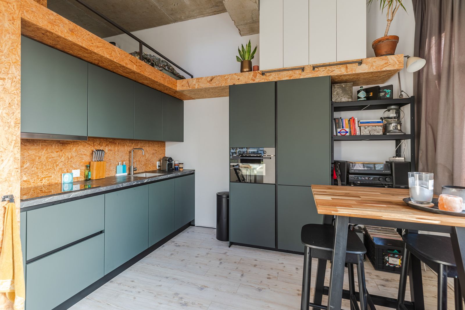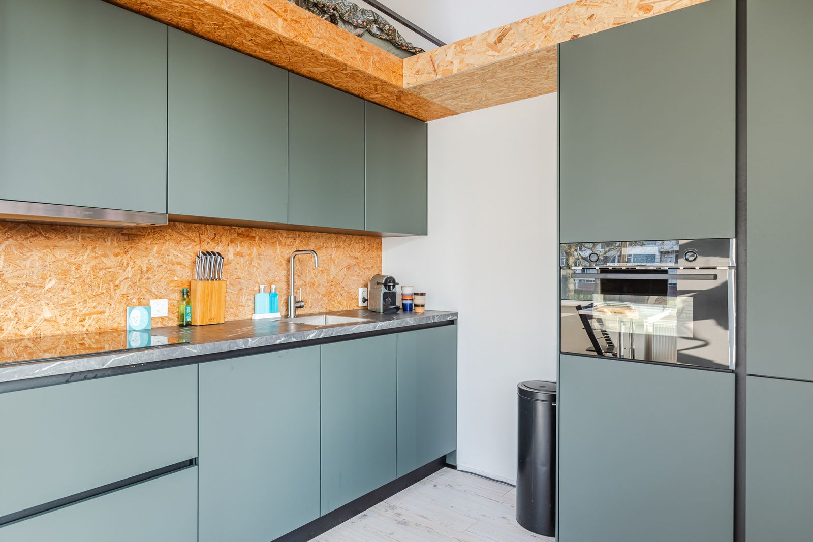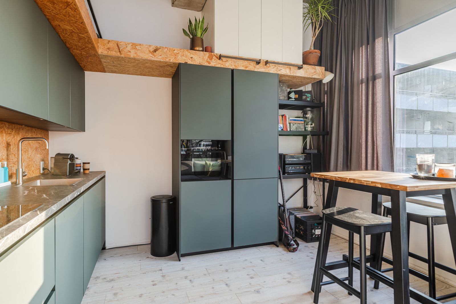 Een complete keuken die perfect past bij de moderne, industriële uitstraling van de studio.
