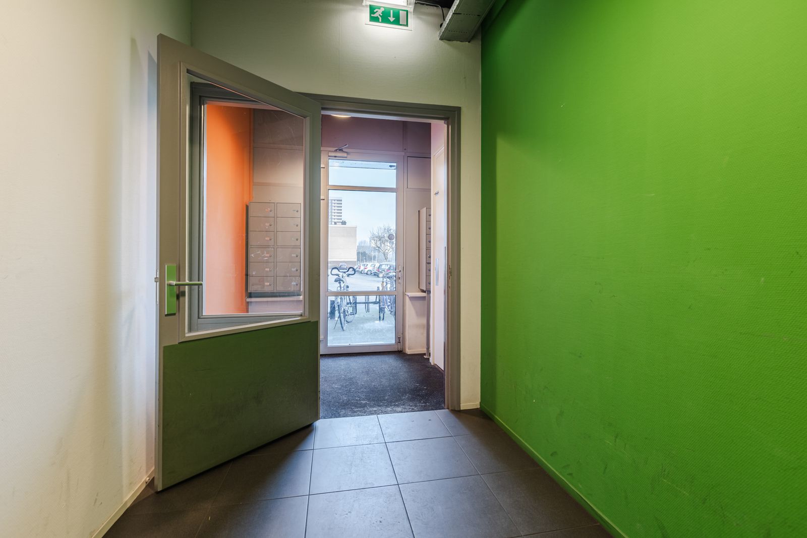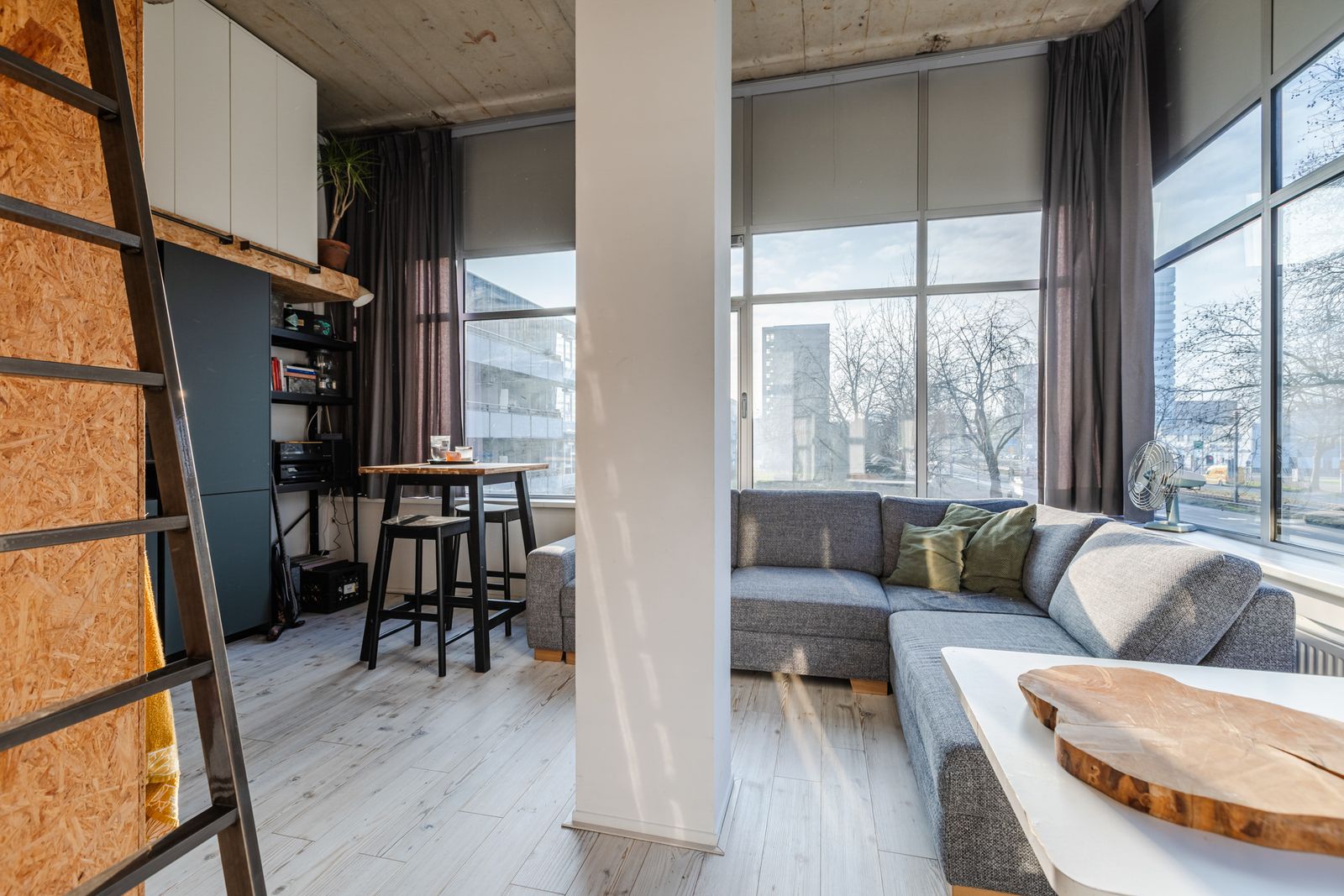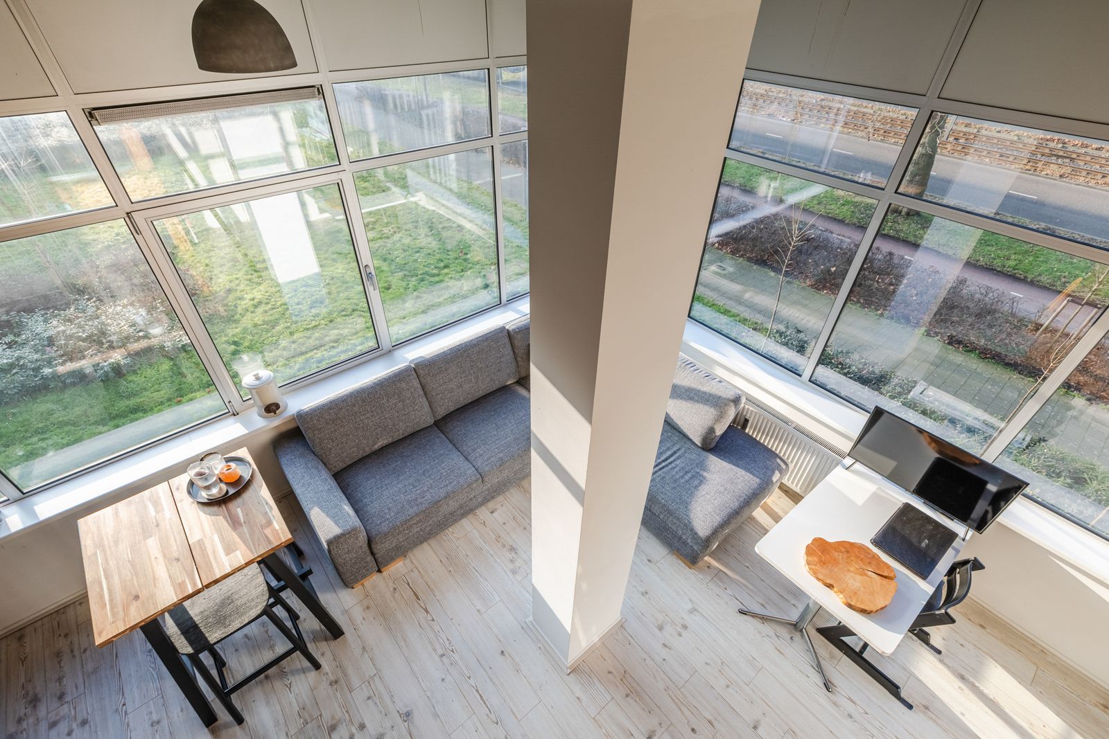 De studio is gelegen op de eerste verdieping en bevindt zich in een rustig deel van het gebouw, waar alleen bewoners komen die er daadwerkelijk moeten zijn. De hoge ruimte en grote raampartijen zorgen de hele dag voor veel daglicht en een prettige woonbeleving.