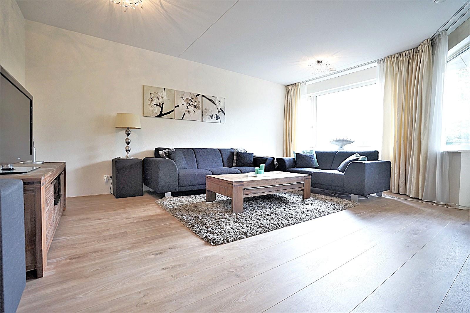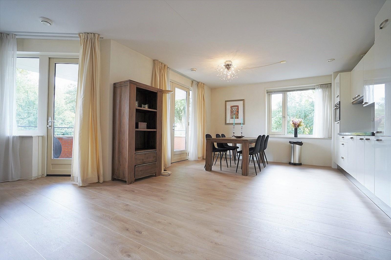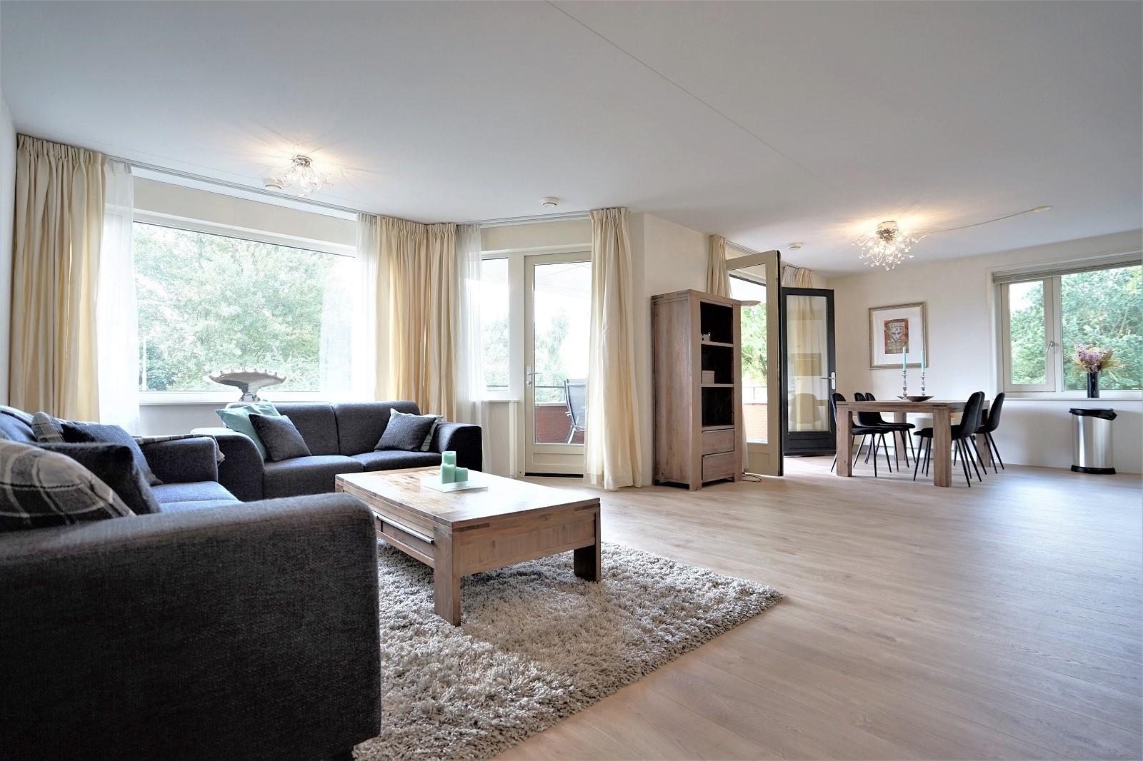 De ruime en lichte woonkamer beschikt dankzij de hoekligging over extra zijramen en biedt via twee deuren toegang tot het royale terras op het zuidoosten.