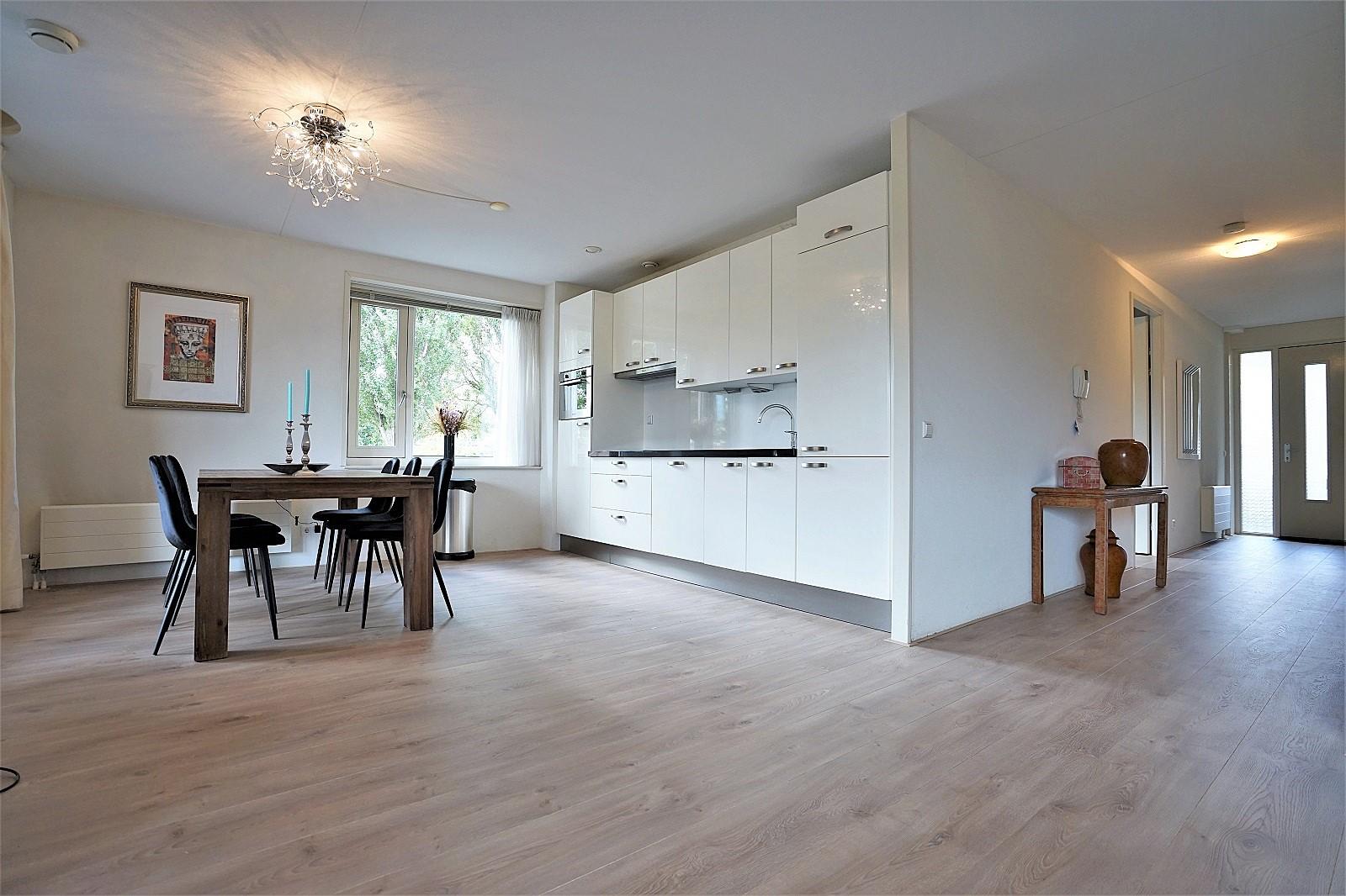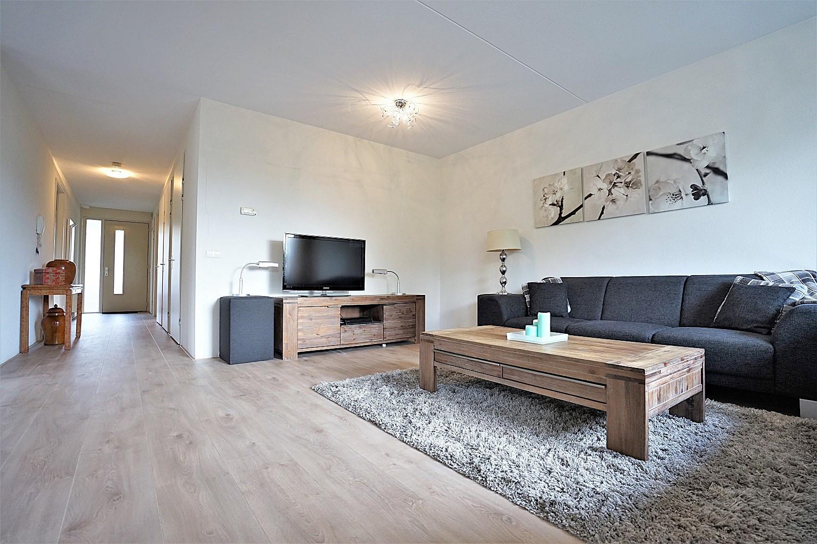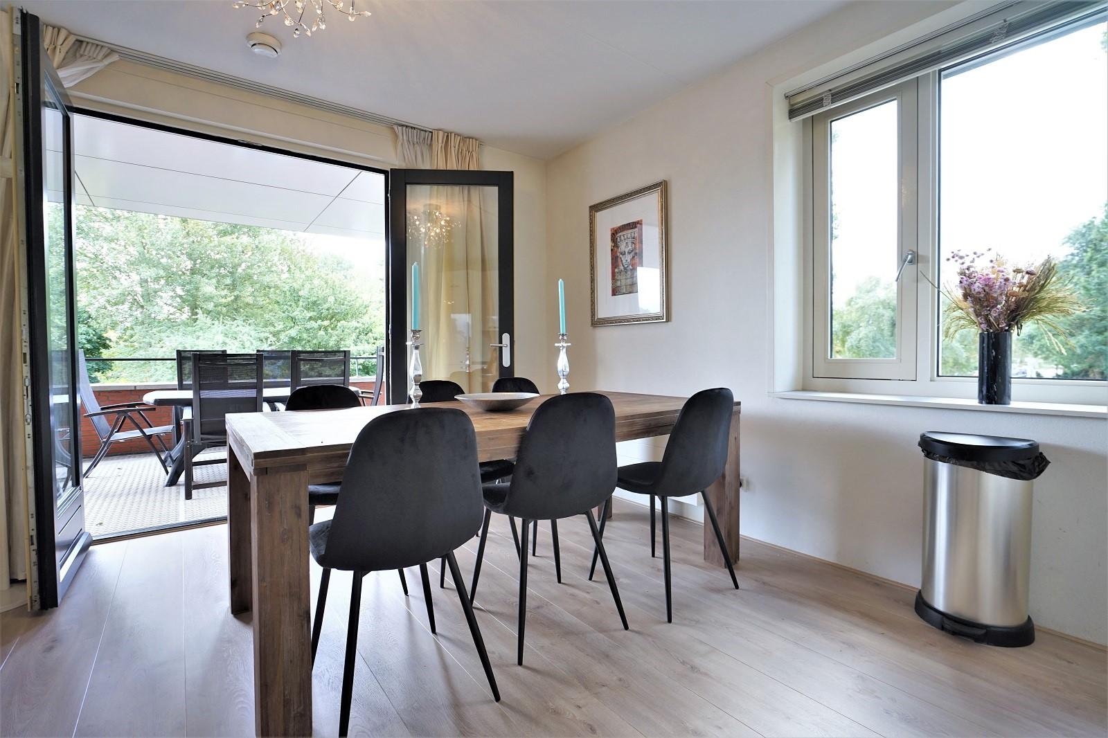De ruime en lichte woonkamer beschikt dankzij de hoekligging over extra zijramen en biedt via twee deuren toegang tot het royale terras op het zuidoosten.