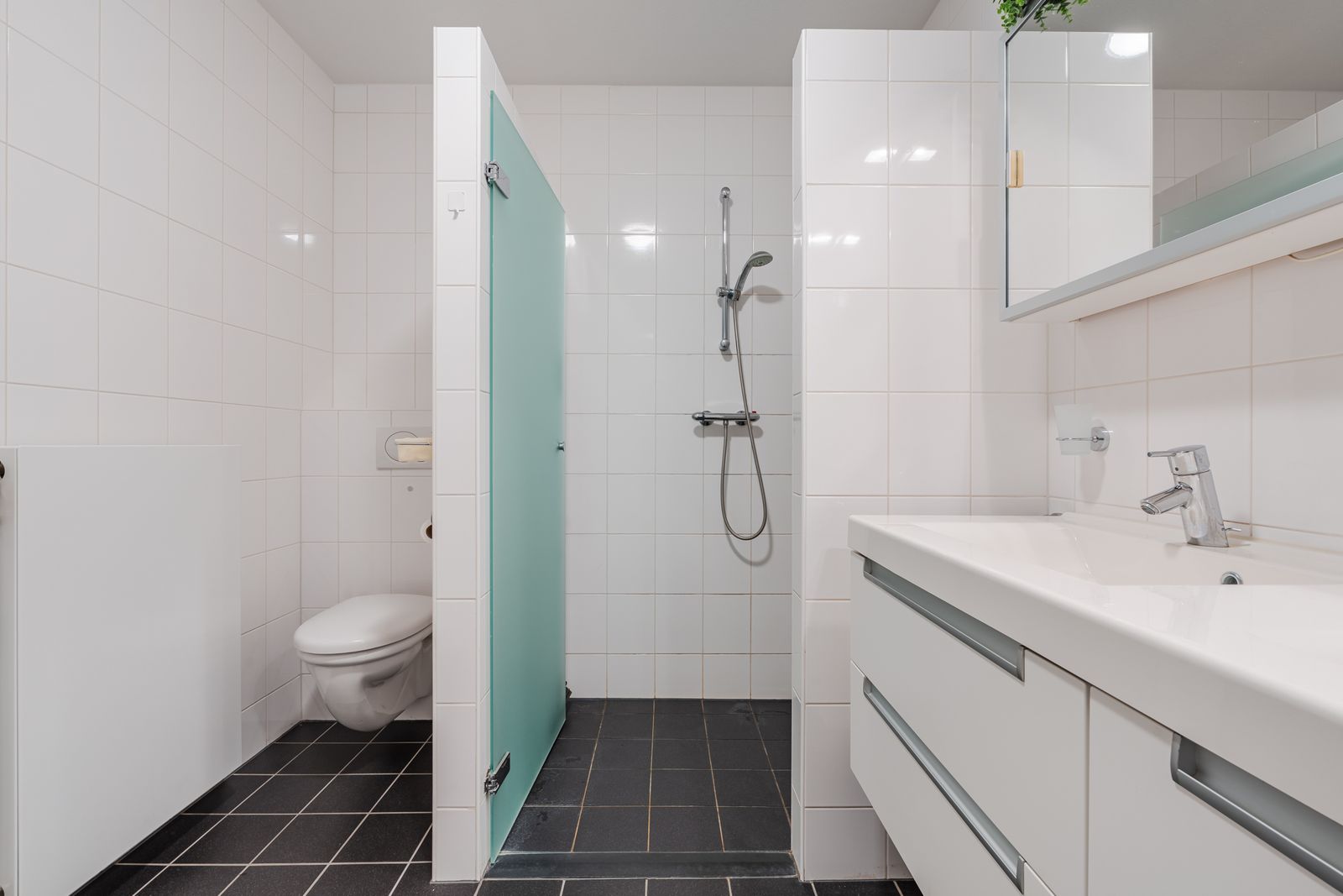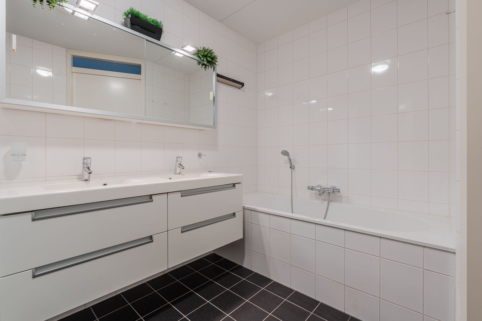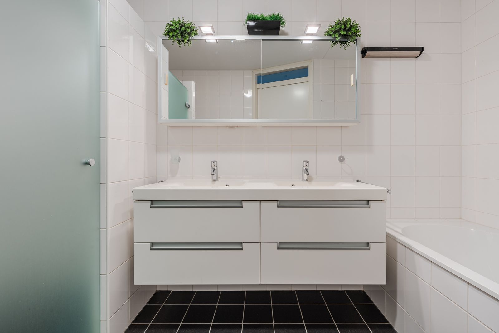 De badkamer is voorzien van een moderne dubbele wastafel met onder- en bovenkasten , spiegels en vloerverwarming. Voorts een toilet , een inloopdouche met glazen deur en een groot ligbad.