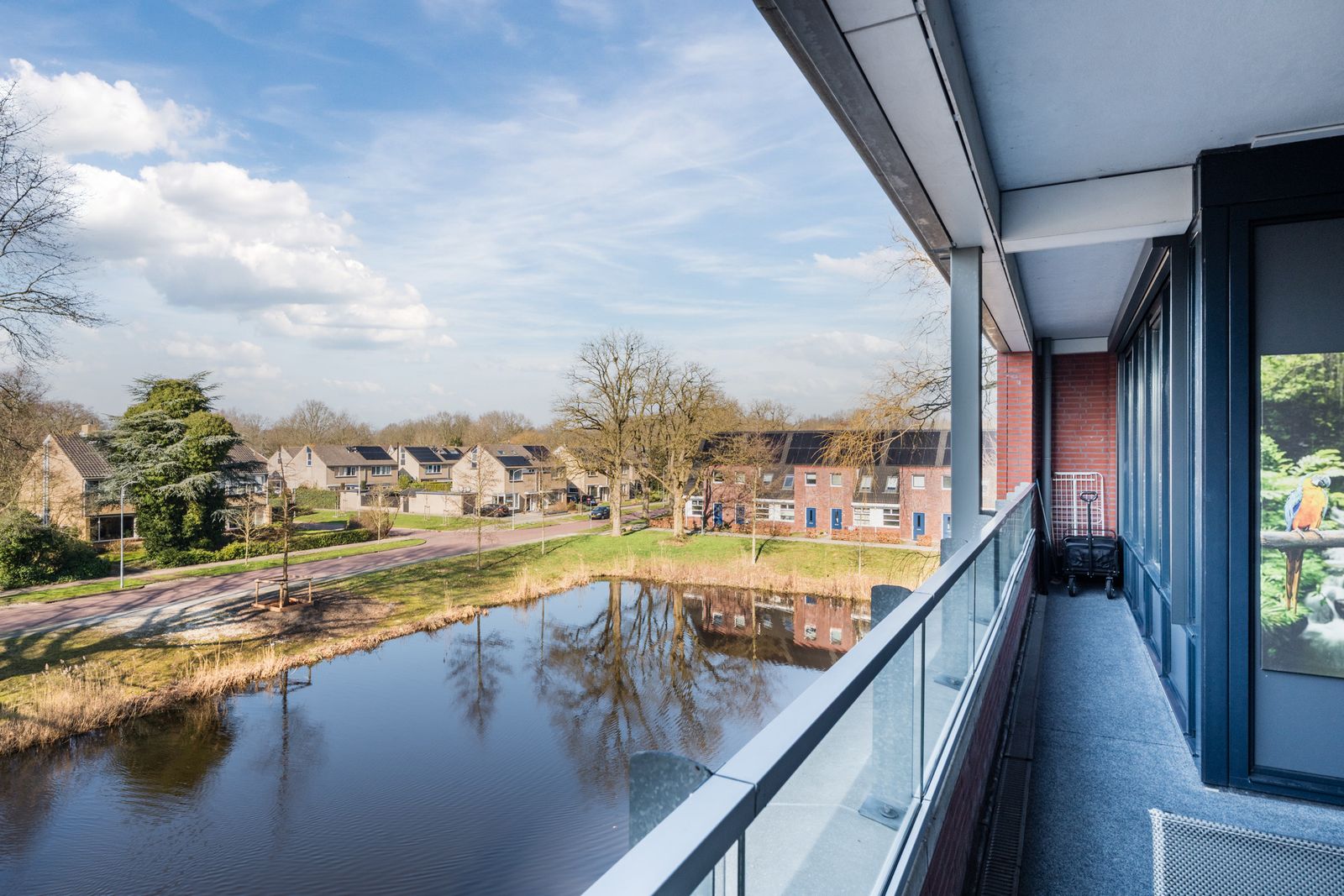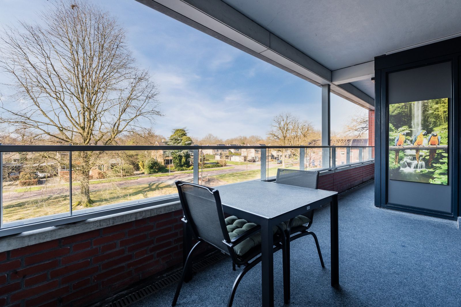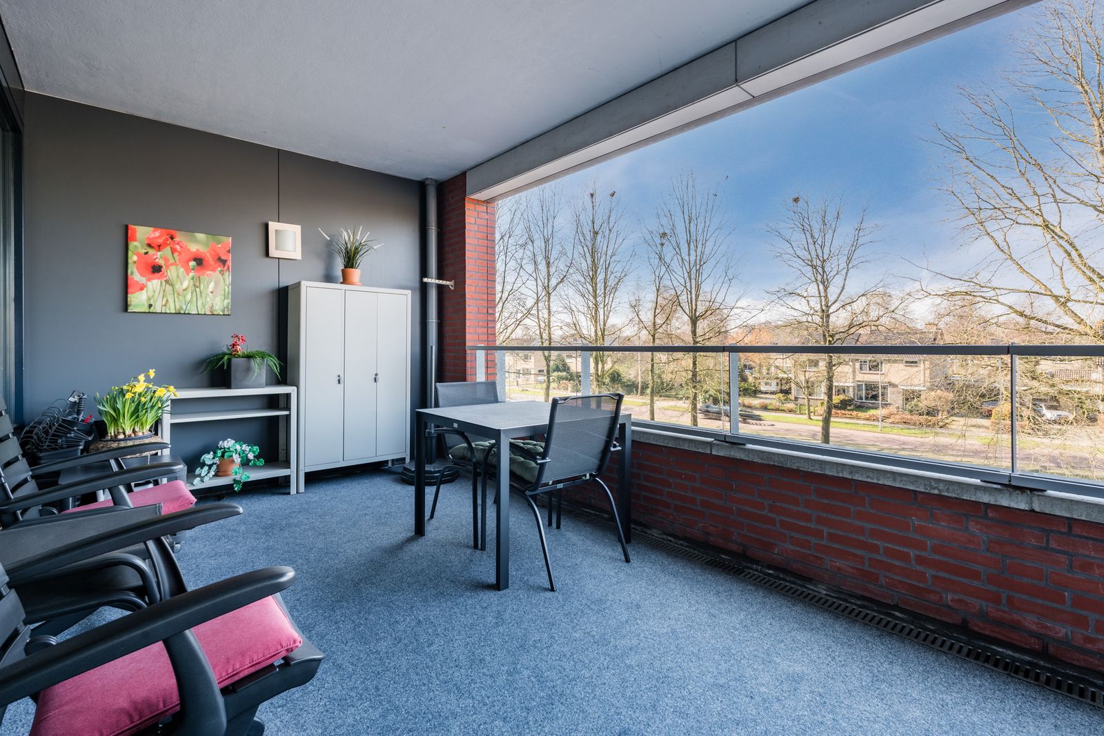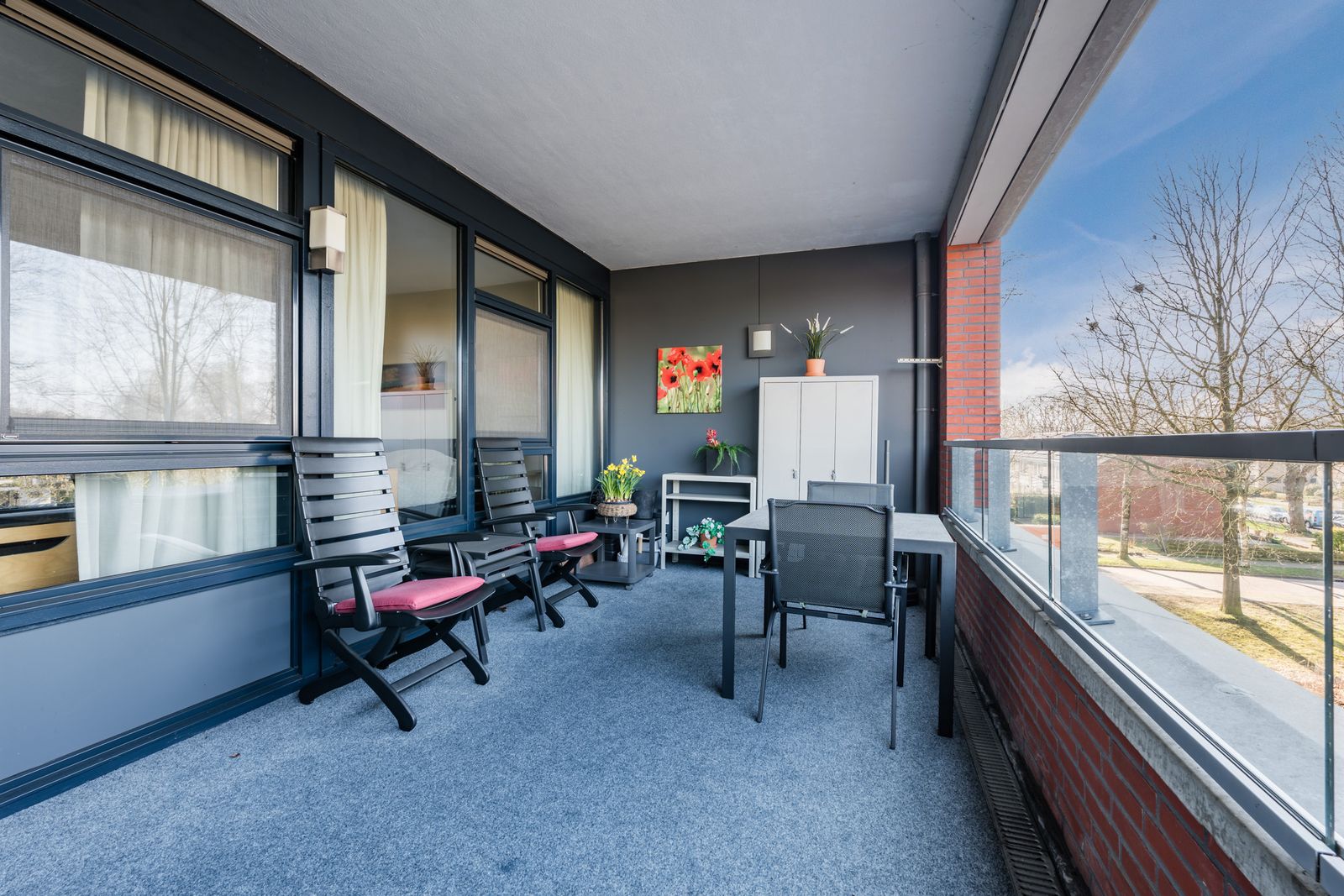 Het ruime balkon op het zuid westen is geheel belegd met tapijt.