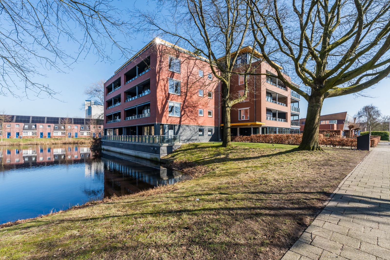Fraaie ligging op het zuid westen; het gebouw rijst aan twee zijden uit het water.