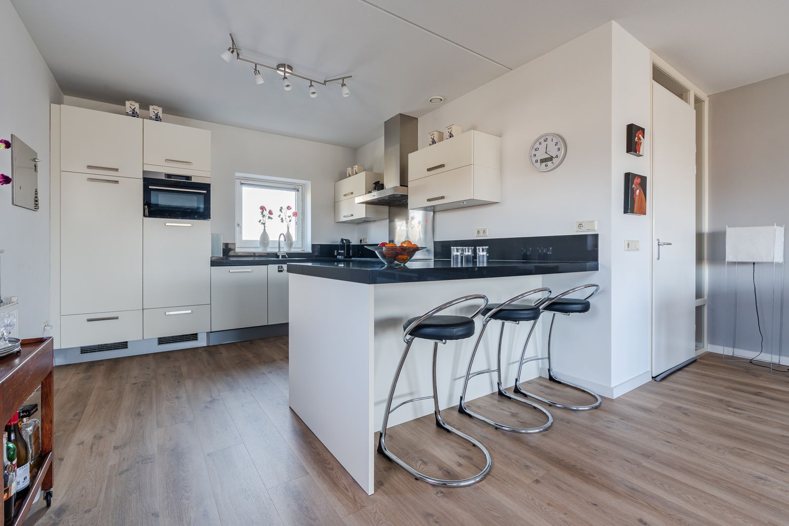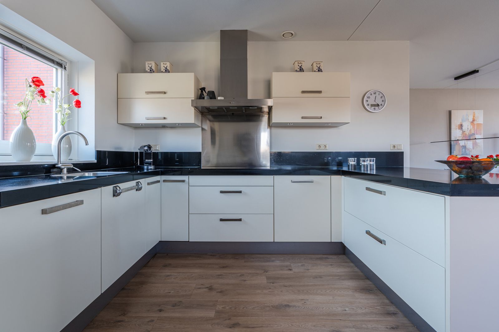 De grote woonkamer met luxe open keuken , gebroken wit met zware zwarte natuurstenen bladen, 5 inductiekookplaten waarvan 1 wokplaat ( 2019 ) , grote koelkast en een vrieskast ( 2022), vaatwasser ( 2020 ) en een combi magnetron/oven ( 2020).