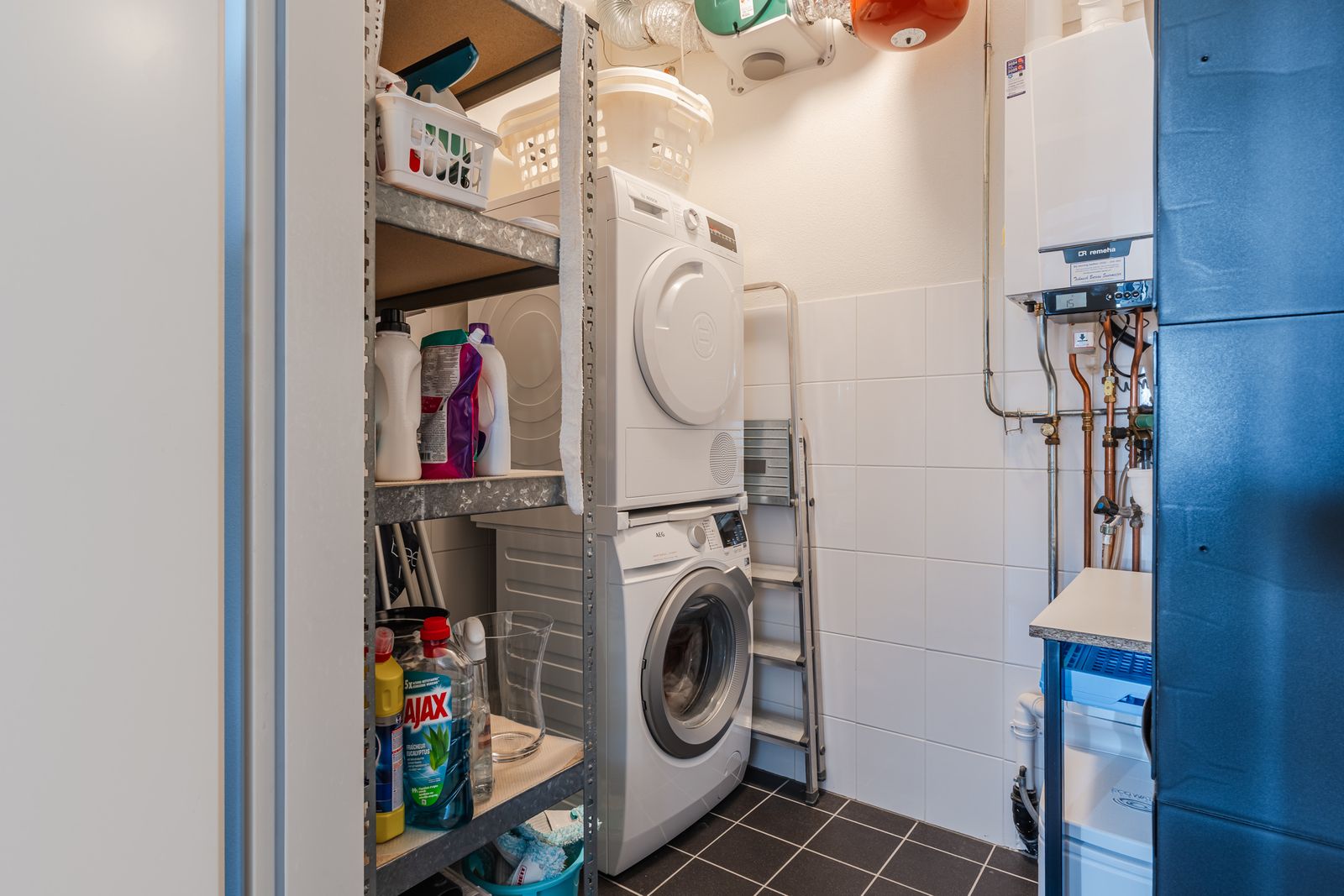 U komt binnen in de hal met de meterkast, een garderobekast , een toilet met fonteintje en de hal geeft tevens toegang tot de bijkeuken met een waterontharder, de aansluitingen voor de was- machine en de droger en met stellingen voor opslag.