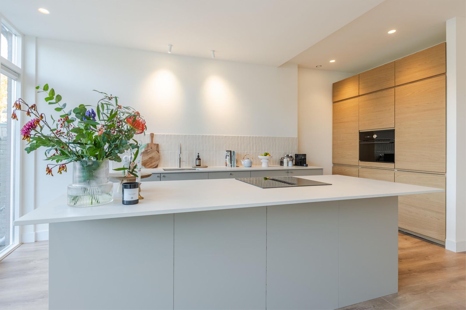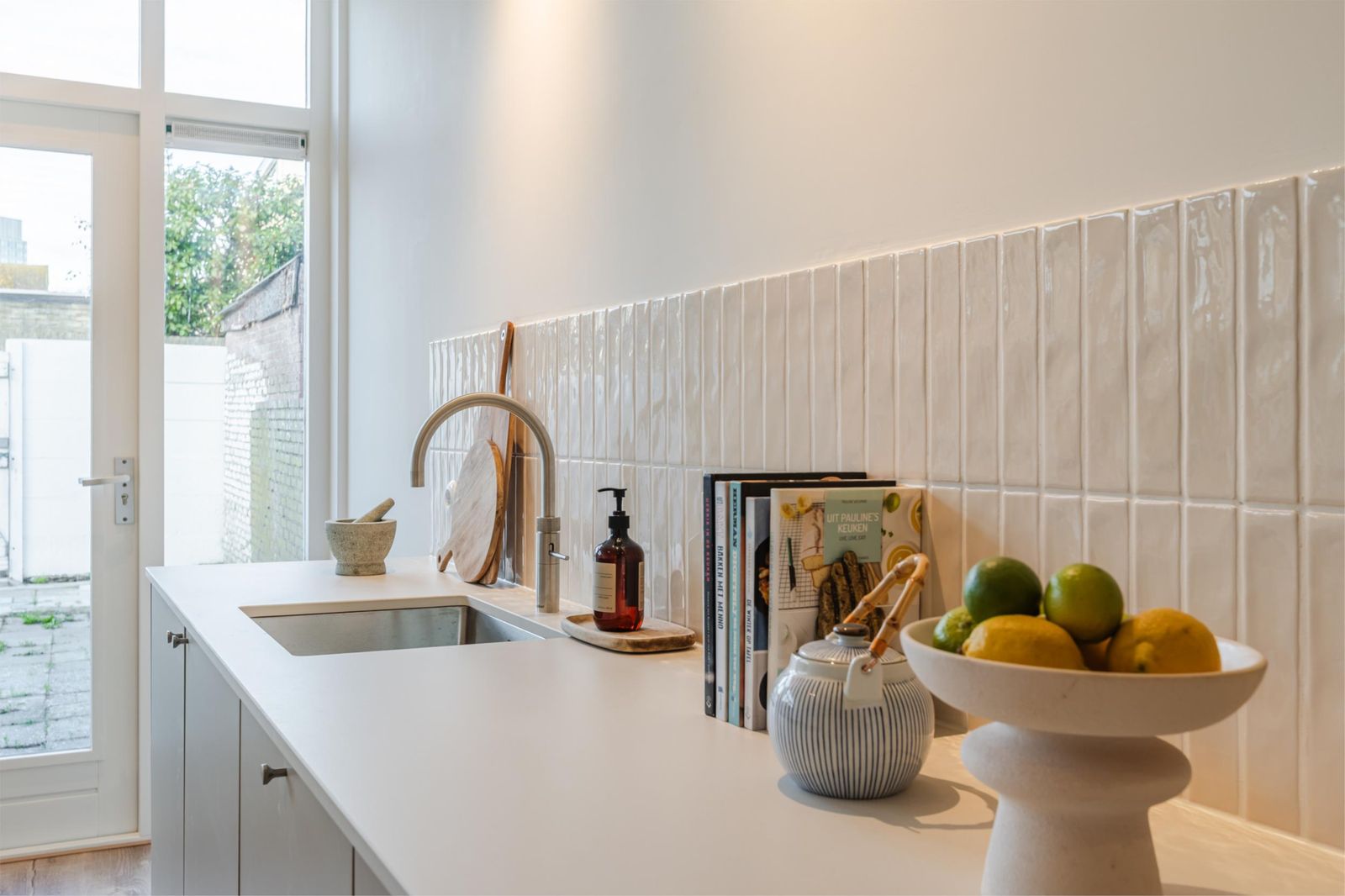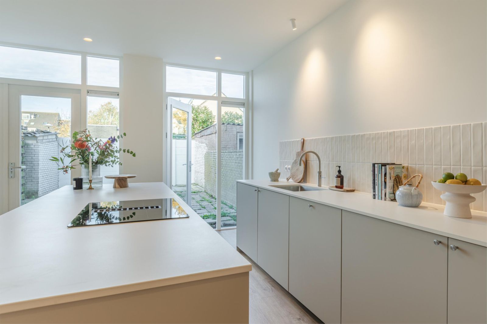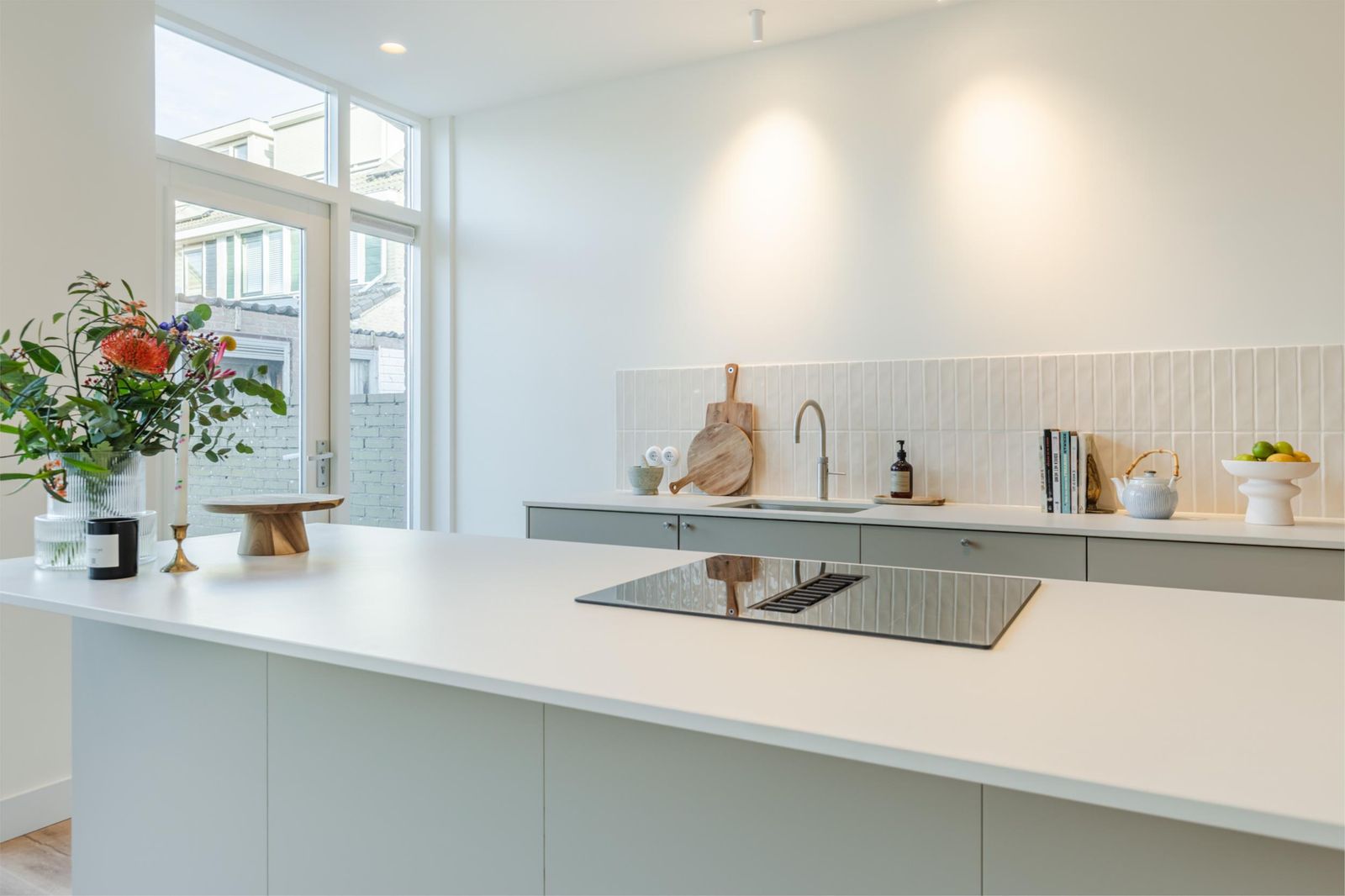 The house has a front garden and is entered through the characteristic front door. The entrance hall features original wall tiles, a stair cupboard, a toilet, and the possibility of creating a wardrobe. The hallway leads to the bright living room. The living room features smooth plasterwork, neutral flooring, and ceiling lights. The entire ground floor has underfloor heating. From the living room, you have access to the spacious kitchen with a cooking island (Dekton worktop) and is equipped with all modern built-in appliances. These include a Quooker, hob with integrated extractor fan, dishwasher with cutlery drawer, combination oven, and a fridge-freezer. There is ample storage space. The garden is accessible through French doors.