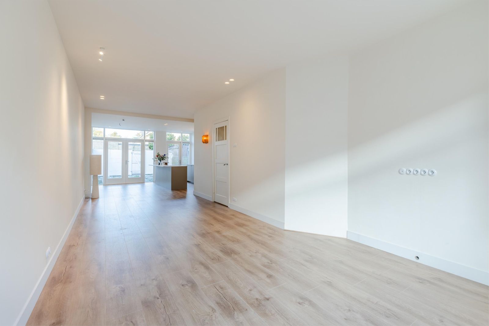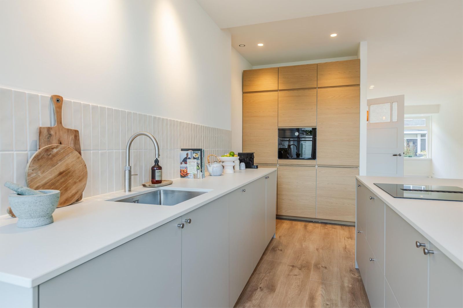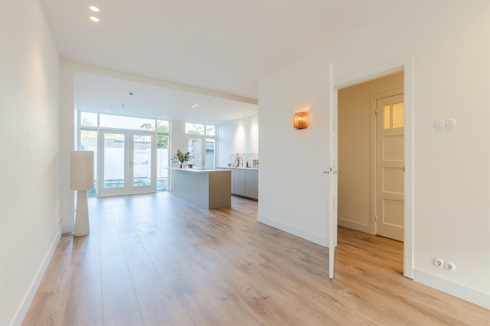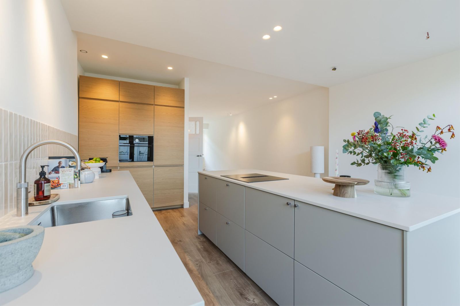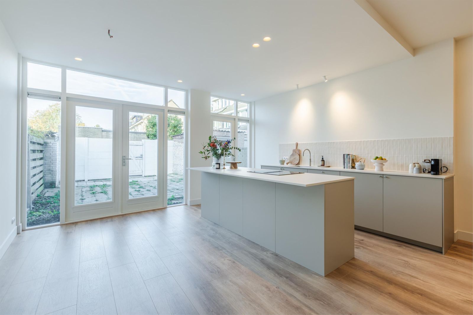 The house has a front garden and is entered through the characteristic front door. The entrance hall features original wall tiles, a stair cupboard, a toilet, and the possibility of creating a wardrobe. The hallway leads to the bright living room. The living room features smooth plasterwork, neutral flooring, and ceiling lights. The entire ground floor has underfloor heating. From the living room, you have access to the spacious kitchen with a cooking island (Dekton worktop) and is equipped with all modern built-in appliances. These include a Quooker, hob with integrated extractor fan, dishwasher with cutlery drawer, combination oven, and a fridge-freezer. There is ample storage space. The garden is accessible through French doors.