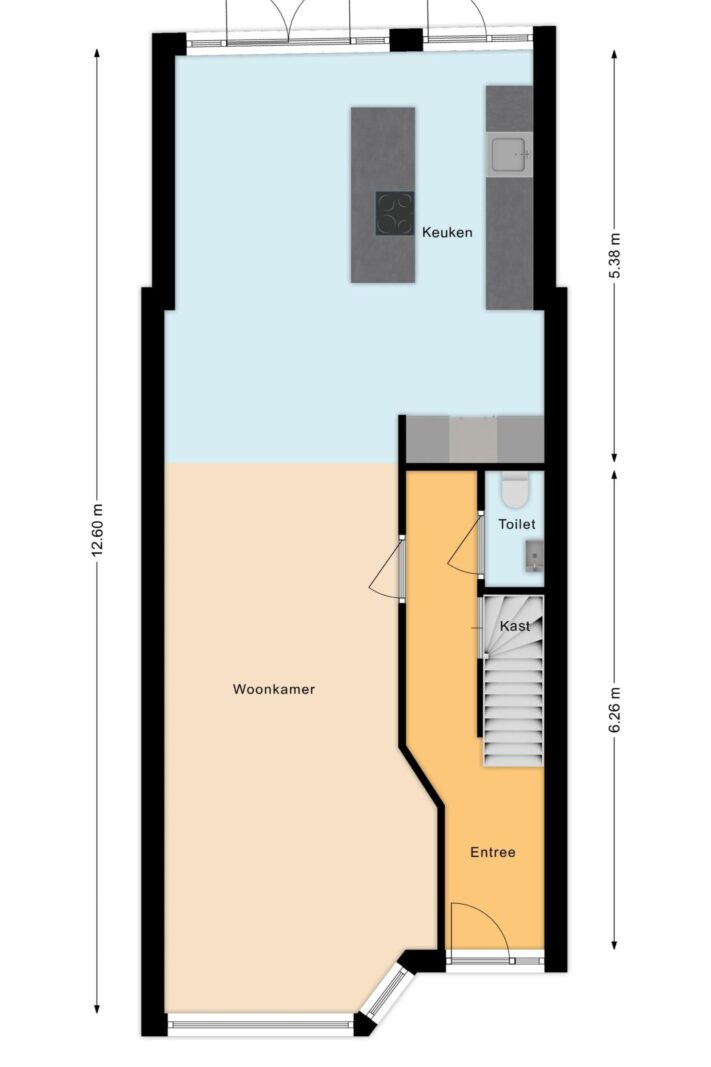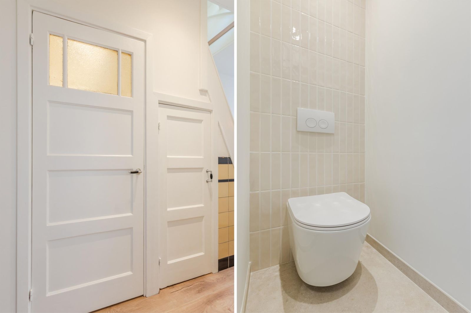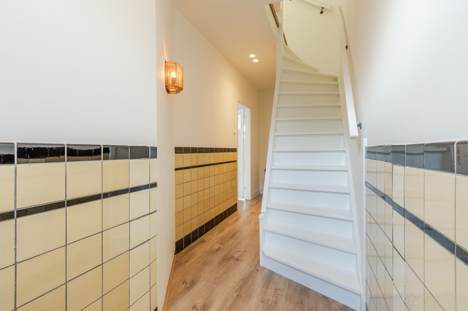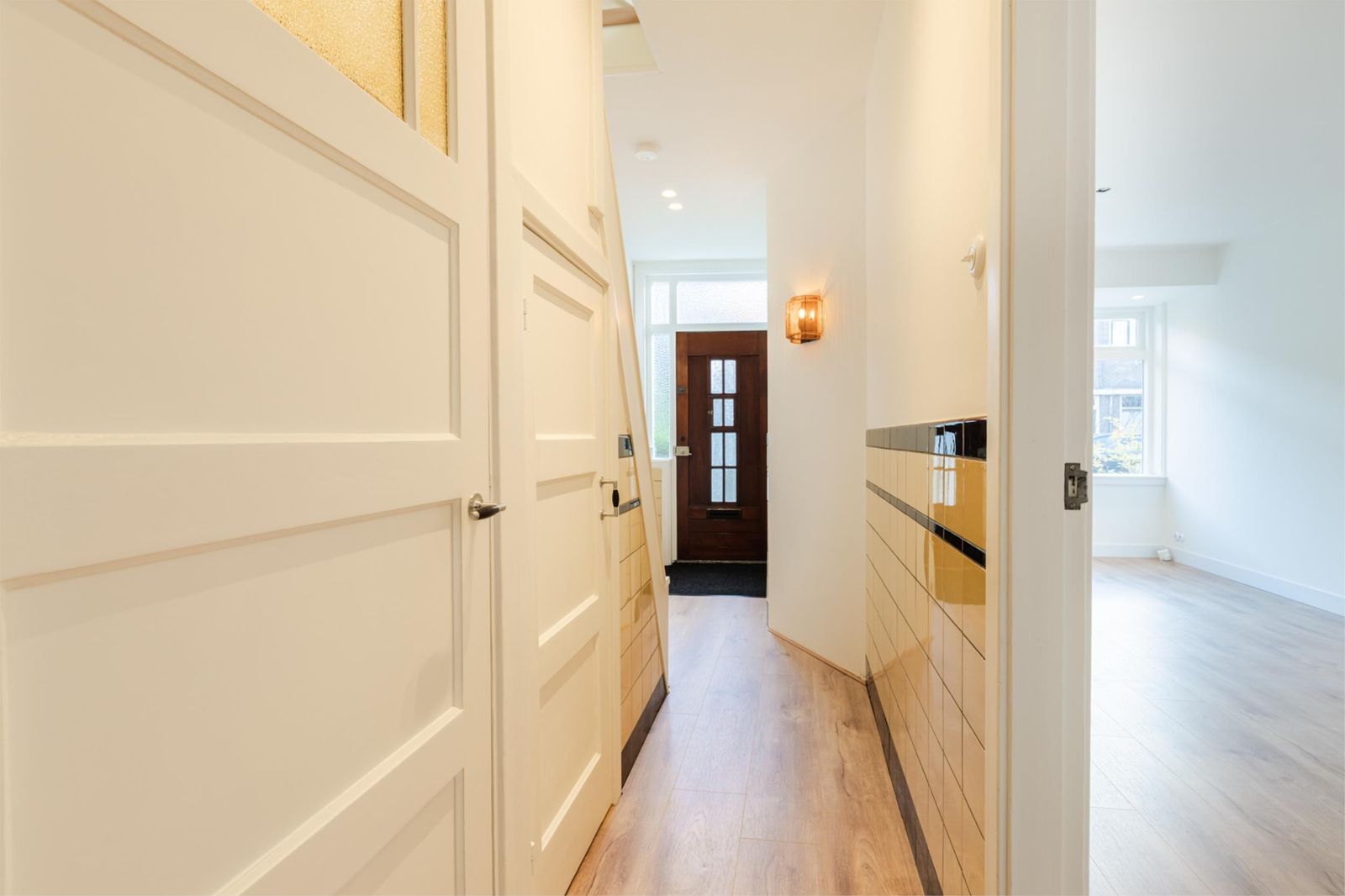 De woning heeft een voortuin en is te betreden via de karakteristieke voordeur. In de entree bevinden zich de originele wandtegels, een trapkast, toilet en mogelijkheid tot het realiseren van een garderobekast. Vanuit de hal is er toegang tot de lichte woonkamer. De woonkamer is voorzien van glad pleisterwerk, neutrale vloer en lichtarmaturen in het plafond. De gehele begane grond is voorzien van vloerverwarming. Vanuit de woonkamer heb je toegang naar de ruim opgezette keuken met kookeiland (Dekton werkblad) en is voorzien van allerlei moderne inbouwapparatuur; Quooker, kookplaat met ingebouwde afzuiging, vaatwasser met besteklade, combi oven en een koel-vries combinatie. Er is voldoende opbergruimte aanwezig. De tuin is bereikbaar via de openslaande deuren.