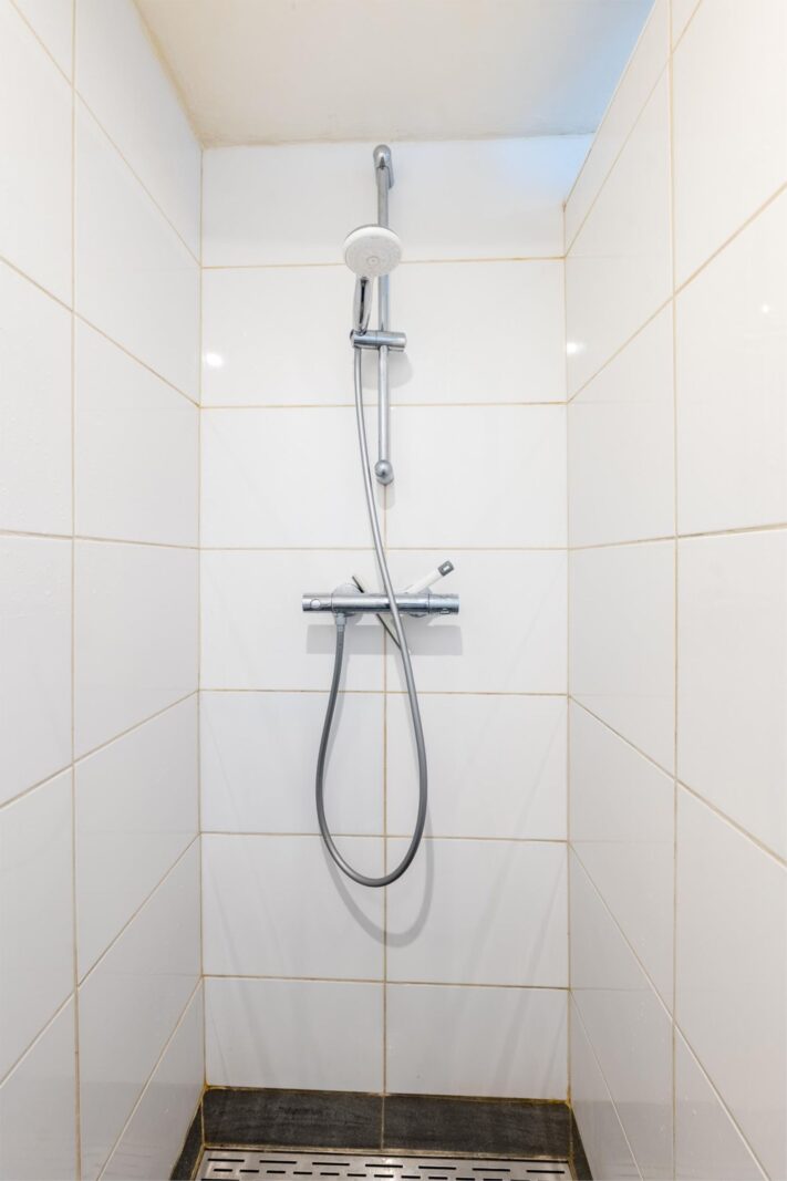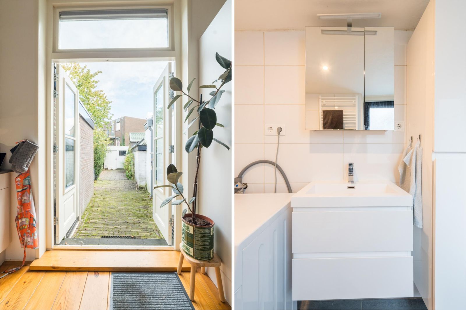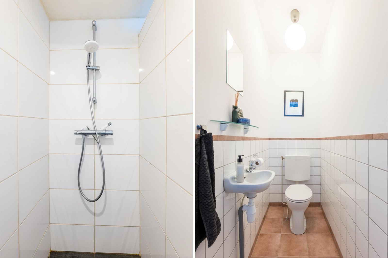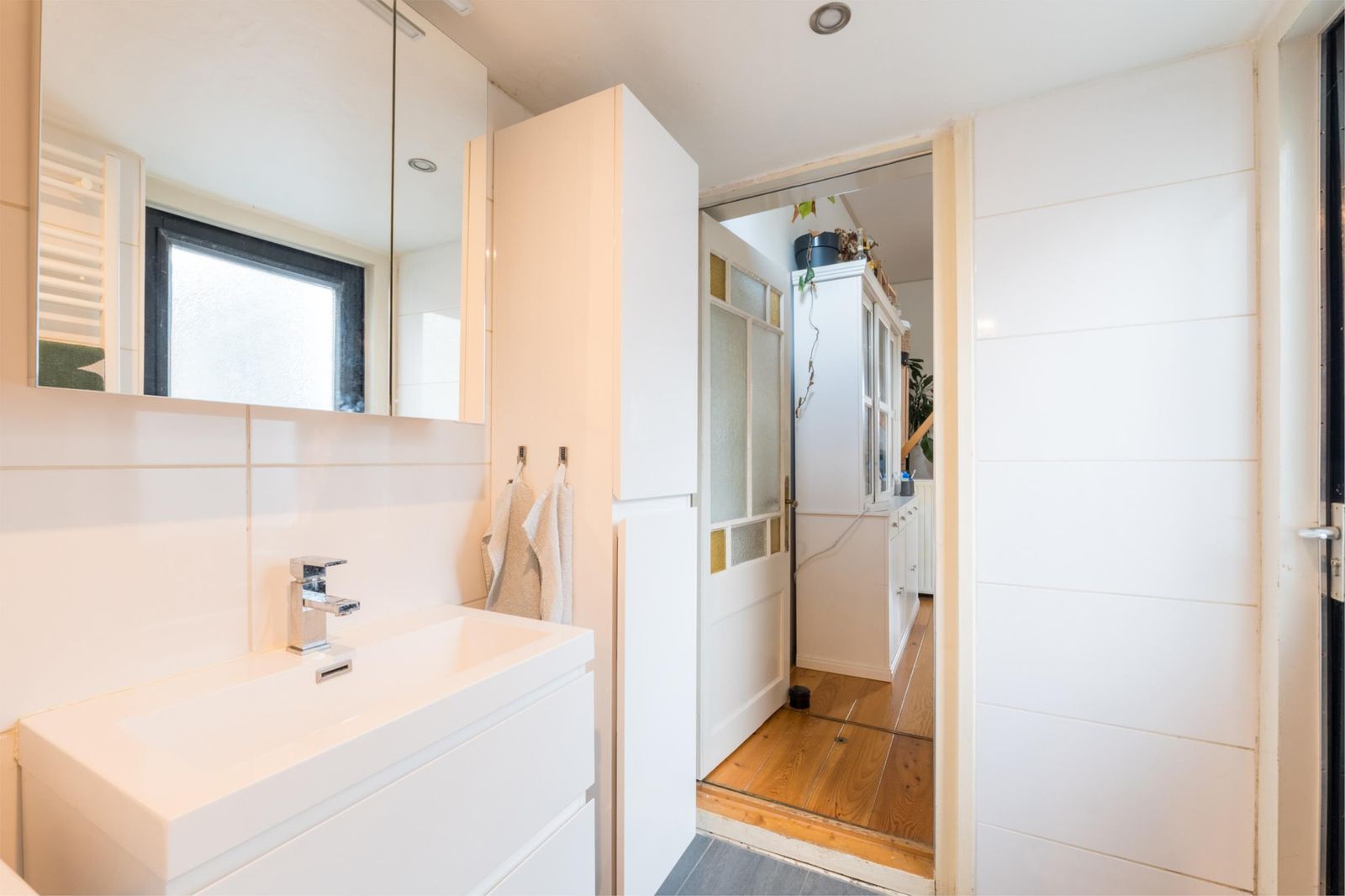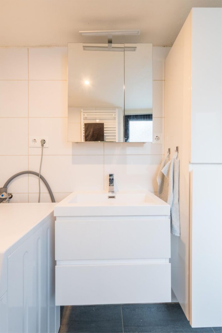 Vanuit de keuken is er een deur die toegang geeft tot de eind 2021 geheel gerenoveerde badkamer. De badkamer is voorzien van een douche, handdoekradiator, een wastafelmeubel en een opstelplaats voor de wasmachine en droger. De electriciën heeft hier in 2021 tegelijk met de nieuwe meterkast afzonderlijke stoppengroepen voor aangelegd.