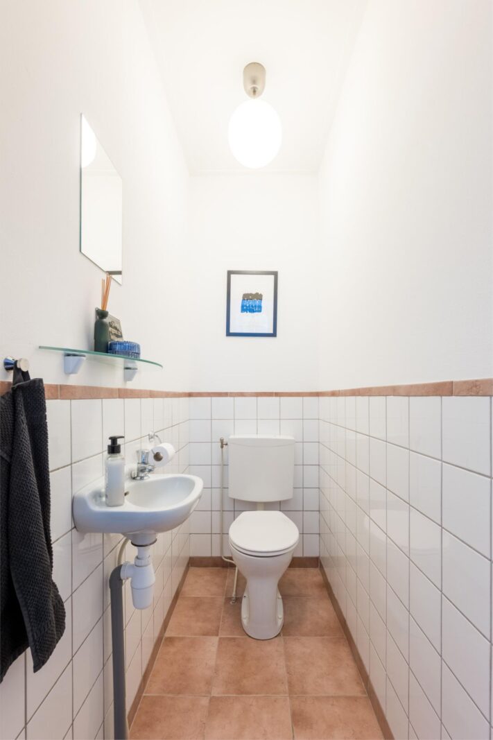 Bij de voordeur begint het al goed: aanbellen doe je hier met een originele trekbel. Via de entree met bovenlicht kom je in de verwarmde hal, die toegang geeft tot het nette toilet met fontein.