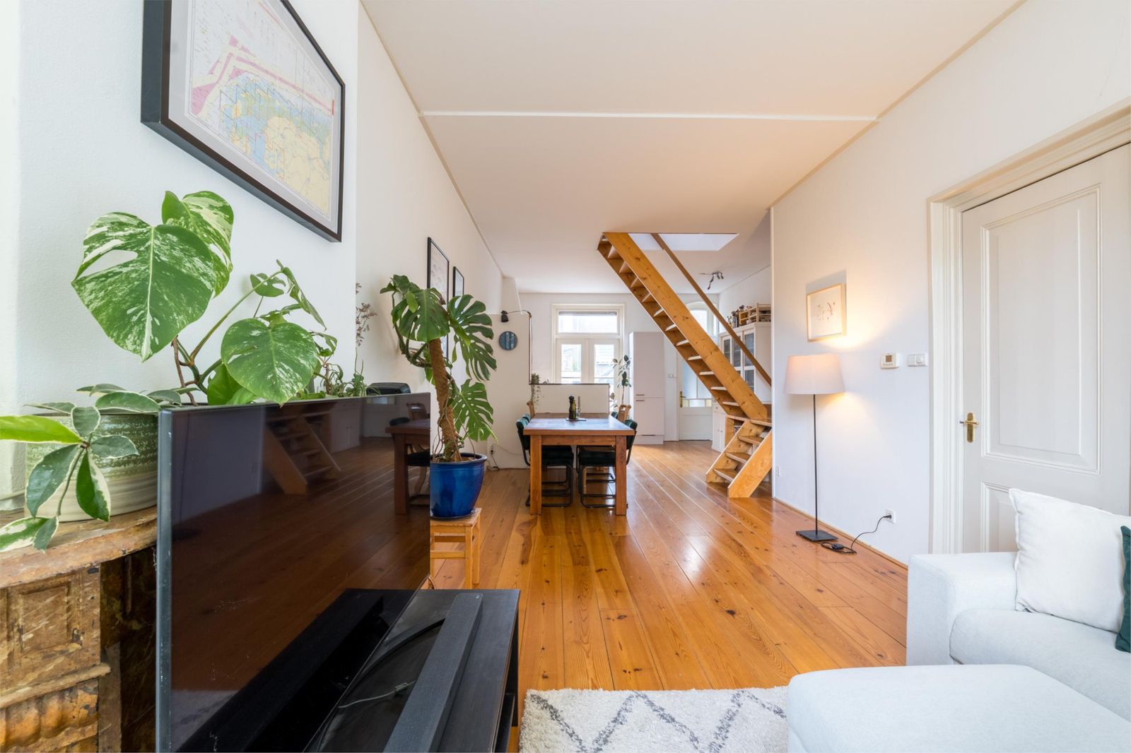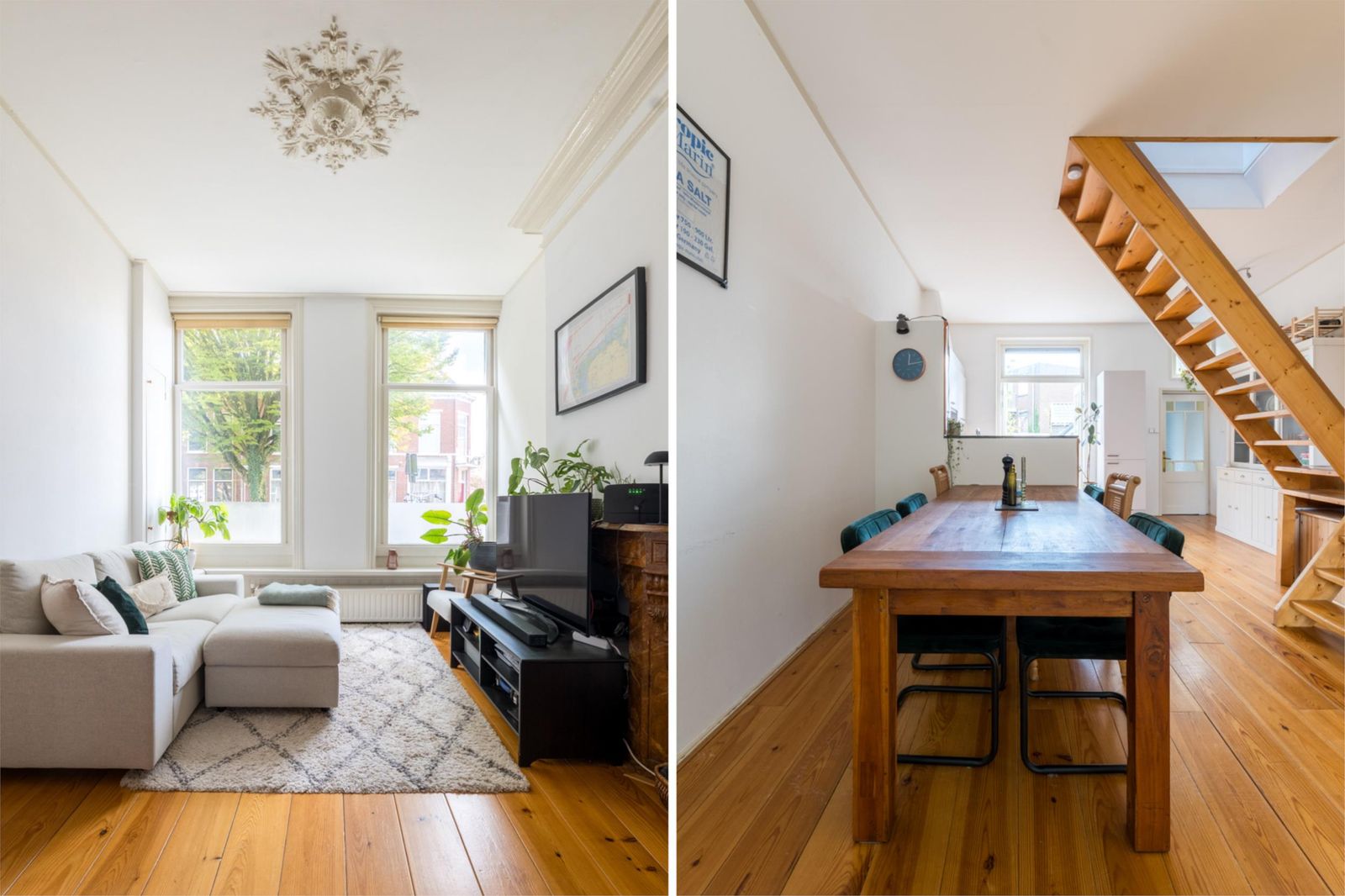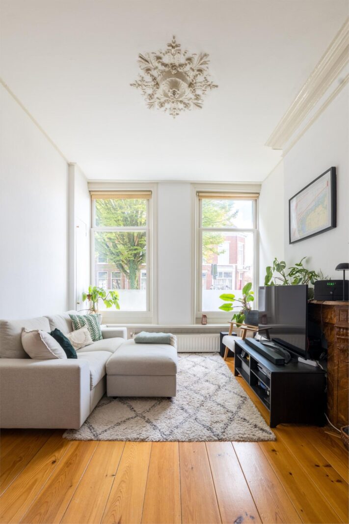 Vanuit de hal is ook de ruime woonkamer (39 m2) bereikbaar. Een prettige ruimte, dankzij de meer dan 3 meter hoge plafonds en de grote raampartijen aan de voorzijde. De woonkamer is extra gezellig dankzij de paneeldeur, authentiek plafond-ornament en schouw met schoorsteen en plek voor een kachel. De houten vloer past hier natuurlijk perfect bij en versterkt de woonsfeer.