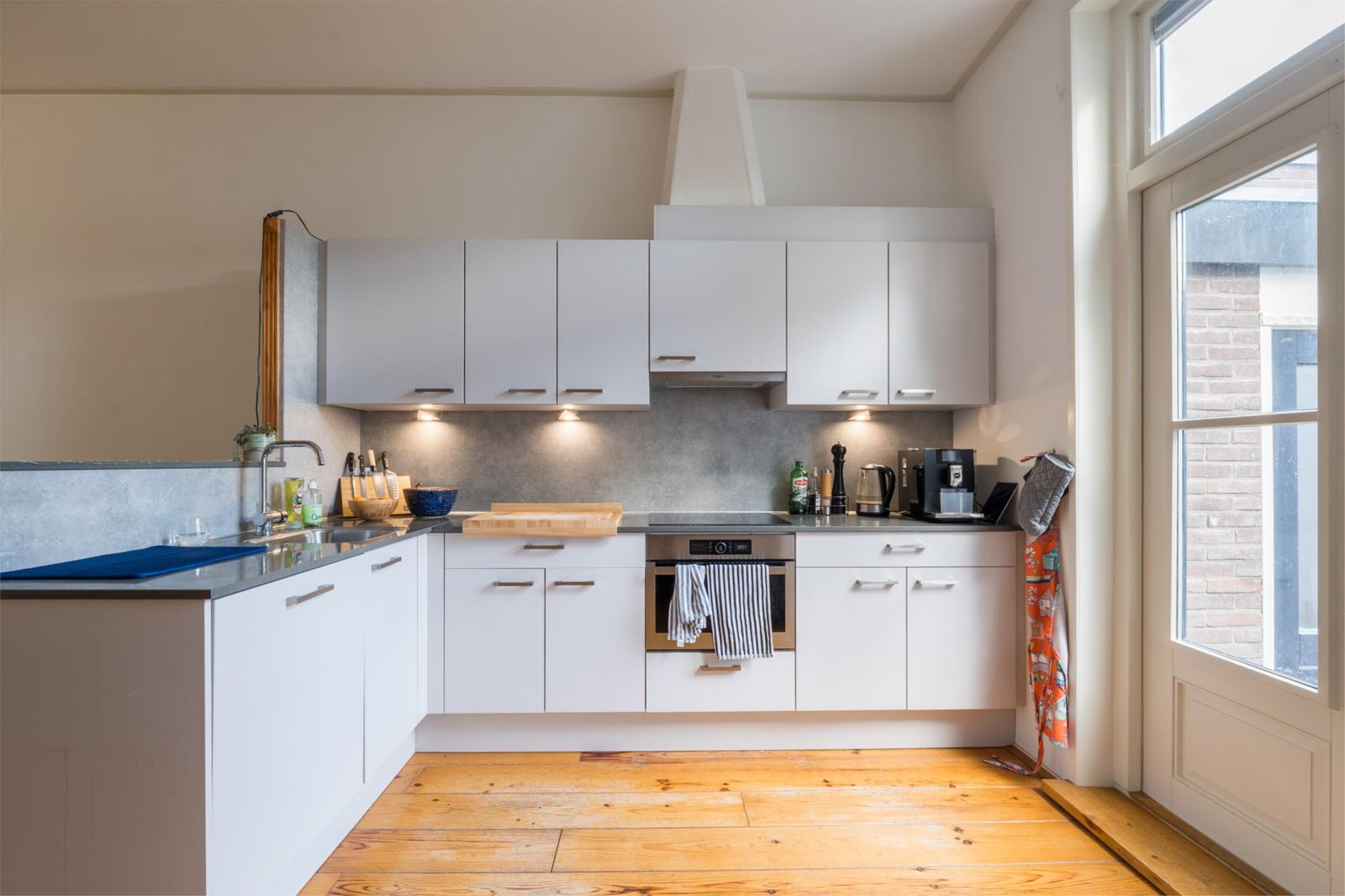 Vanuit de keuken (uit 2022) zijn er openslaande deuren naar de diepe en zonnige achtertuin, zodat je het hele jaar door kunt genieten van een fijne verbinding tussen binnen en buiten. Achterin de tuin is de voormelde ruime schuur.