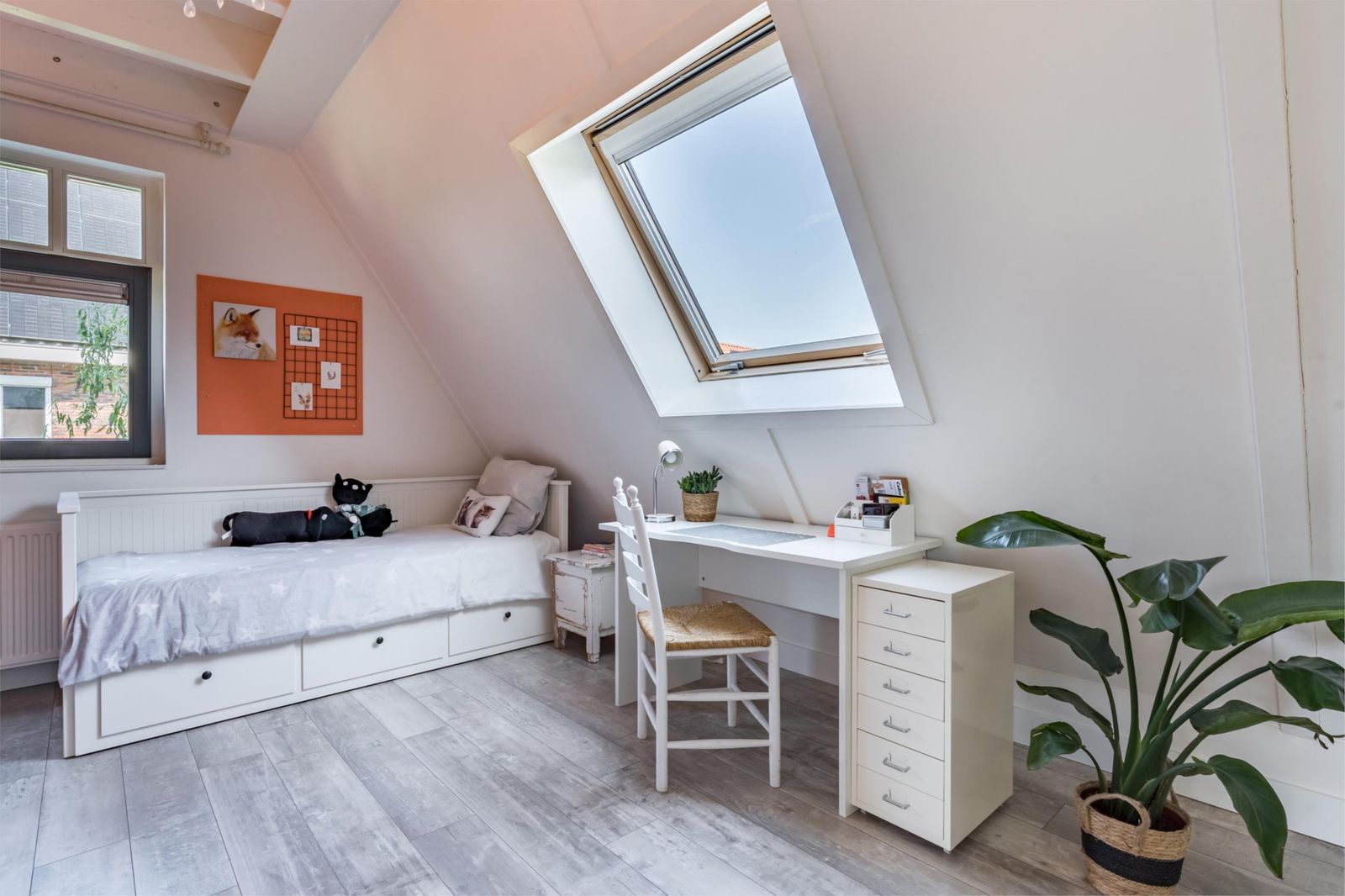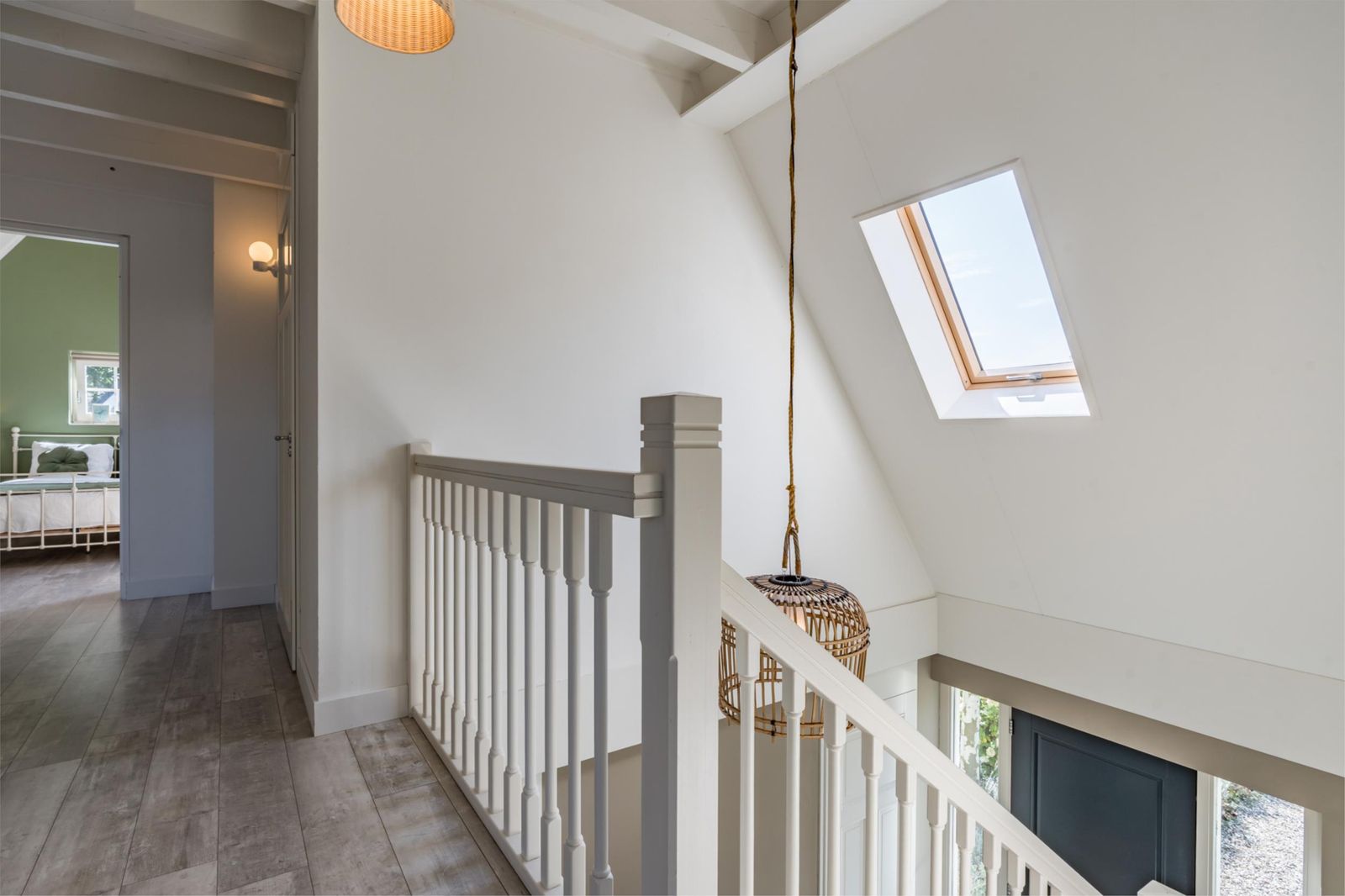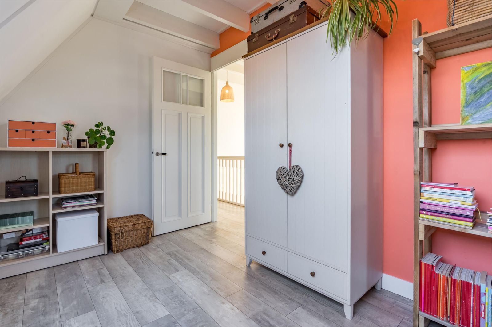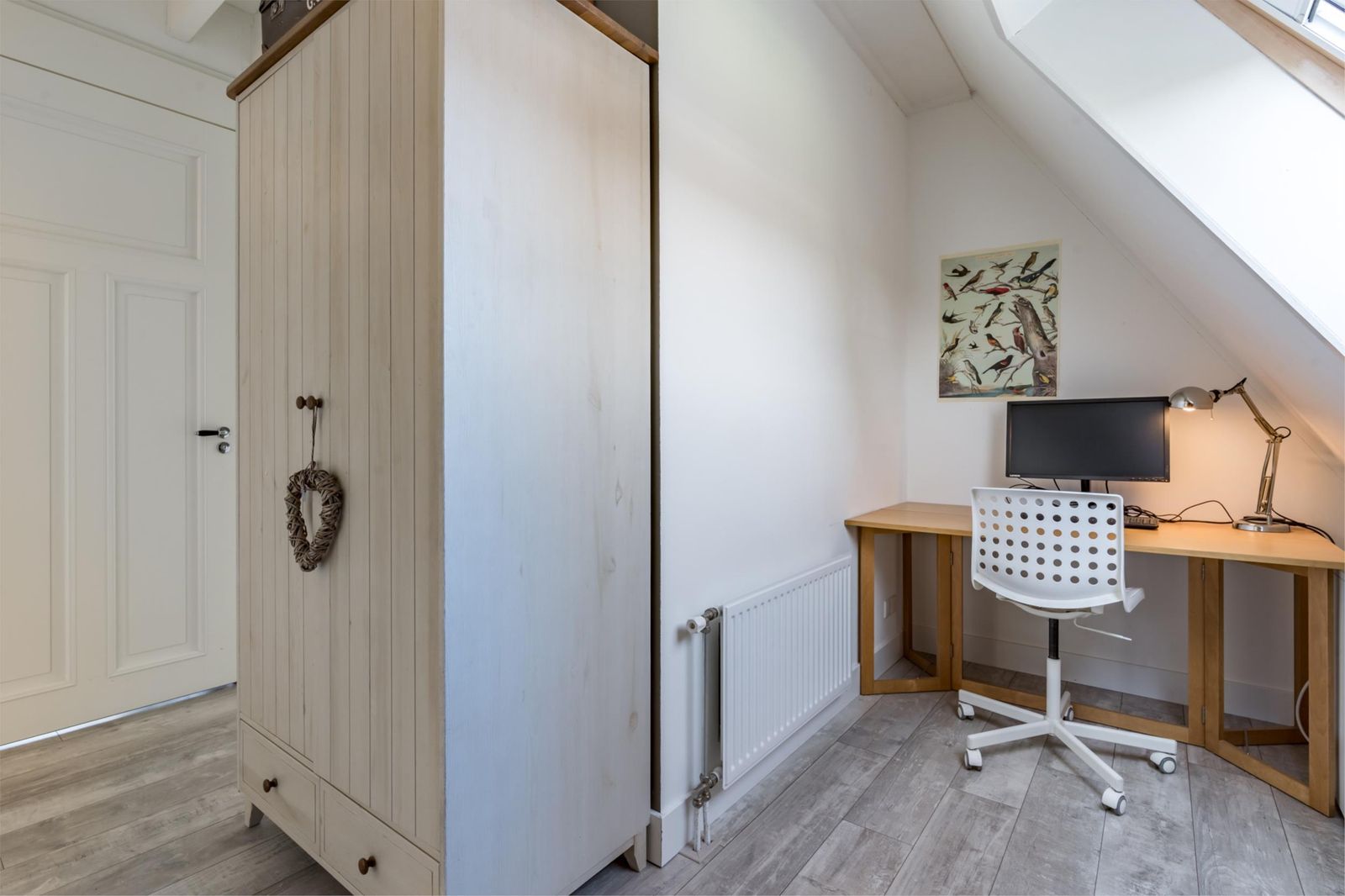 De werkruimte heeft een open verbinding met de overloop en heeft een groot dakraam. Onder de trap is nog een handige kastruimte voorzien van legplanken.