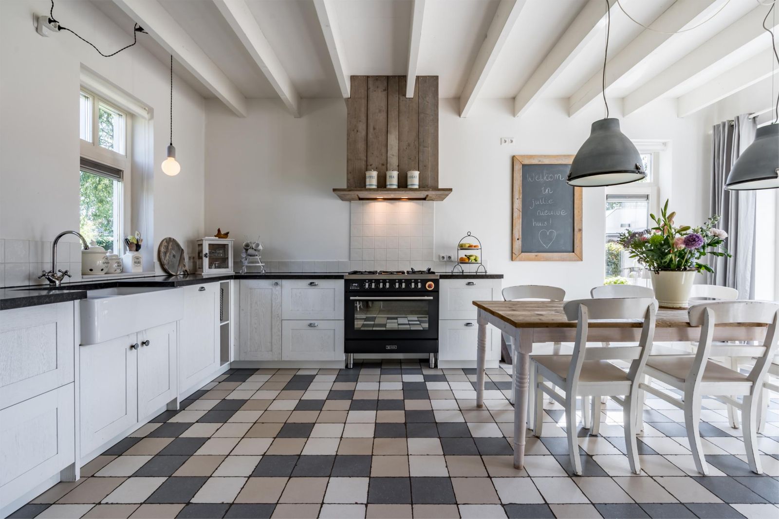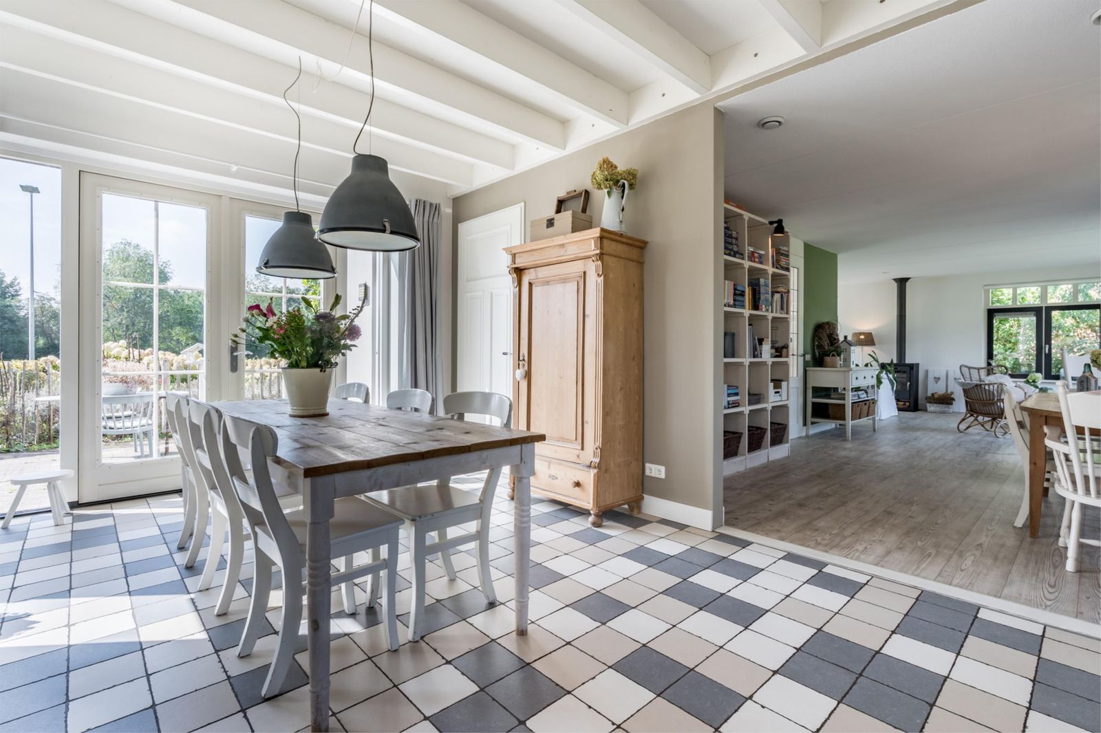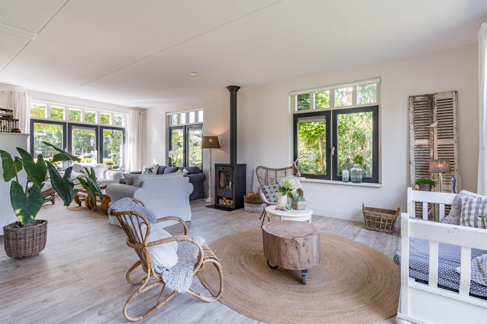 We komen nu in de ruime woonkamer die veel daglicht heeft, wat een mooi ruimtelijk effect geeft. Hier staat de houtkachel die in de koudere periode zorgt voor warmte en sfeer in huis. Vanuit de woonkamer is er een open verbinding met de woonkeuken. In de keuken is plaats voor een grote eettafel en heb je een mooi uitzicht op de tuin en de weilanden. De keuken is voorzien van een groot fornuis met oven, een koel/ vries combinatie, een afzuigkap en een close-in boiler.