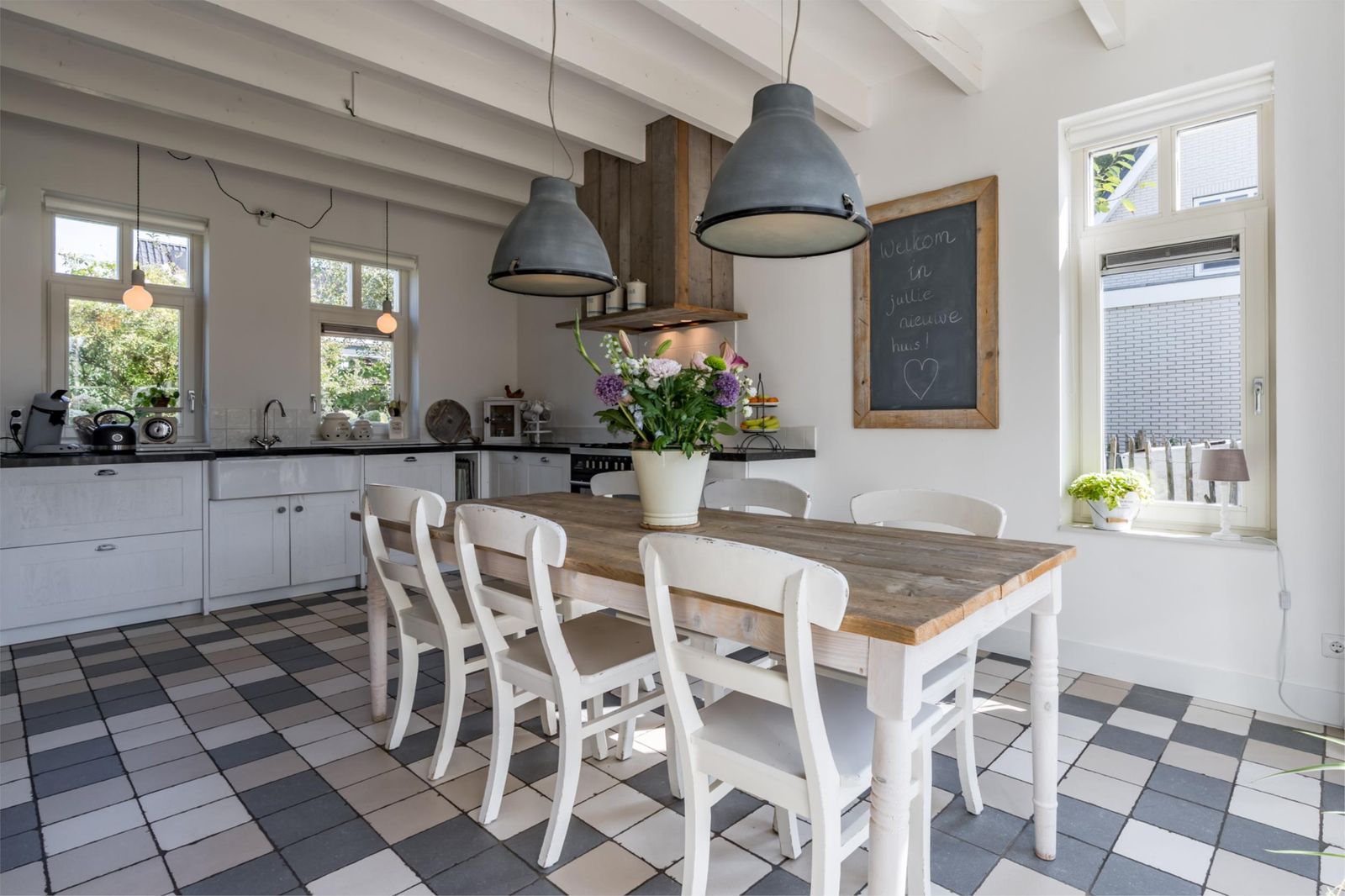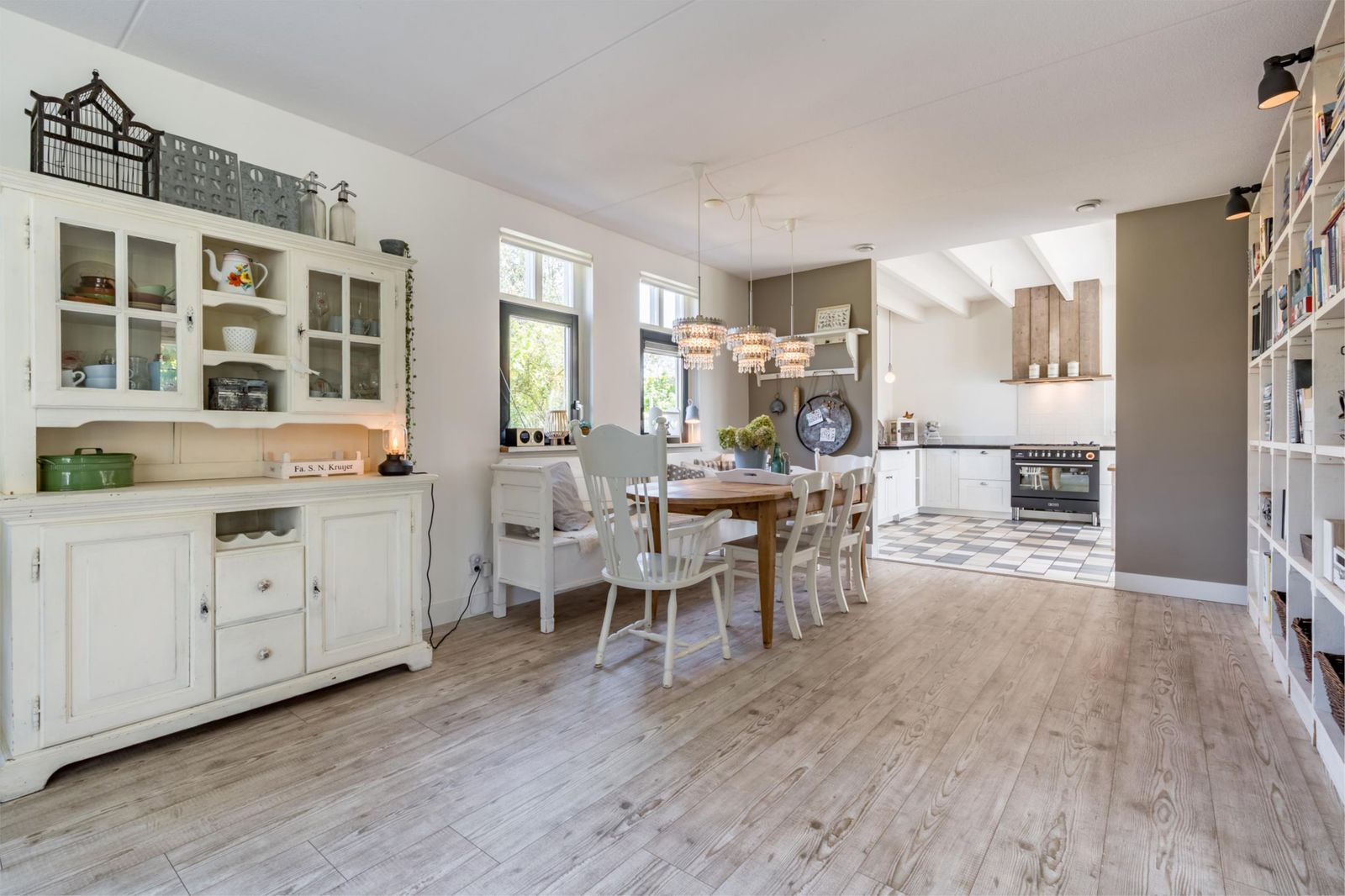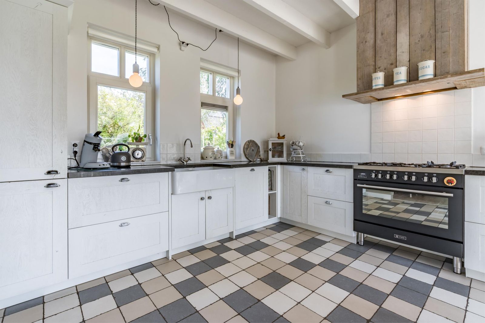 We komen nu in de ruime woonkamer die veel daglicht heeft, wat een mooi ruimtelijk effect geeft. Hier staat de houtkachel die in de koudere periode zorgt voor warmte en sfeer in huis. Vanuit de woonkamer is er een open verbinding met de woonkeuken. In de keuken is plaats voor een grote eettafel en heb je een mooi uitzicht op de tuin en de weilanden. De keuken is voorzien van een groot fornuis met oven, een koel/ vries combinatie, een afzuigkap en een close-in boiler.