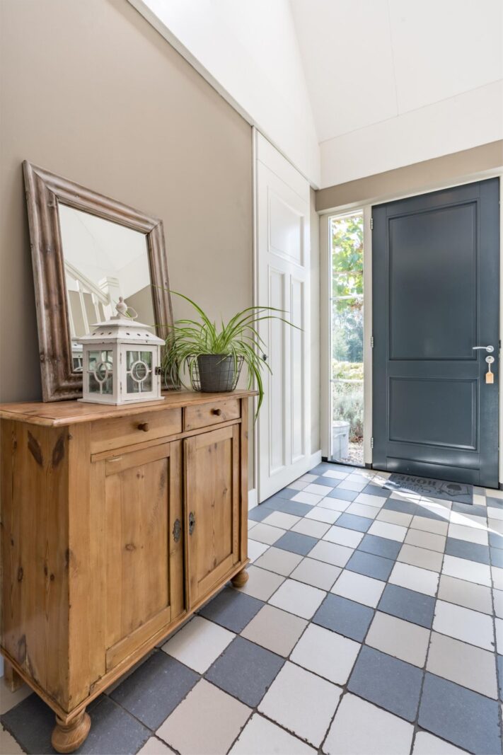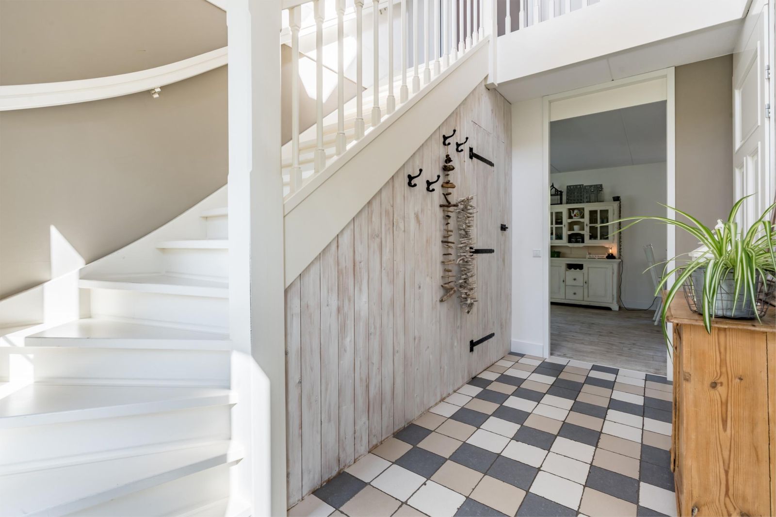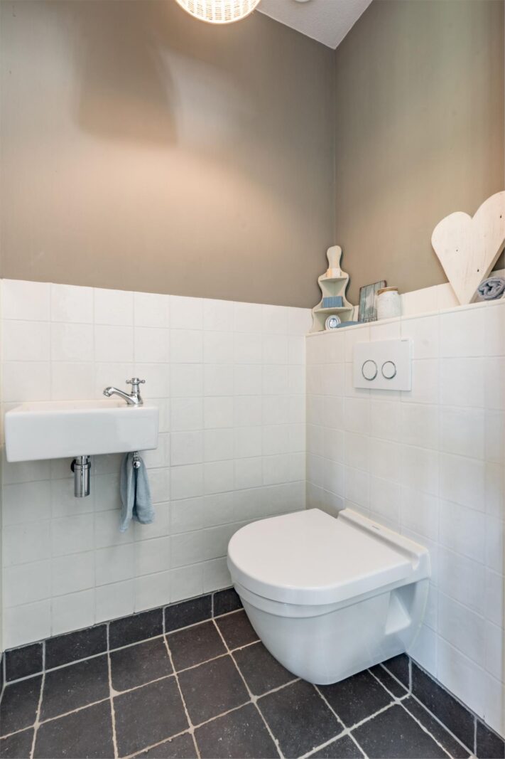 Via de voordeur komen we in de hal/ vide die veel daglicht heeft, waar de trap naar de bovenverdieping, de meterkast en het toilet gesitueerd zijn. Onder de trap bevindt zich een grote praktische voorraadkast met legplanken. De toiletruimte is voorzien van een vrijdragend toilet en fonteintje. De meterkast is uitgerust met voldoende electragroepen en er is ook glasvezel aanwezig. Vanuit de meterkast kan de buitenkraan worden afgesloten wat handig is tijdens de winterperiode.