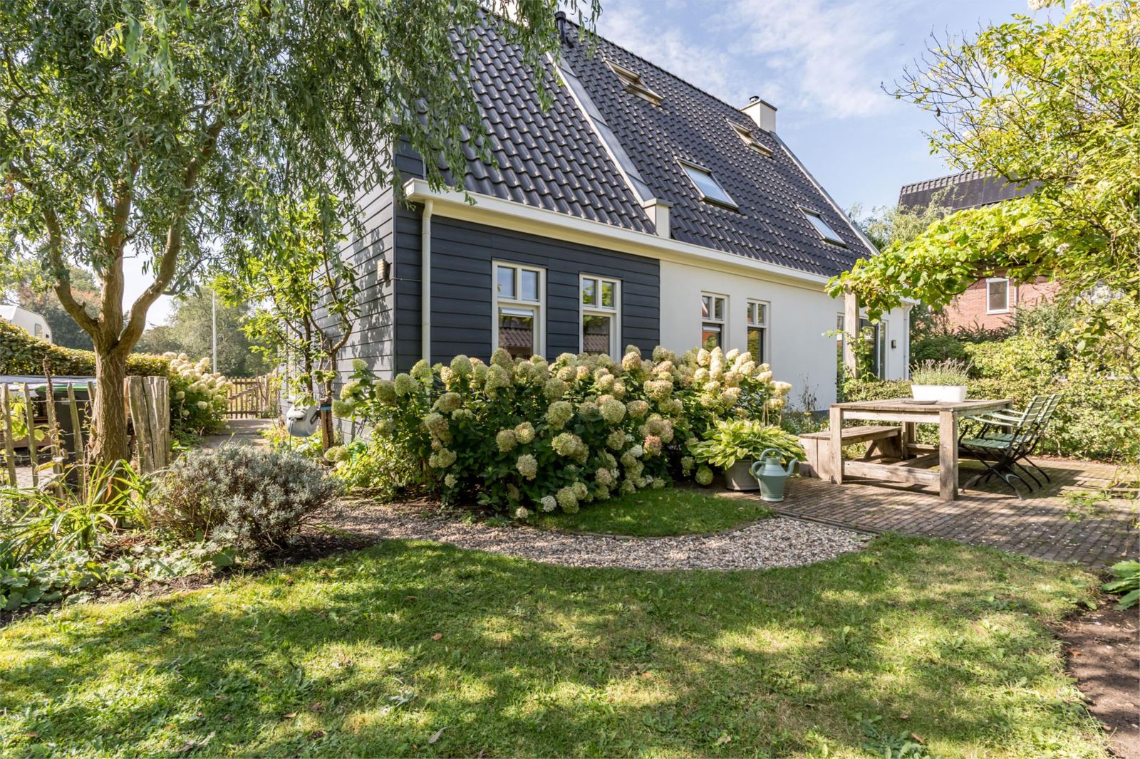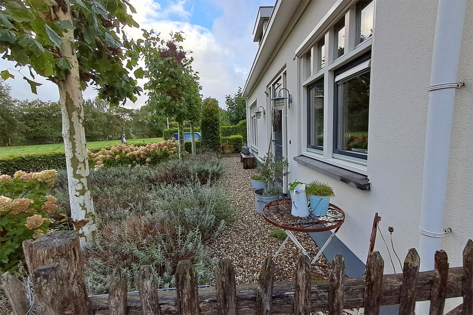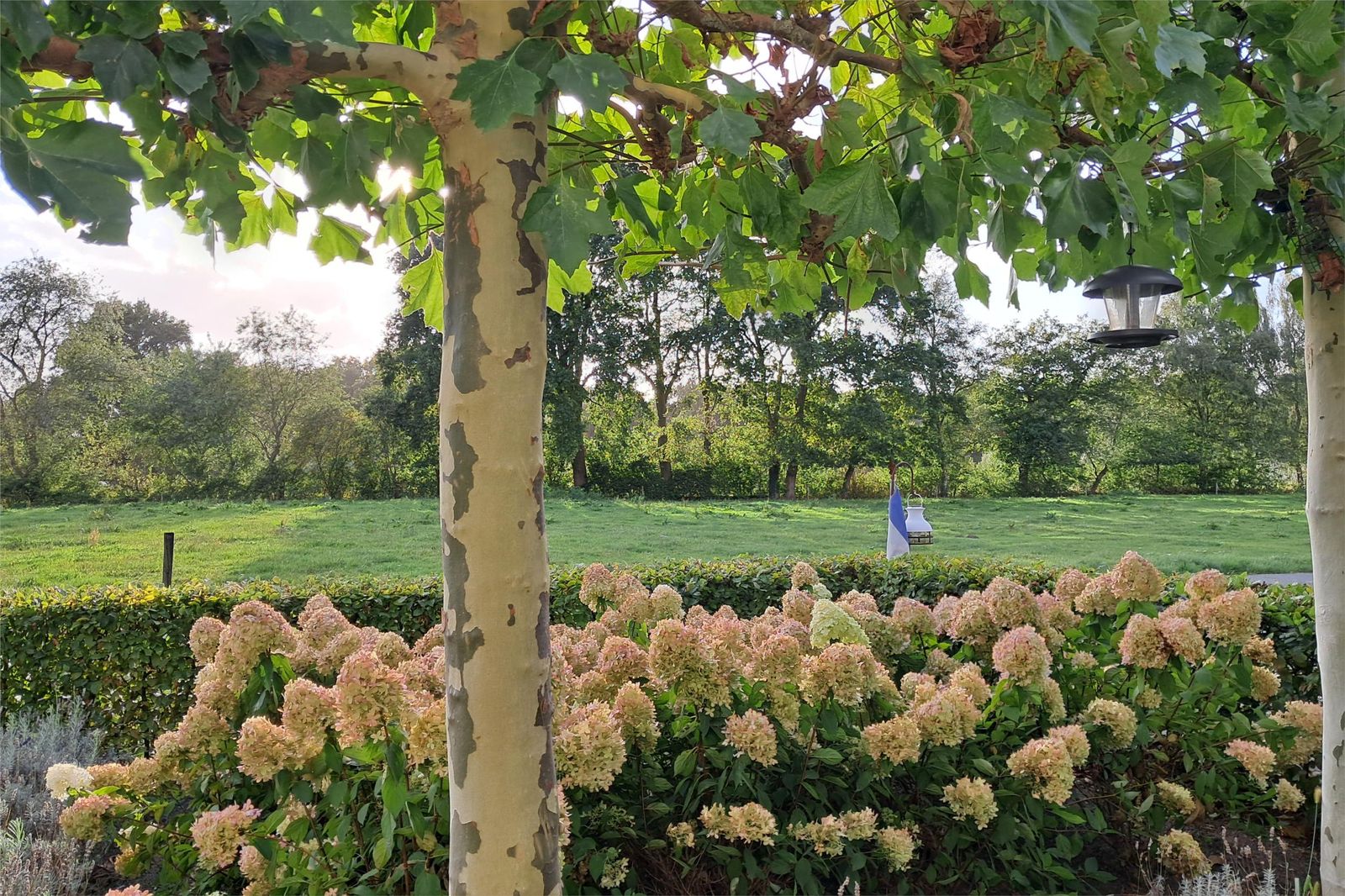 De grote tuin is omgeven door een beukenhaag en fraai Frans hekwerk wat voor een landelijke sfeer zorgt. De voortuin met grote leibomen en de prachtige beplanting passen goed bij de uitstraling van de woning. De leibomen zorgen in de zomer eveneens voor het koel houden van de woning. Voor de keuken bevindt zich een terras waar je geniet van het buitenleven met uitzicht over de weilanden waar de koeien staan te grazen.