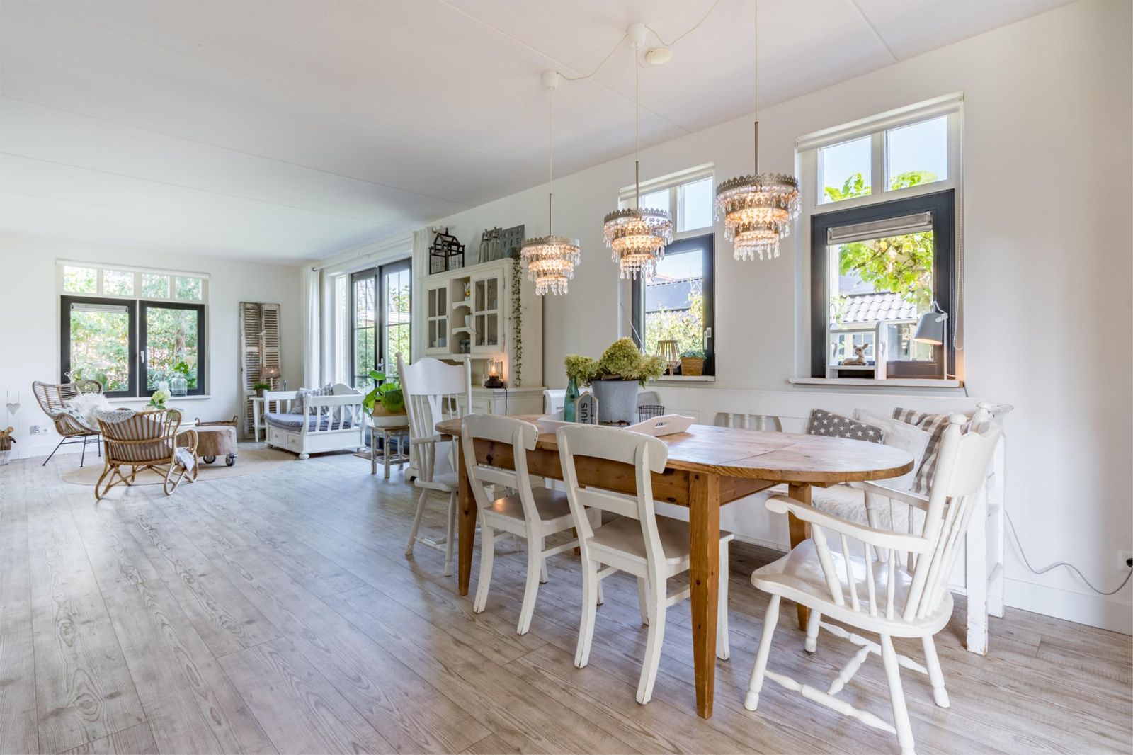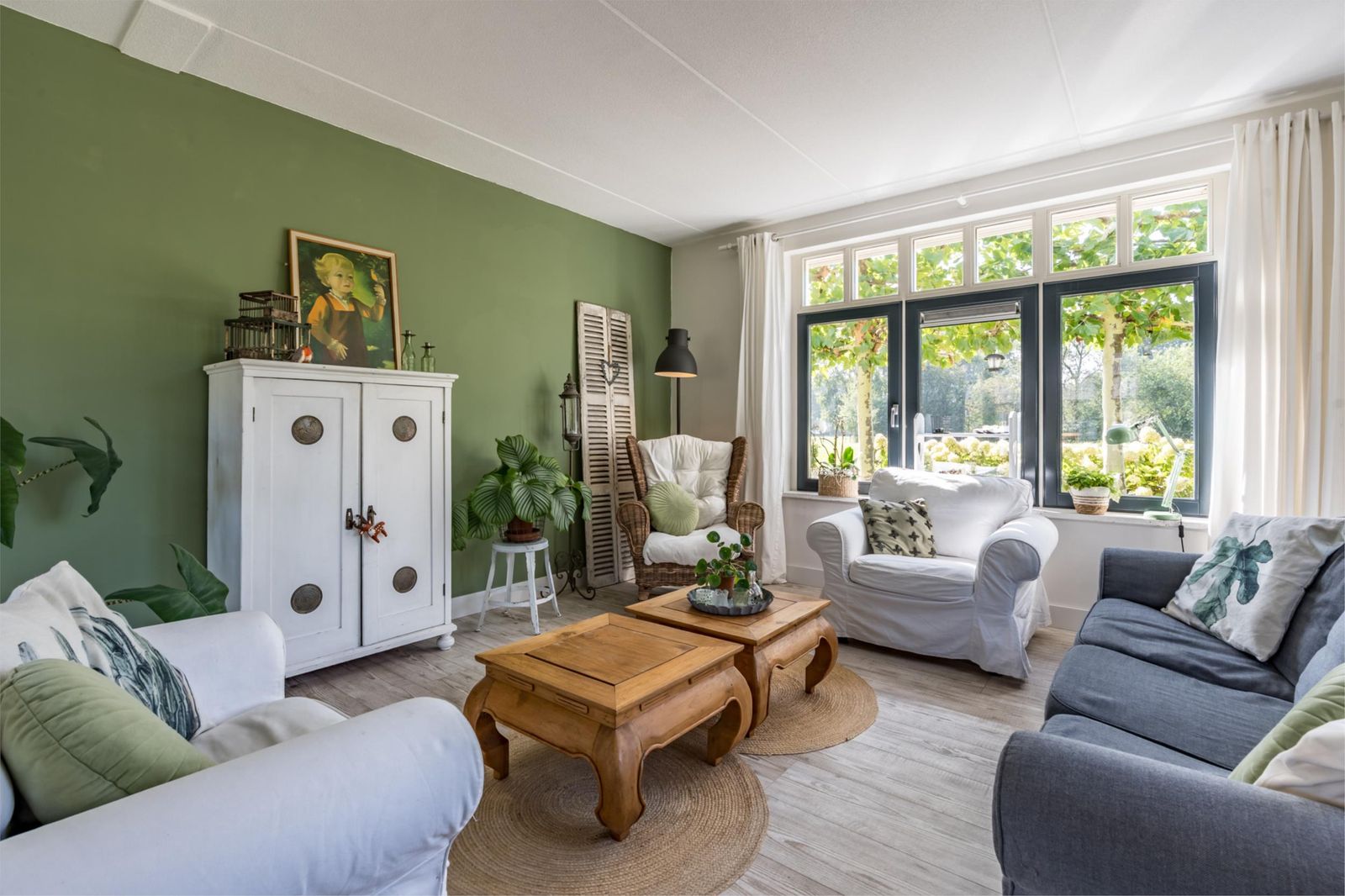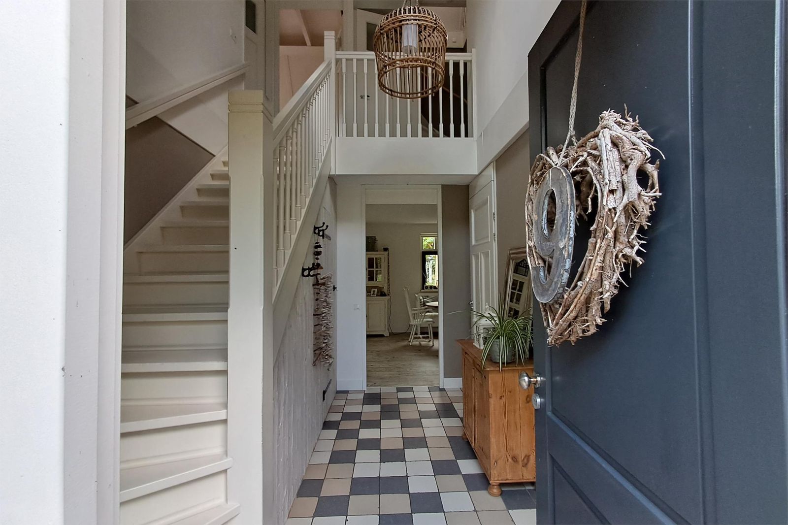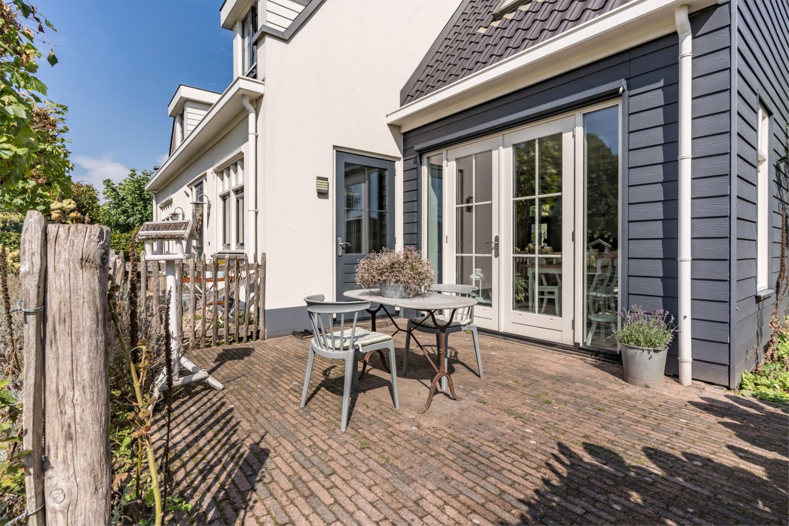 De grote tuin is omgeven door een beukenhaag en fraai Frans hekwerk wat voor een landelijke sfeer zorgt. De voortuin met grote leibomen en de prachtige beplanting passen goed bij de uitstraling van de woning. De leibomen zorgen in de zomer eveneens voor het koel houden van de woning. Voor de keuken bevindt zich een terras waar je geniet van het buitenleven met uitzicht over de weilanden waar de koeien staan te grazen.