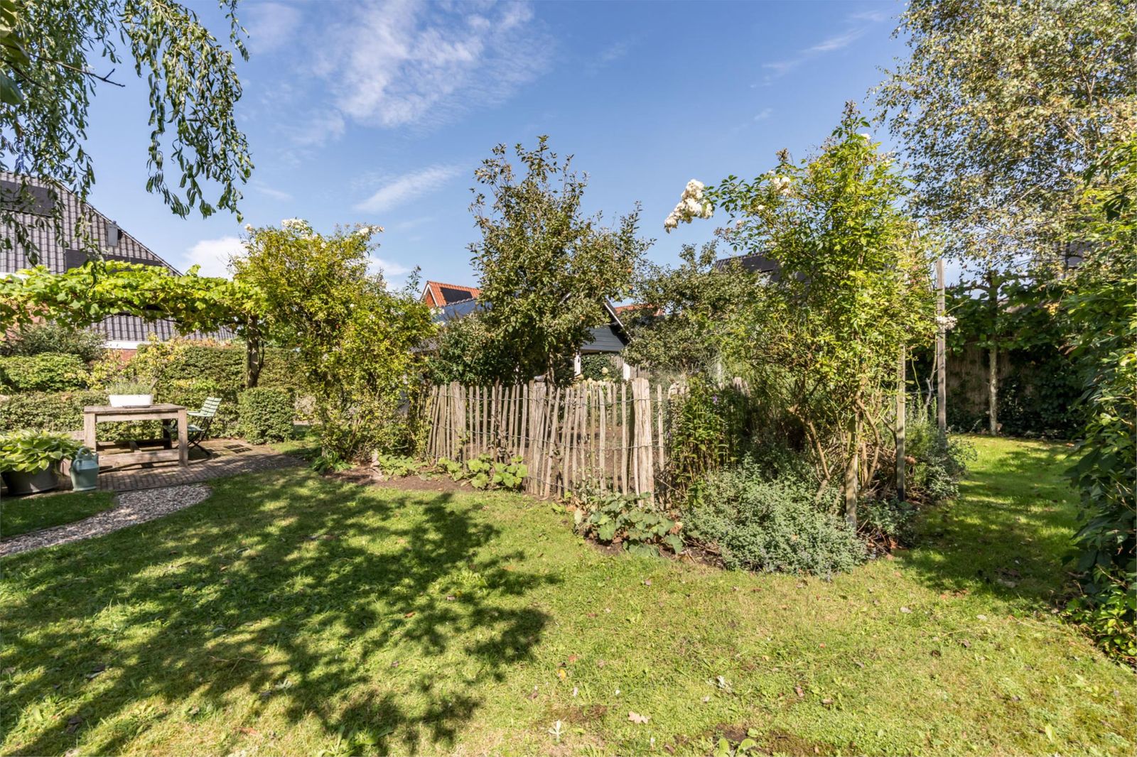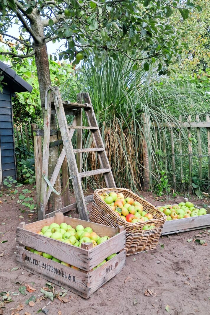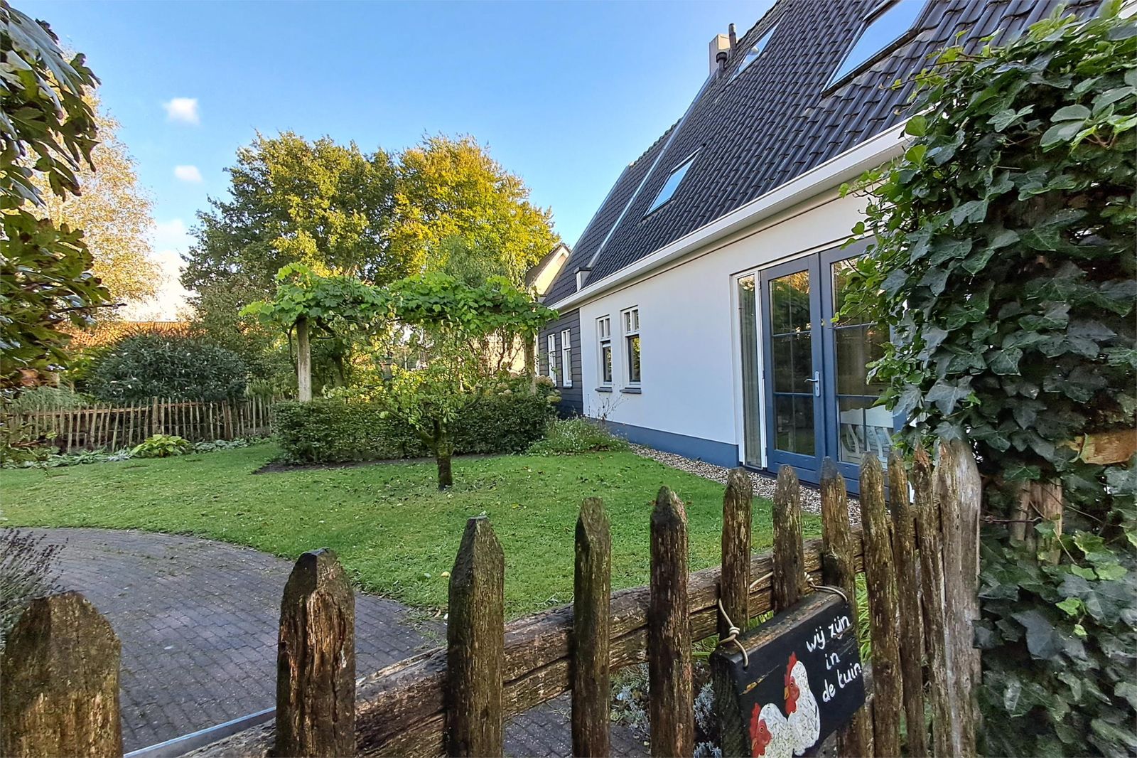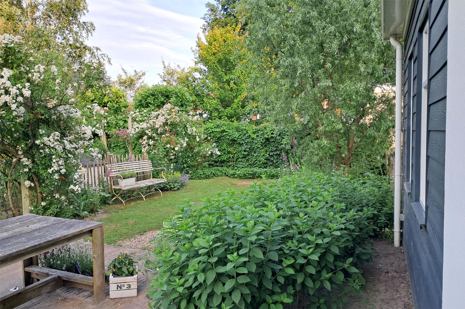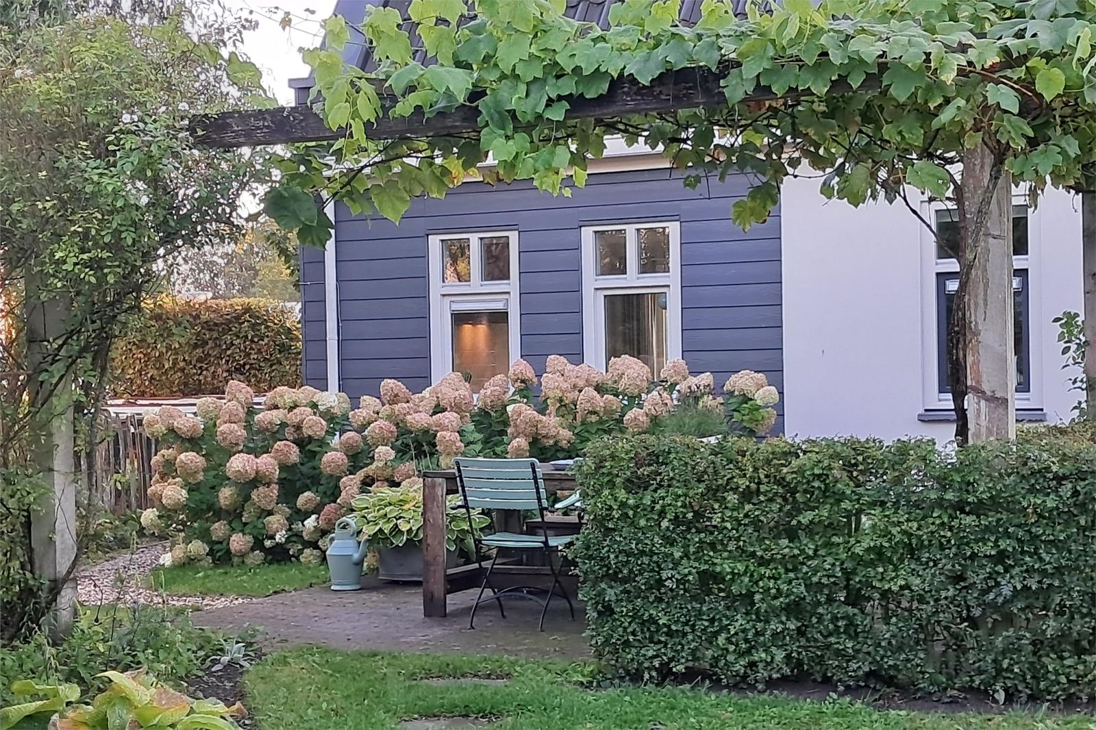 De gehele achtertuin is sfeervol opgezet met tuinkamers en heeft borders met vele bloemen. Dit zorgt voor vele vlinders, bijen, vogels en zelfs een egeltje in de tuin. De kippetjes scharrelen heerlijk rond tussen de appelbomen en daar staat ook hun kippenhok.