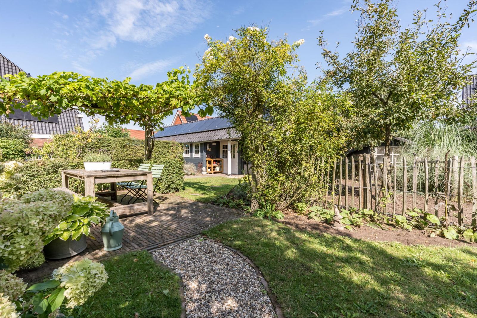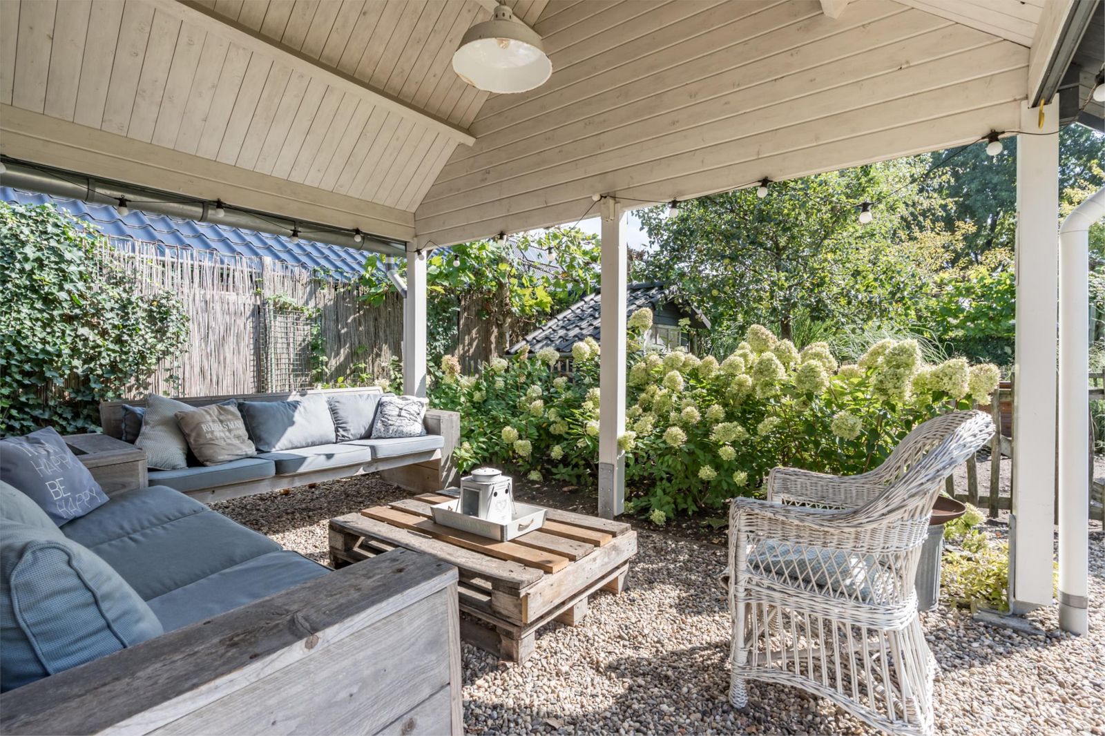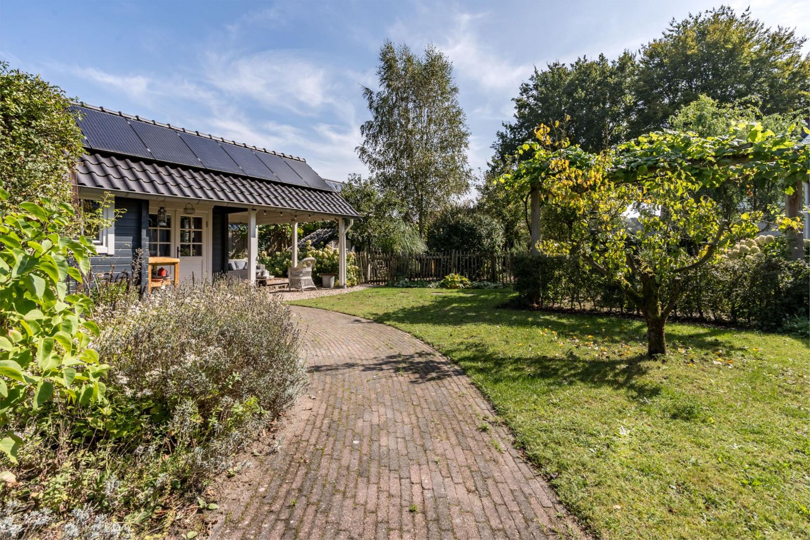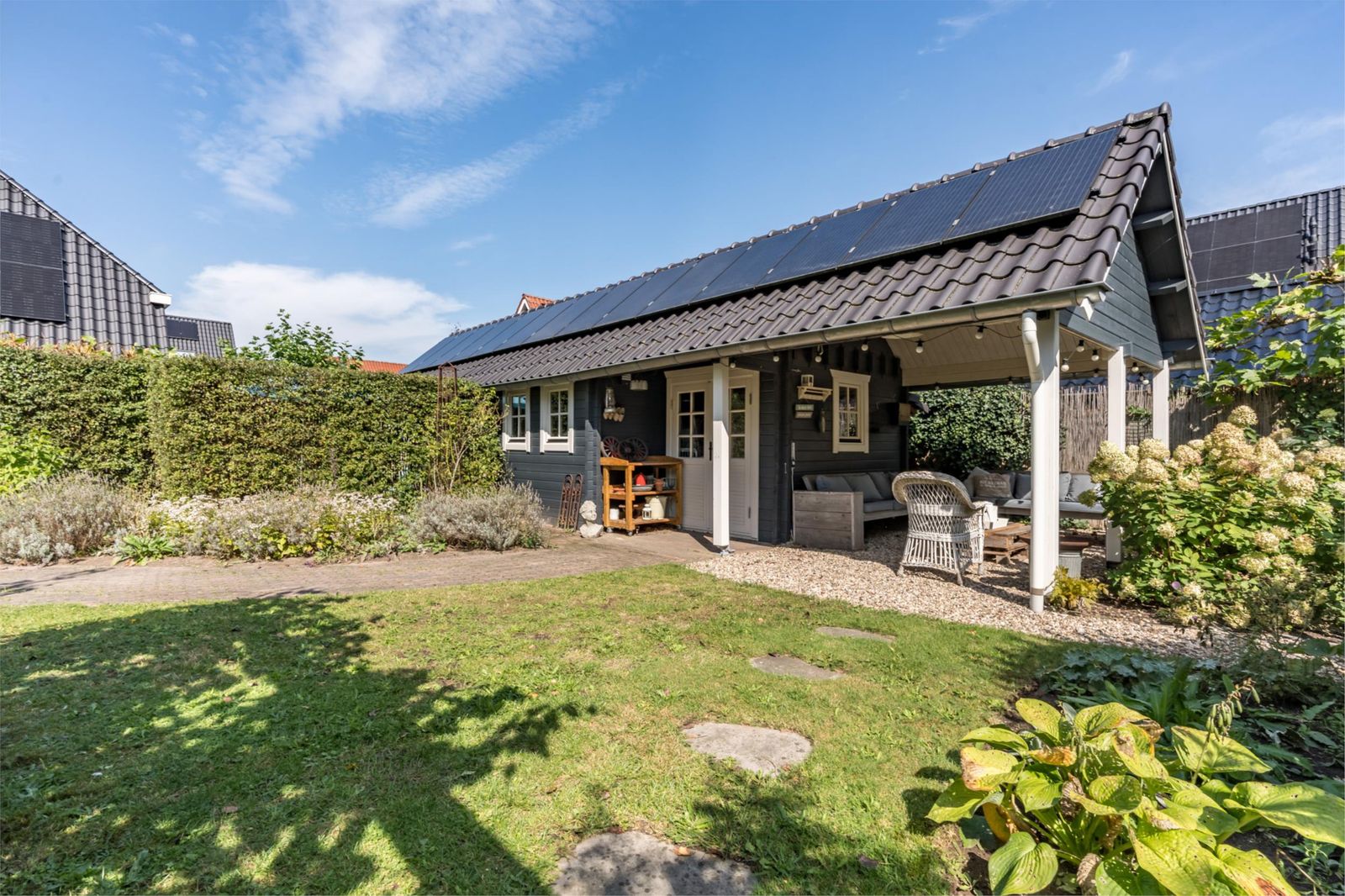Achterin de tuin staat een groot vrijstaand houten bijgebouw voorzien van 14 zonnepanelen. In het bijgebouw vind je aan de rechterzijde de schuur met een ruime bergzolder en kun je vanuit de gezellige, ruime veranda genieten van de tuin met veel privacy.
